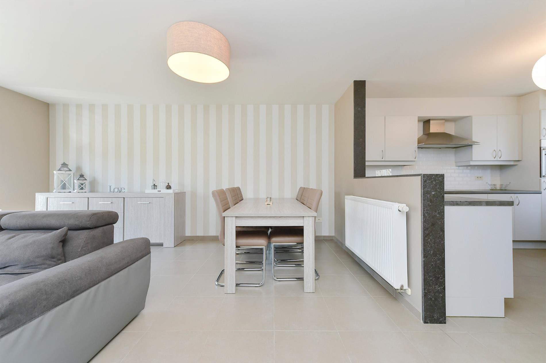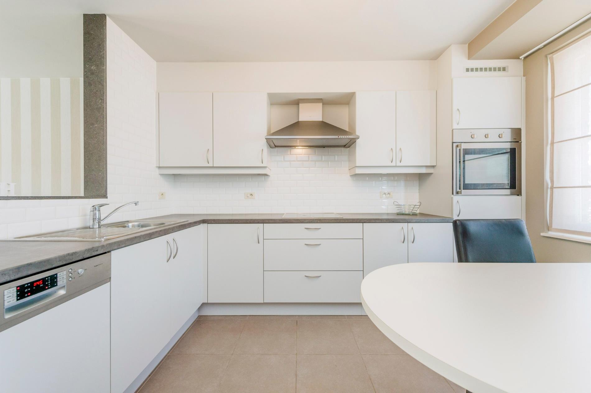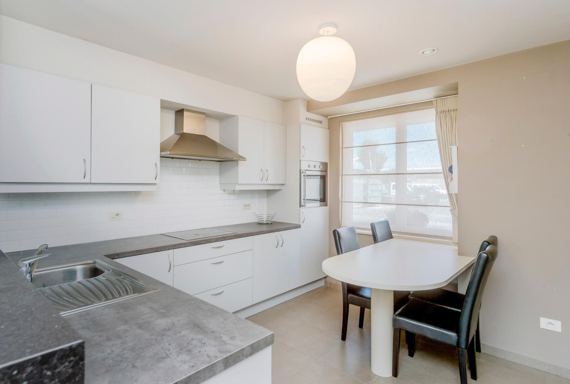 De keuken is voorzien van een aangebouwde tafel met plaats voor 4 personen. Alsook is er een dubbele spoelbak, vaatwasser, oven en frigo. Tevens is er een berging voorzien alsook zeer ruime garage/wasplaats.