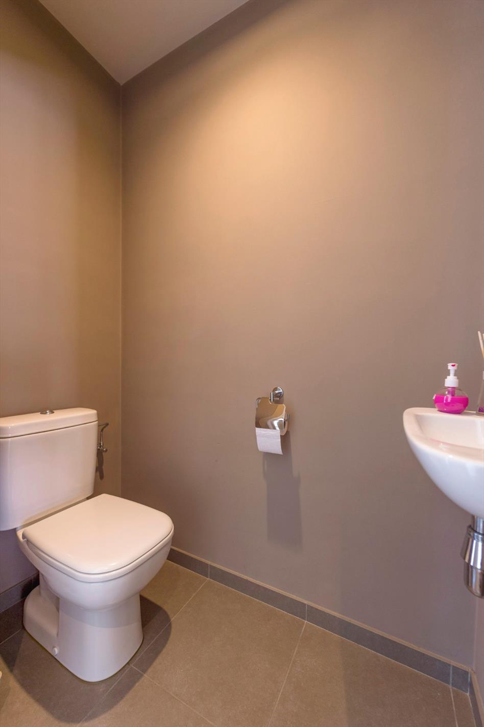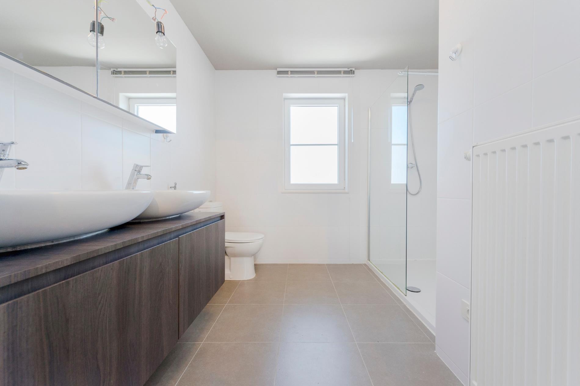 De badkamer is voorzien van een dubbel lavabomeubel, inloopdouche en een toilet.