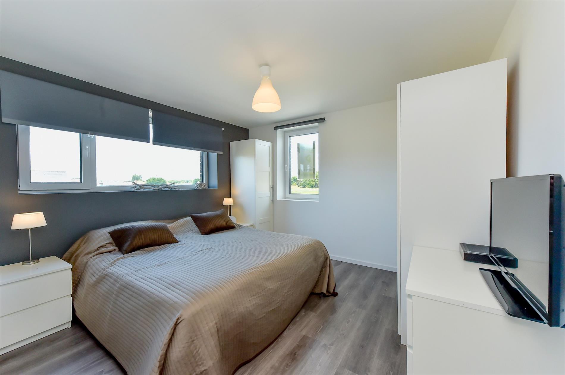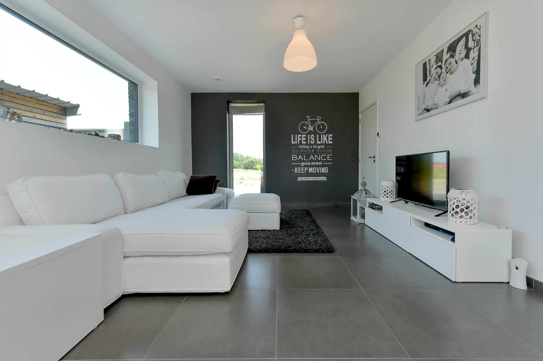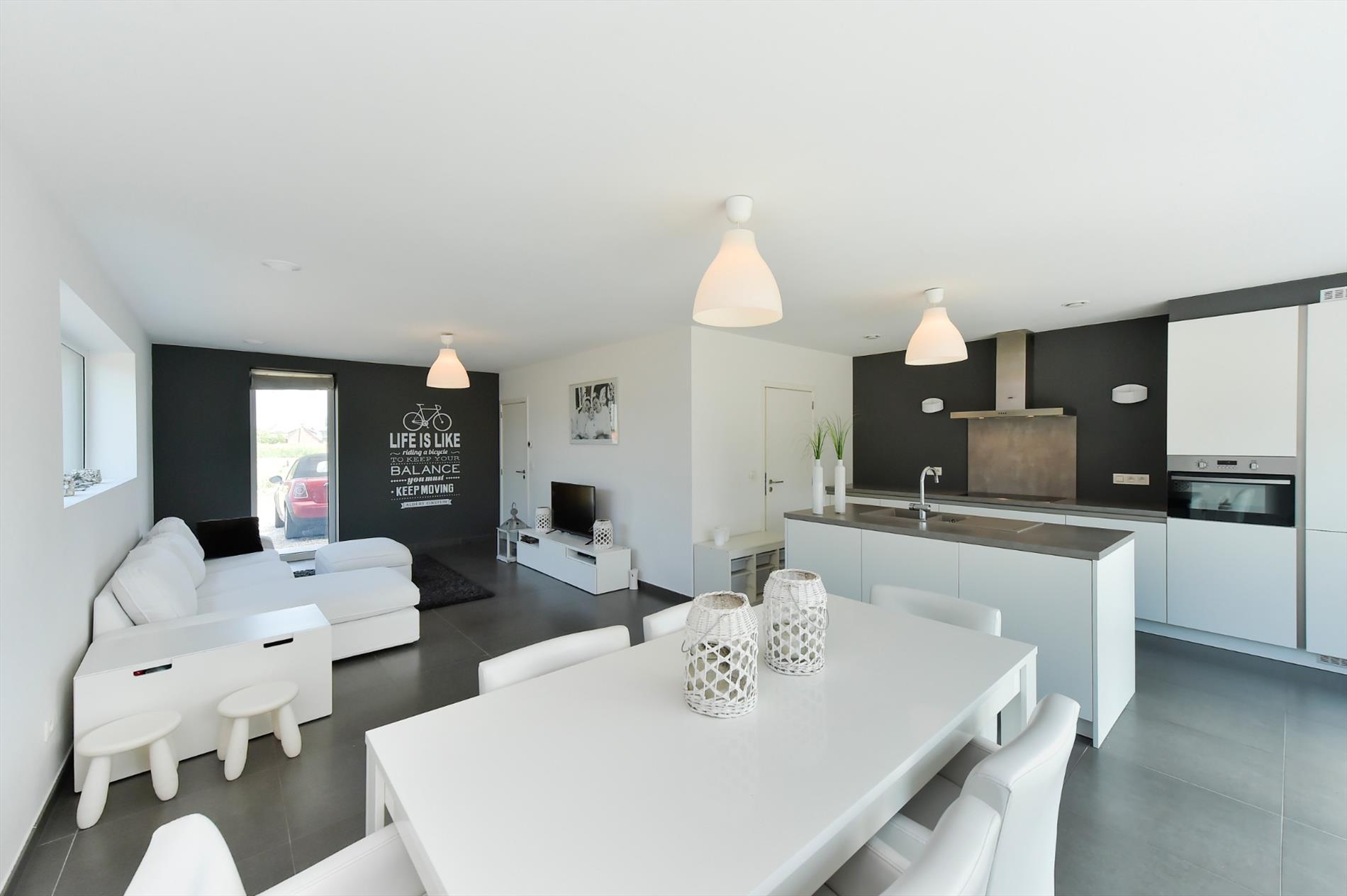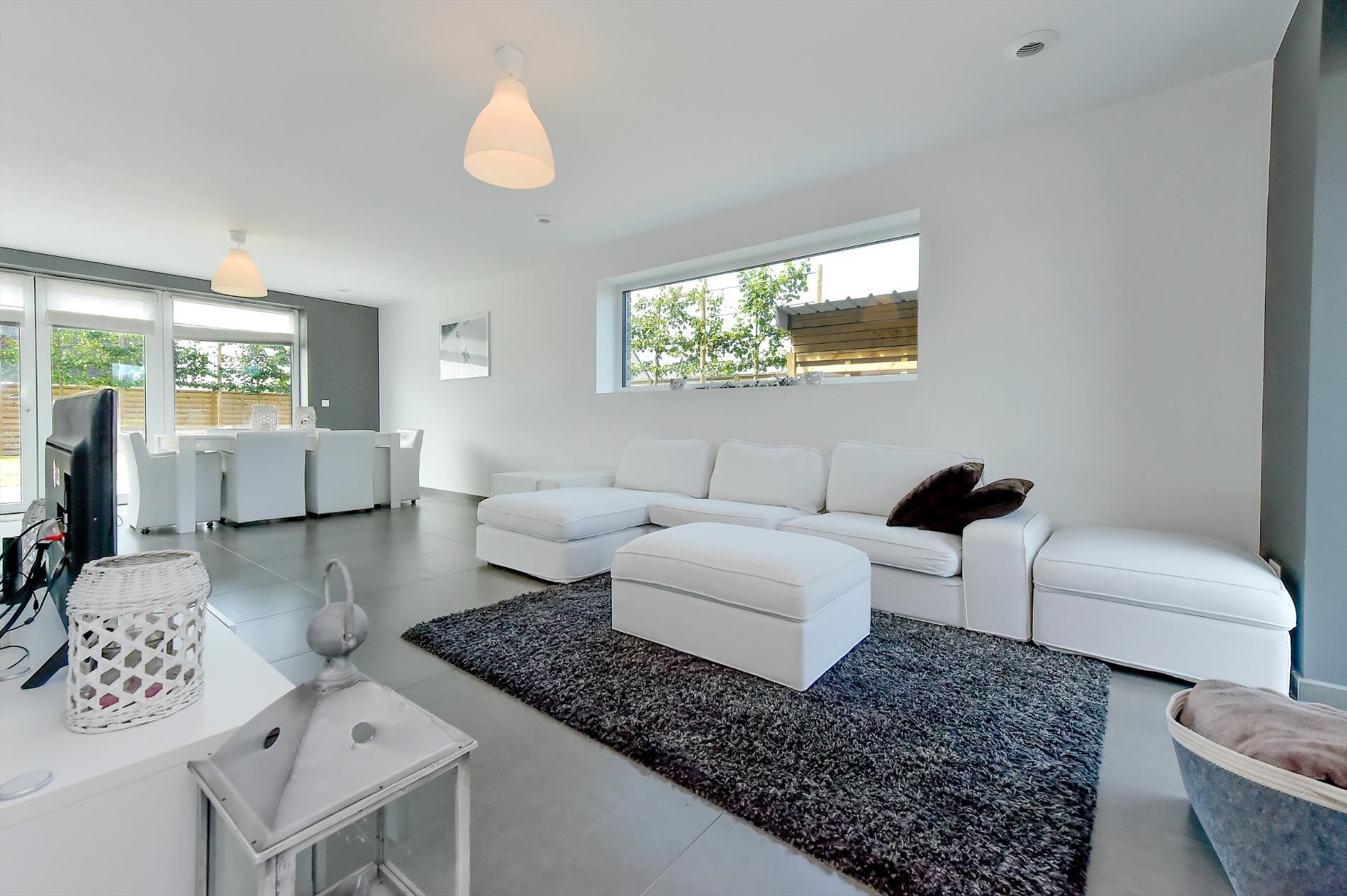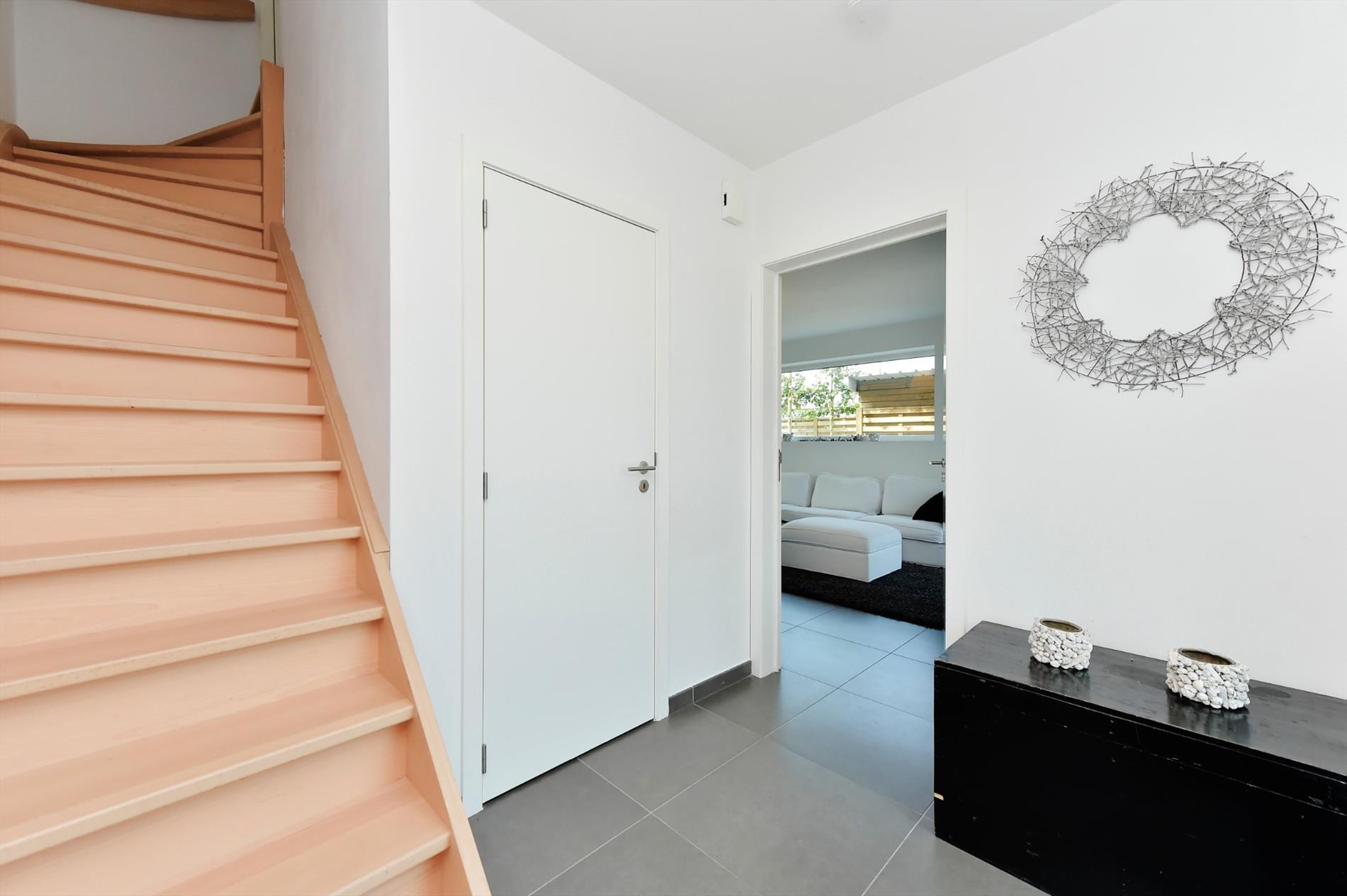 We komen binnen in een ruime inkomhal met apart toilet en plaats voor een vestiairekast. Via de inkom komen we in de woonkamer met zithoek en eetplaats. De woonkamer en volledig geïnstalleerde keuken vormen één overkoepelende ruimte (47m²) en hebben een prachtige lichtinval door de enorme glaspartij.