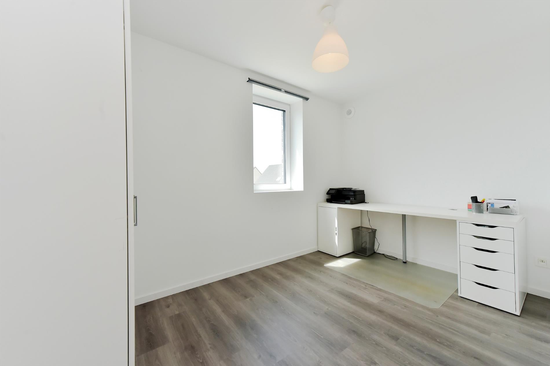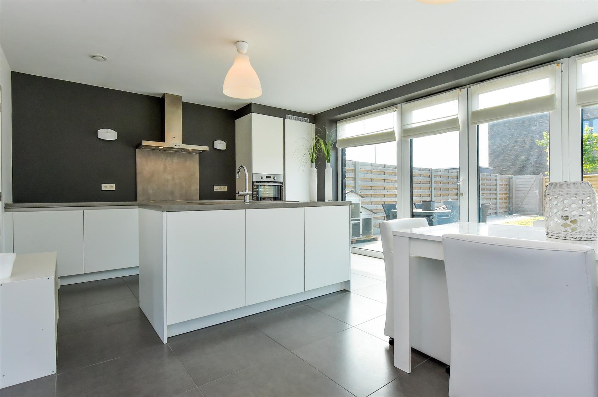 Via het grote raam in de woonkamer/keuken hebt U direct contact met de volledig aangelegde tuin. Deze is voorzien van een zeer ruim terras (45m²) en tuinberging.