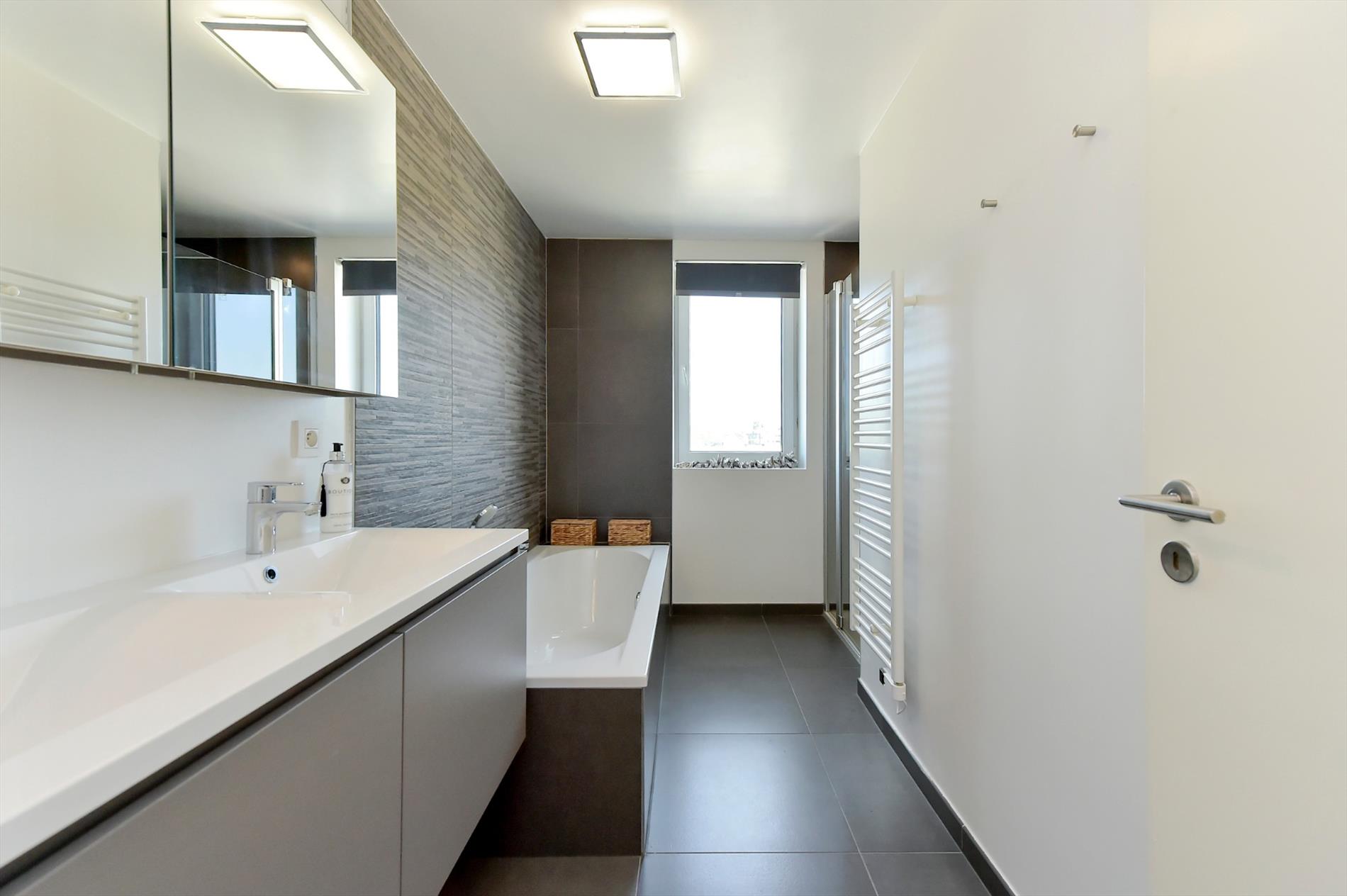 Op het verdiep zijn 4 slaapkamer met een oppervlakte van : 12,60m² | 9,42m² | 9,10m² | 8,28m². De prachtige badkamer is voorzien van een dubbele lavabomeubel met spiegelkast, een ligbad alsook douche. Verder is er nog een apart toilet.