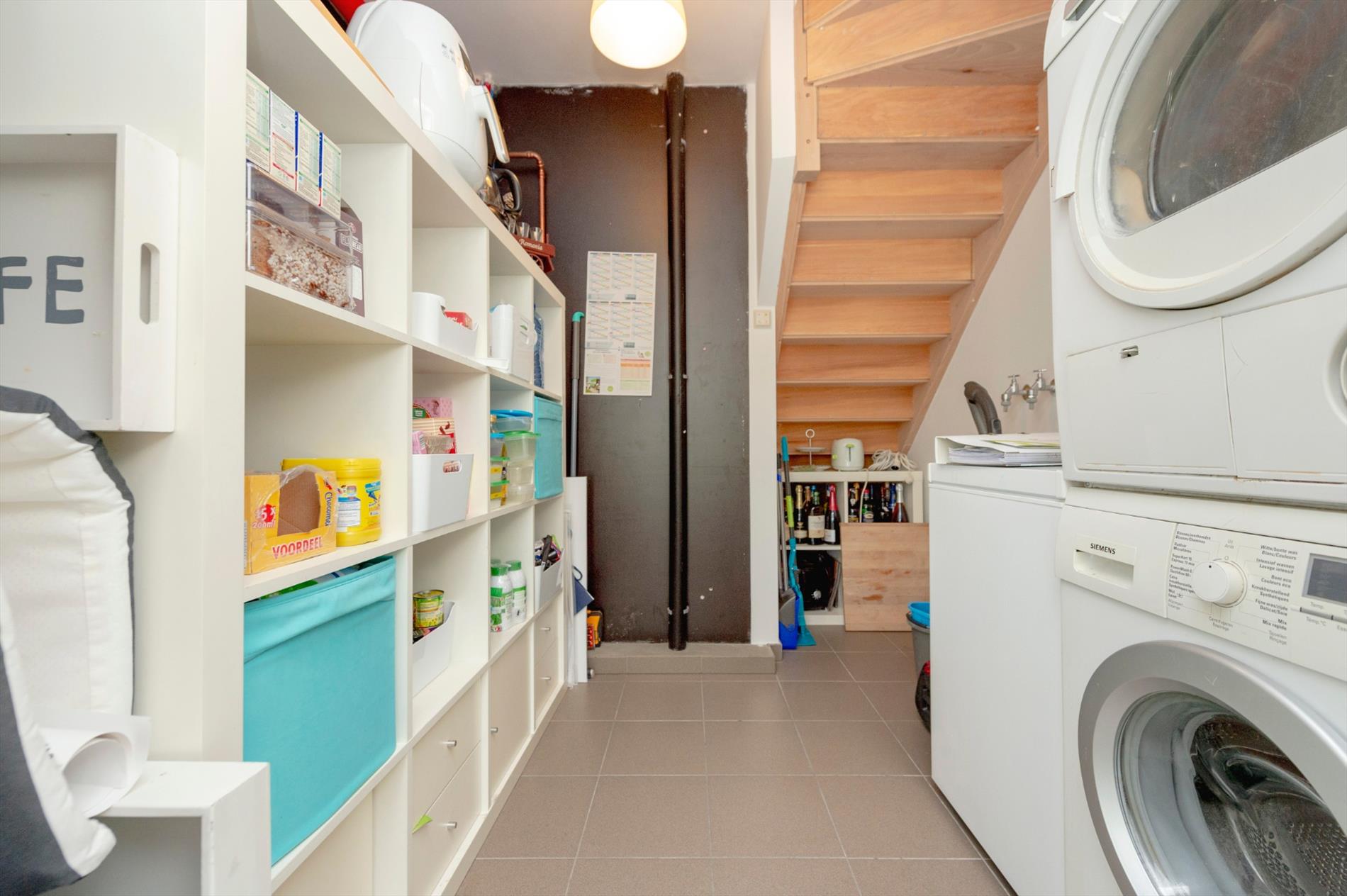 De ingerichte keuken is uitgerust met een keramische kookplaat, dampkap, combi-oven, vaatwasmachine, dubbele spoelbak en ruime frigo. Vervolgens is er nog een ruime (5,50m²) provisieberging waar er ook aansluiting is voor een wasmachine en droogkast.
