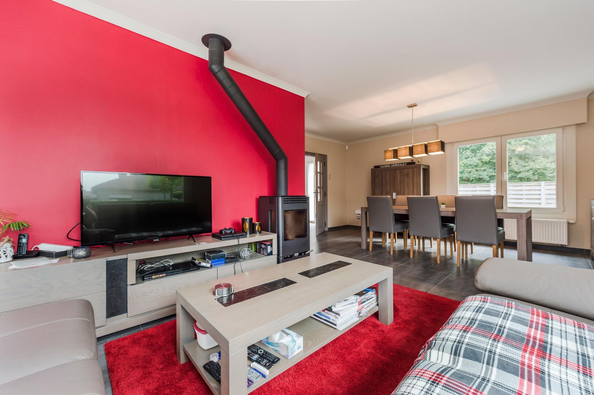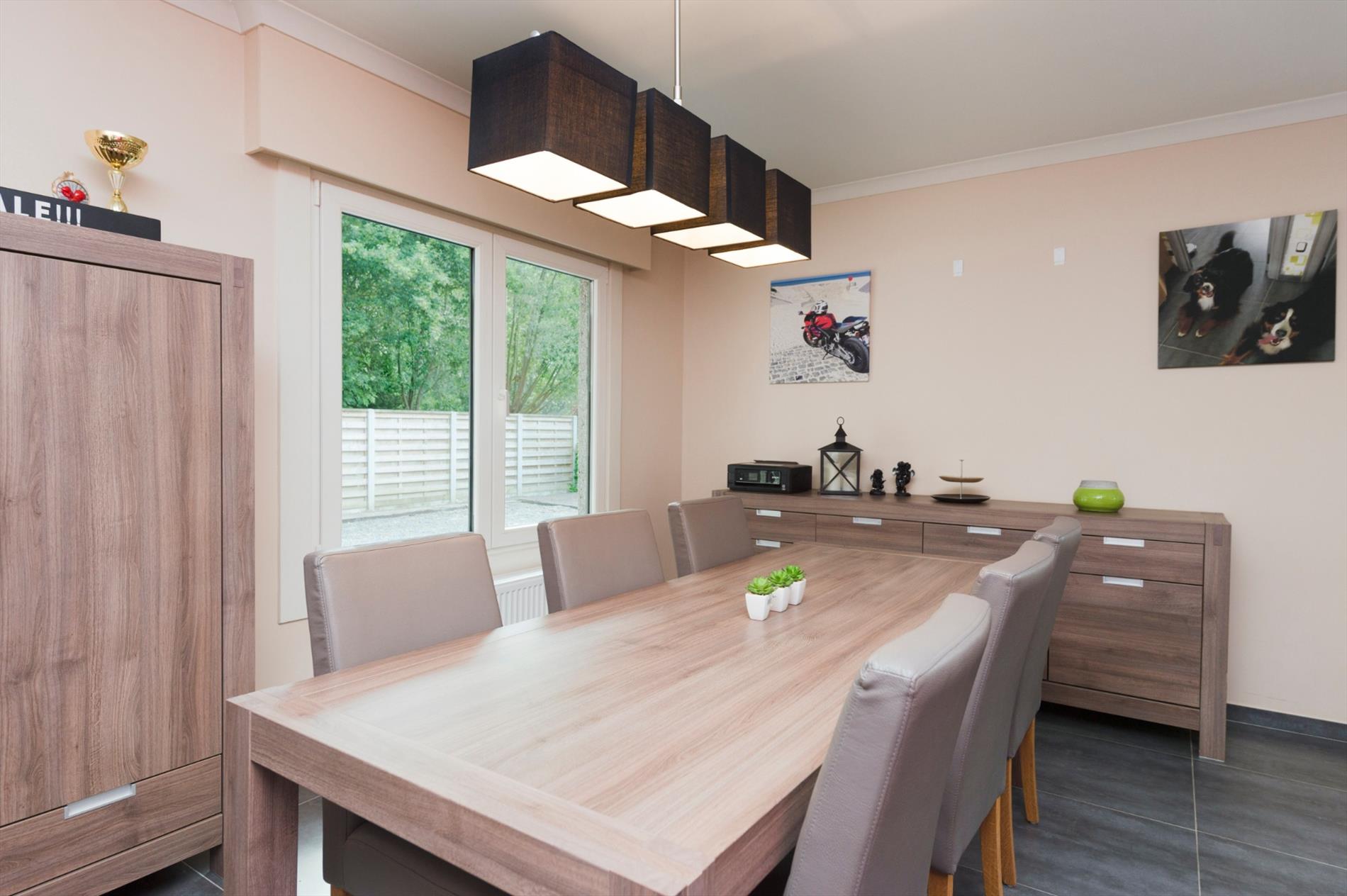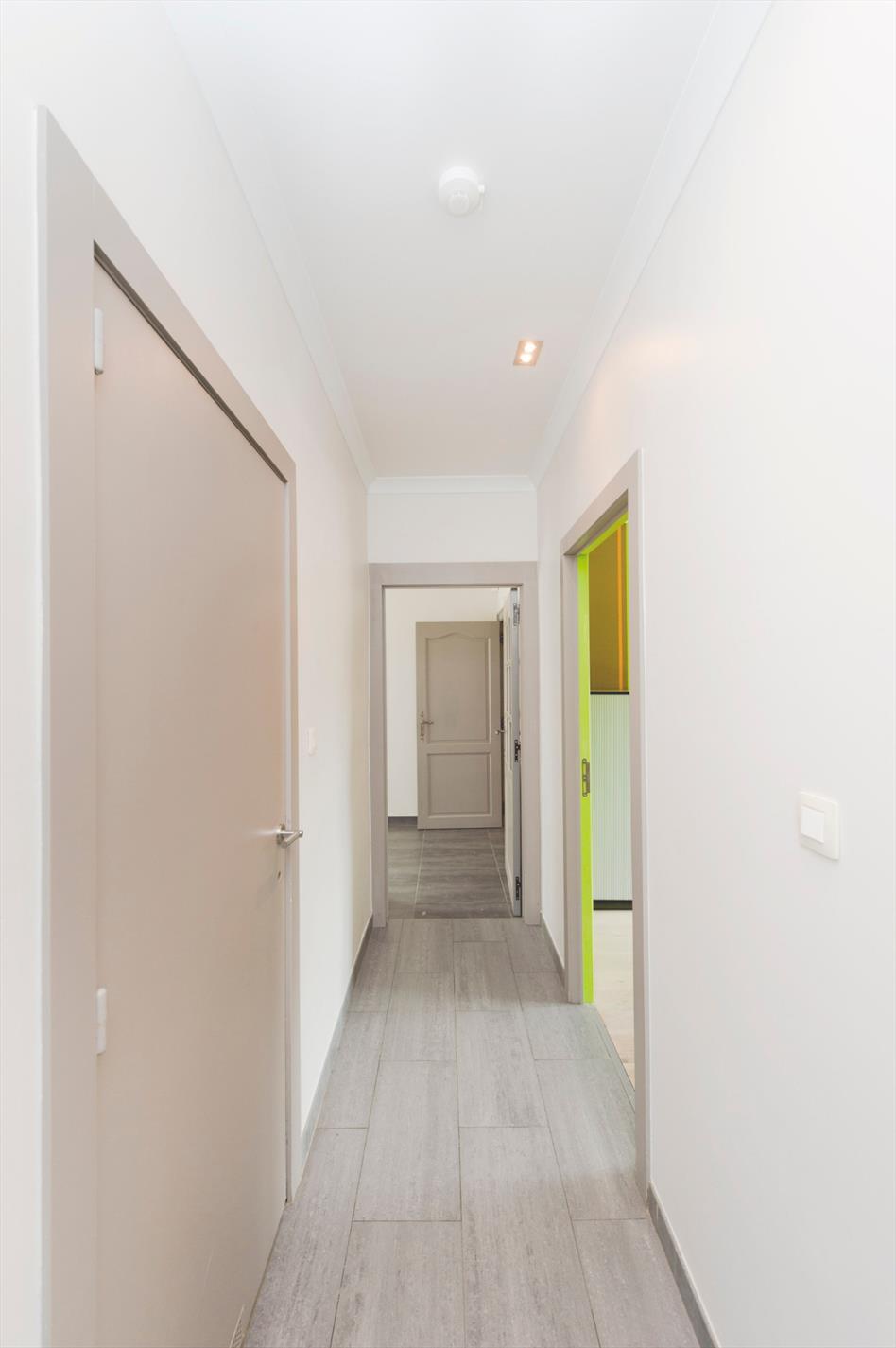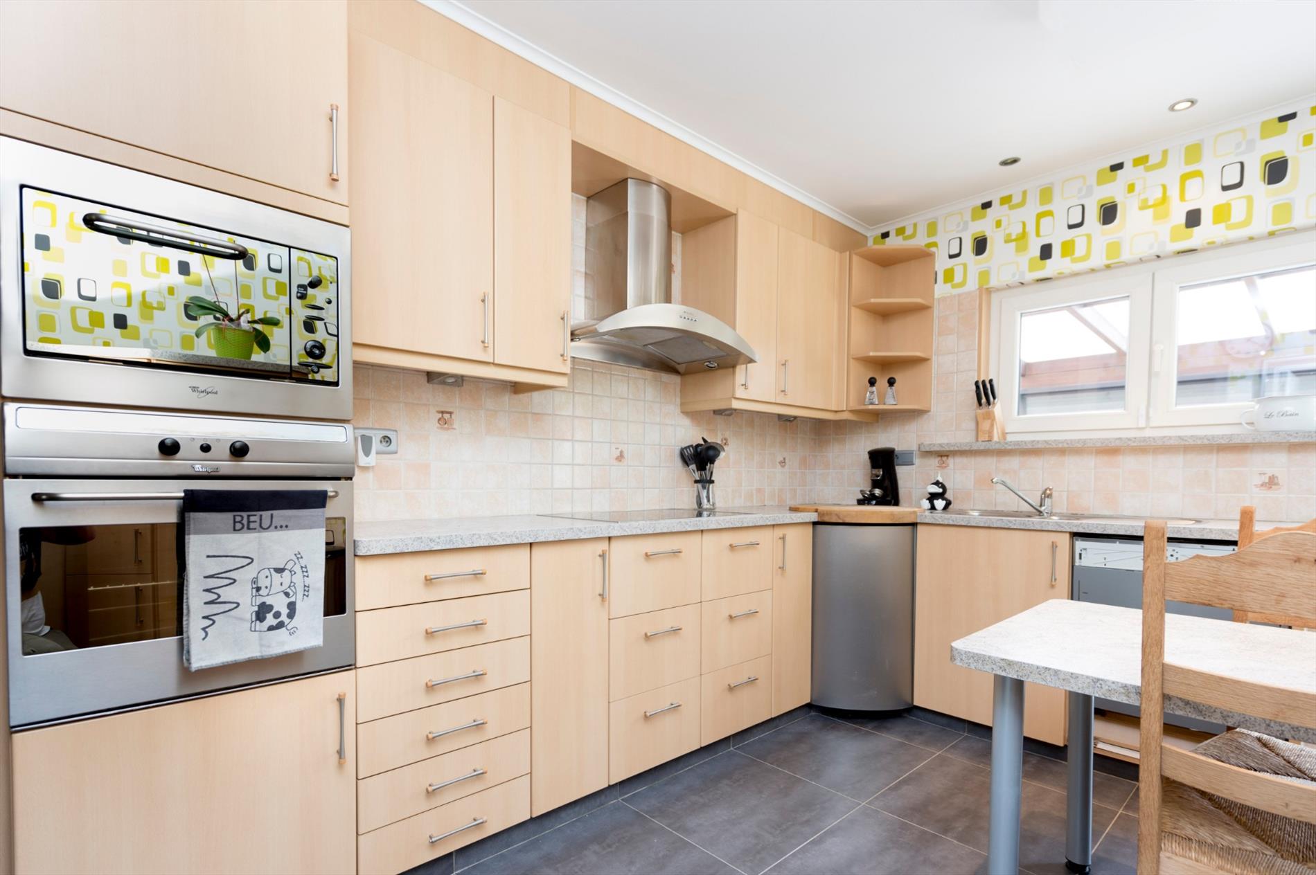 Indeling: We komen binnen in een lichtrijke inkomhal met apart gastentoilet. Via de inkom komen we in de L-vormige woonkamer met zithoek en eetplaats. De ruime woonkamer is voorzien van 2 grote ramen, die voor veel lichtinval zorgen met tevens een schuifraam naar de veranda. De gesloten keuken is volledig ingericht en is voorzien van keramische kookplaat, dampkap, oven, micro, vaatwasmachine, dubbele spoelbak en koelkast.
