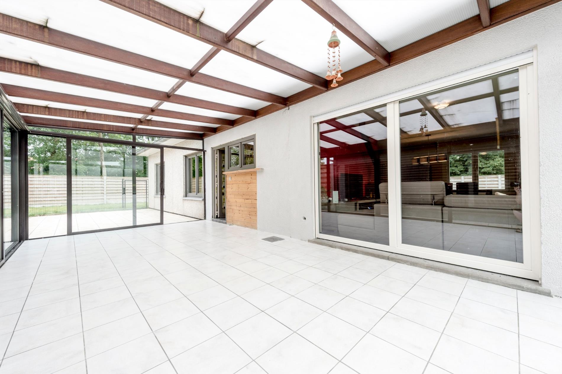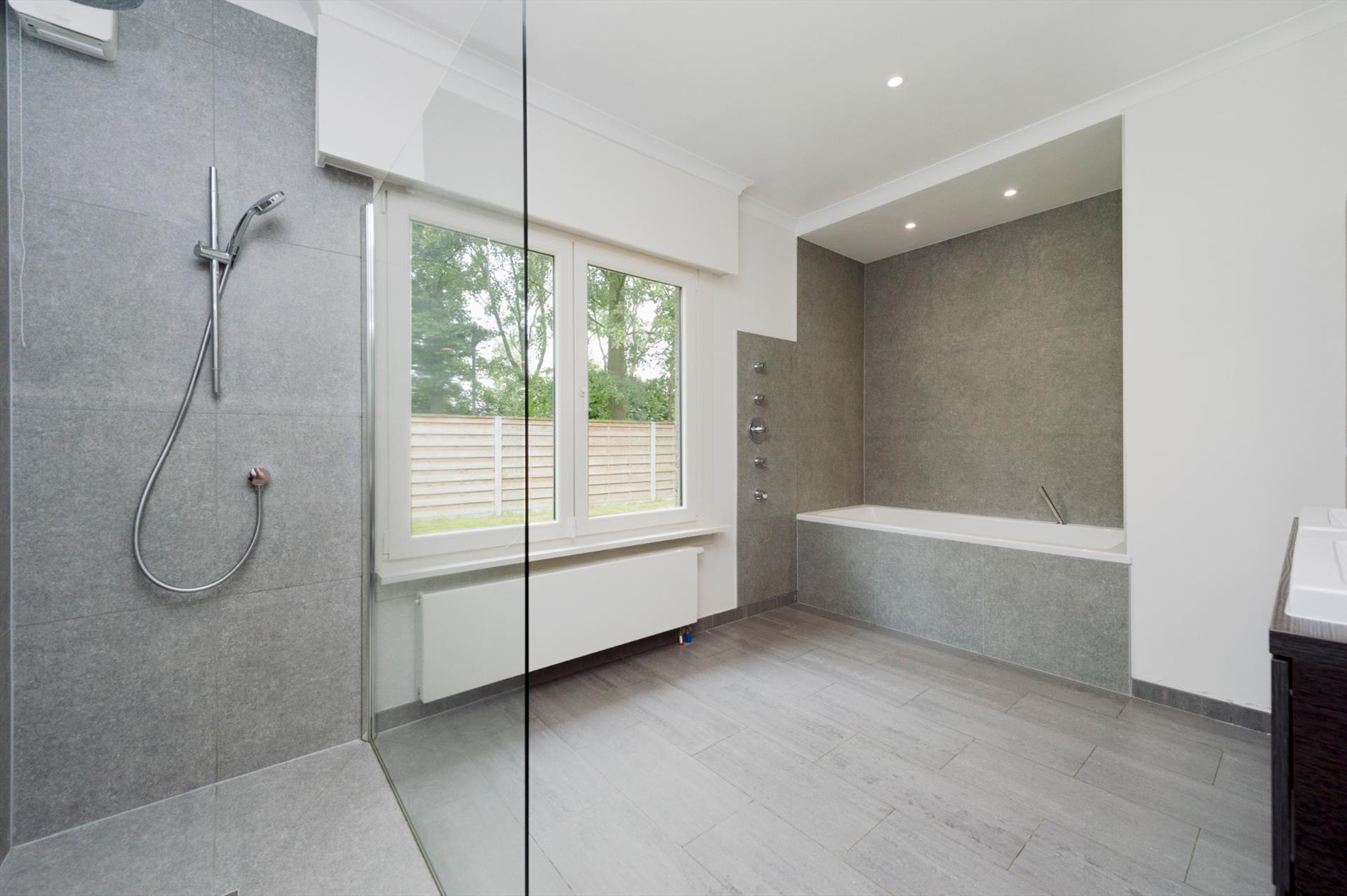De nachthall brengt U vervolgens naar twee slaapkamers (elk met ingemaakte kasten), een volledig nieuwe dressing alsook een recent volledig vernieuwde badkamer (ligbad/ inloopdouche/dubbele lavabo met diverse opbergkasten. De woning beschikt over een ruime berging (voormalige garage) waar U mogelijkheid hebt om een derde slaapkamer te creëren. De veranda geeft U directe toegang tot de tuin, dit via zowel leefruimte als keuken. Deze veranda is in een op te frissen staat.
