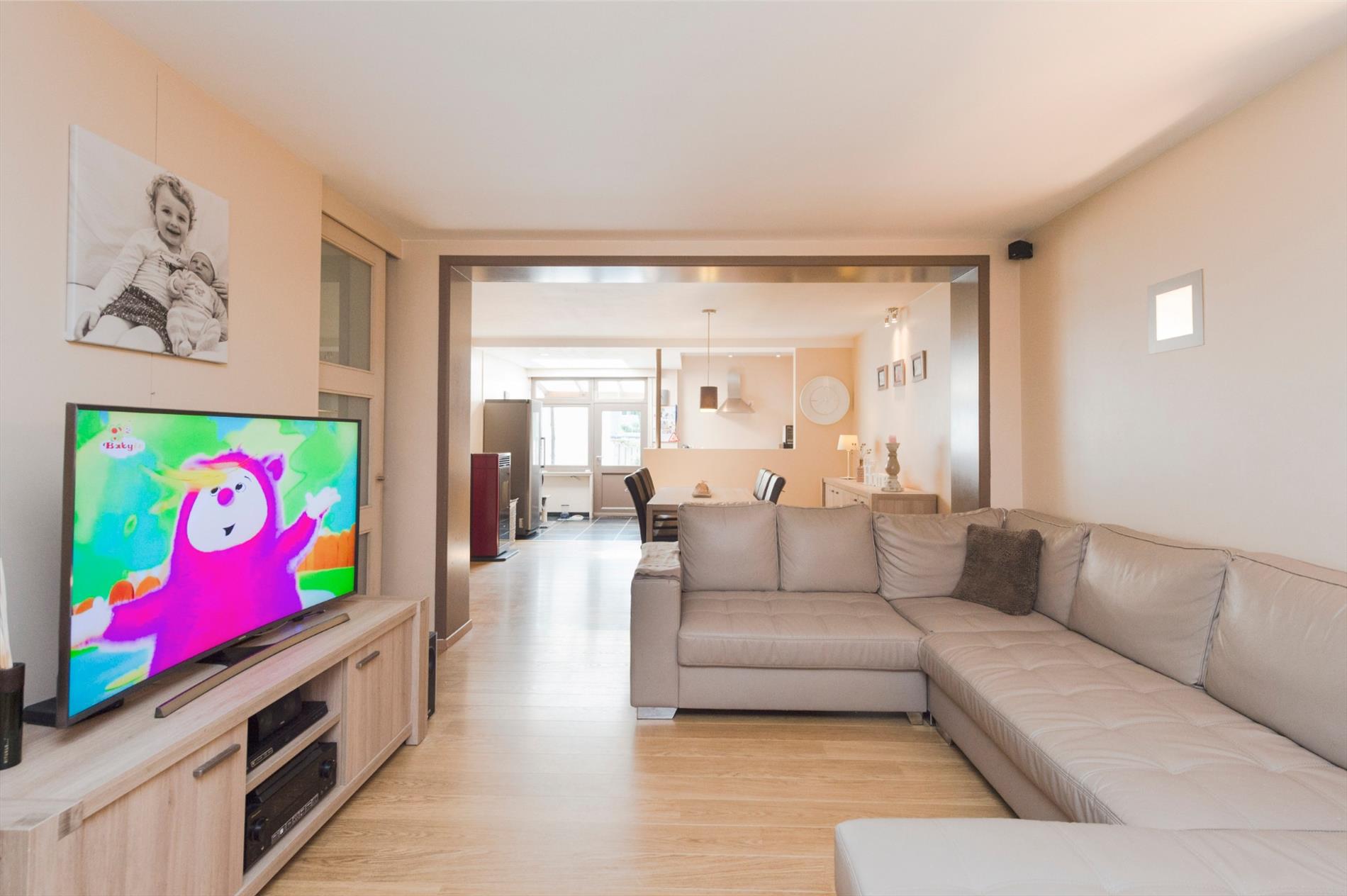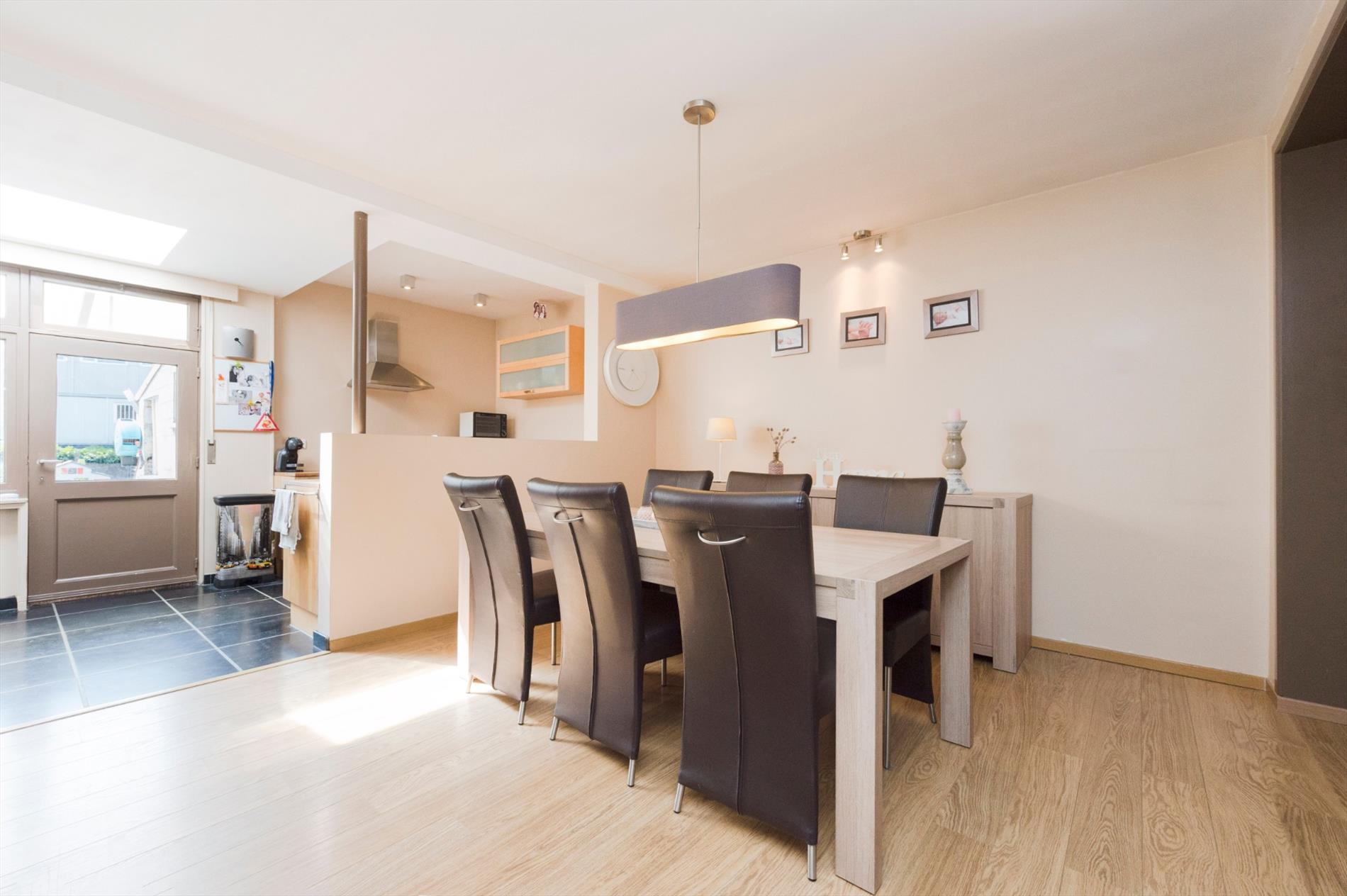 Gelijkvloers: we komen binnen in de woning via de inkomhal met aansluitend de woonkamer en eetkamer. Via een dubbele schuifdeur kan U kiezen of U het bureau open wil stellen naar de zithoek toe. Verder is een ingerichte open keuken met directe toegang tot het terras/tuin.