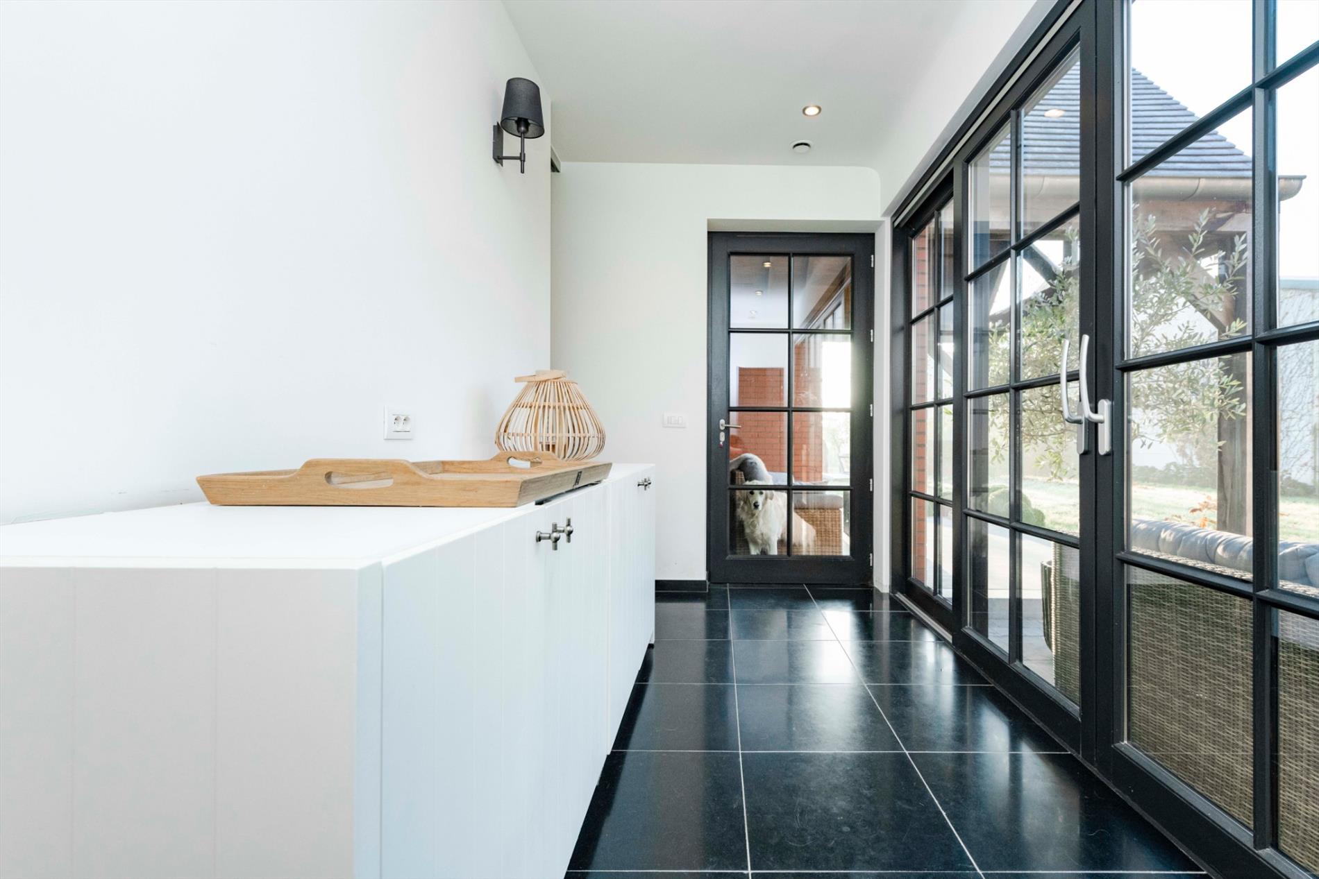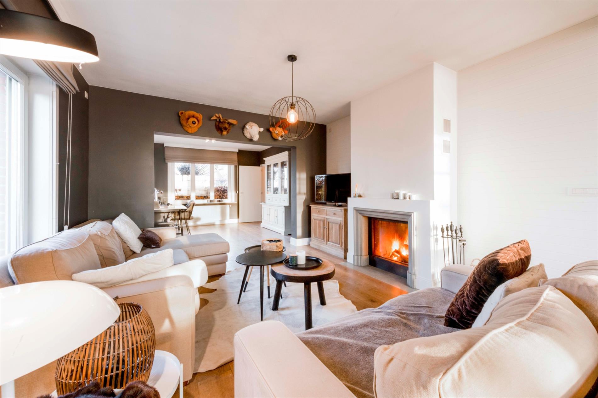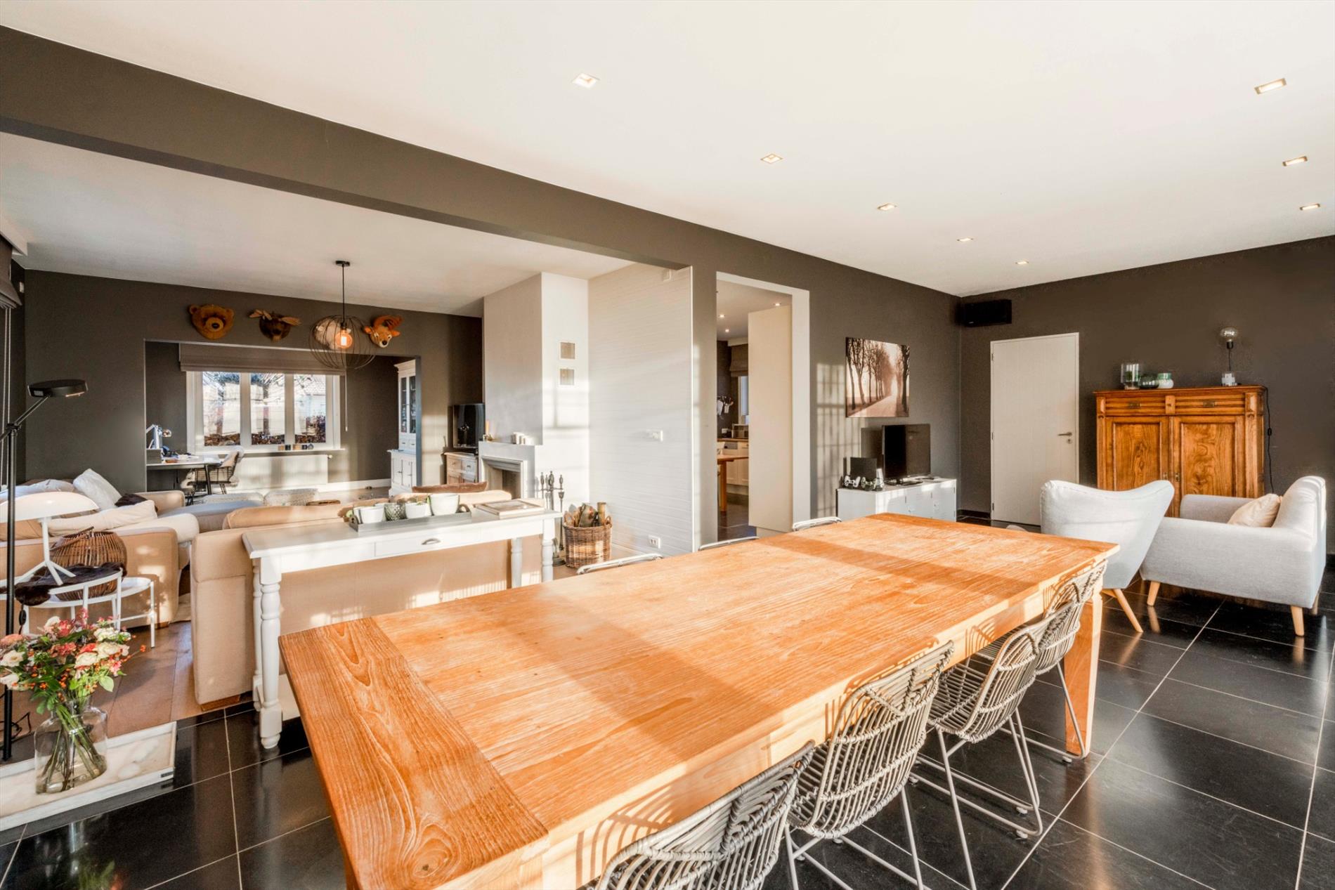 GELIJKVLOERS: U betreedt de eigendom via de aangelegde voortuin met blauwsteen wandelpad. Via de dubbele voordeur komt U de inkom met gastentoilet binnen. Het hart van de woonst is de prachtige zitruimte/eetplaats met dubbelzijdige open haard (keuken/zitruimte) met directe toegang tot het aangelegde terras/tuin. Deze ruimte omvat maar liefst 72m² en kan U naar believen inrichten tot eetkamer/zitruimte of zelfs een gedeelte bureauruimte. Aansluitend is er de volledig ingerichte keuken (kookplaat | dampkap | oven | dubbele spoelbak). Zeer praktisch is de aansluitende berging alsook de directe toegang tot de ruime droge kelder.