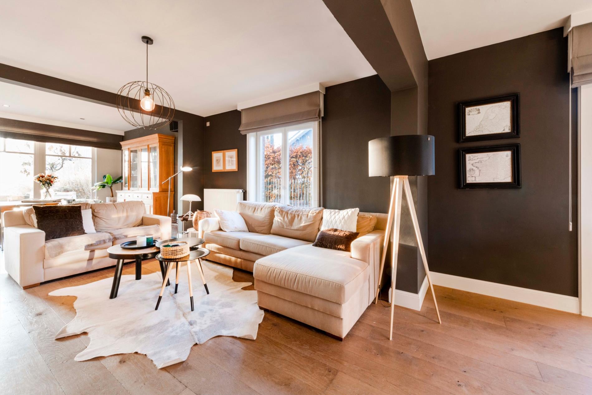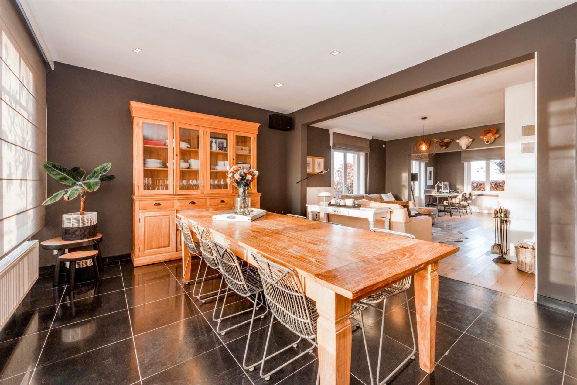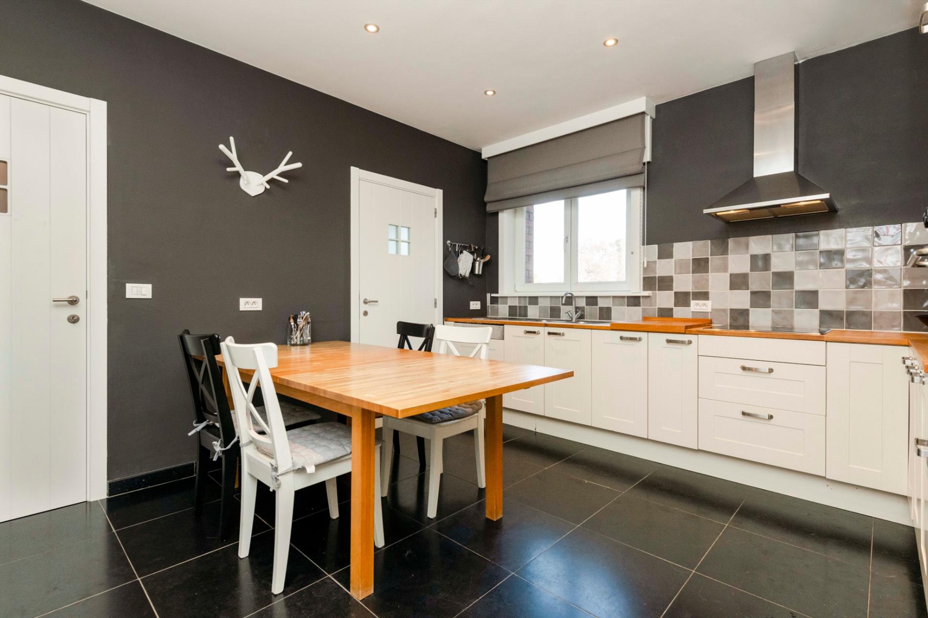 GELIJKVLOERS: U betreedt de eigendom via de aangelegde voortuin met blauwsteen wandelpad. Via de dubbele voordeur komt U de inkom met gastentoilet binnen. Het hart van de woonst is de prachtige zitruimte/eetplaats met dubbelzijdige open haard (keuken/zitruimte) met directe toegang tot het aangelegde terras/tuin. Deze ruimte omvat maar liefst 72m² en kan U naar believen inrichten tot eetkamer/zitruimte of zelfs een gedeelte bureauruimte. Aansluitend is er de volledig ingerichte keuken (kookplaat | dampkap | oven | dubbele spoelbak). Zeer praktisch is de aansluitende berging alsook de directe toegang tot de ruime droge kelder.