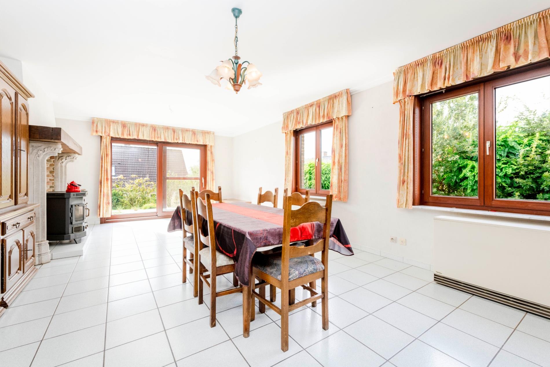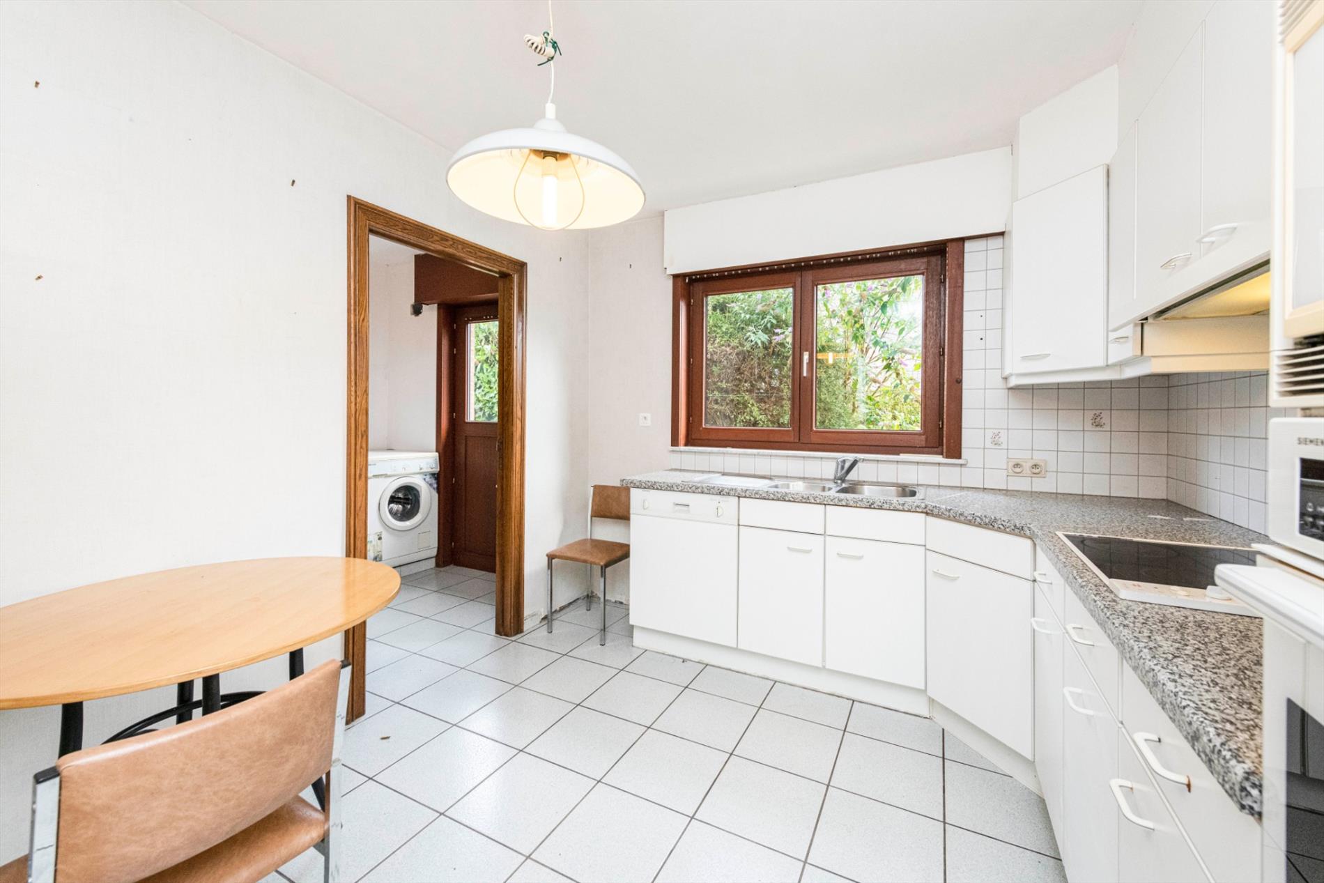 We komen binnen in een ruime inkomhal met gastentoilet die rechtstreeks toegang biedt tot de keuken en de leefruimte. De leefruimte (33m²) heeft grote raampartijen die voor natuurlijk lichtinval en een mooi zicht op de tuin zorgen. De leefruimte is tevens voorzien van een mooie schouw met authentieke houtkachel. Via de leefruimte hebt U toegang tot de ingerichte keuken (kookplaat | dampkap | dubbele spoelbak | oven | microgolfoven | vaatwasmachine) met ontbijthoek. Vanuit de keuken is er tevens toegang tot de wasplaats met voorziening voor wasmachine en droogkast met aansluitend de berging.