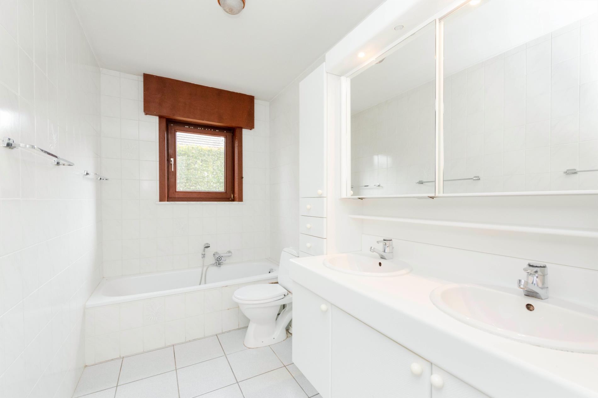 Tevens vinden we op het gelijkvloers, 2 ruime slaapkamers (van respectievelijk 14 m² en 10 m²) en 1 badkamer voorzien van bad, toilet en dubbele lavabo met meubel.