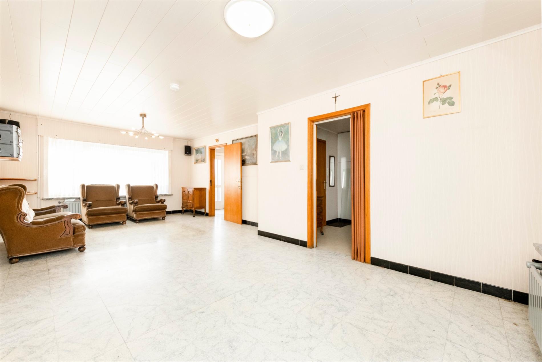 We komen binnen in de inkomhall met gastentoilet, vanuit de inkom kan U de ruime leefruimte betreden met zit-en eetplaats die rechtstreeks toegang biedt tot de keuken. De leefruimte heeft grote raampartijen die voor veel natuurlijk lichtinval alsook een open gevoel zorgen. De keuken (15,20 m²) omvat een kookplaat | dampkap | oven | dubbele spoelbak | frigo) met ruimte voor een eetplaats, aansluitend is er een grote kelderberging.