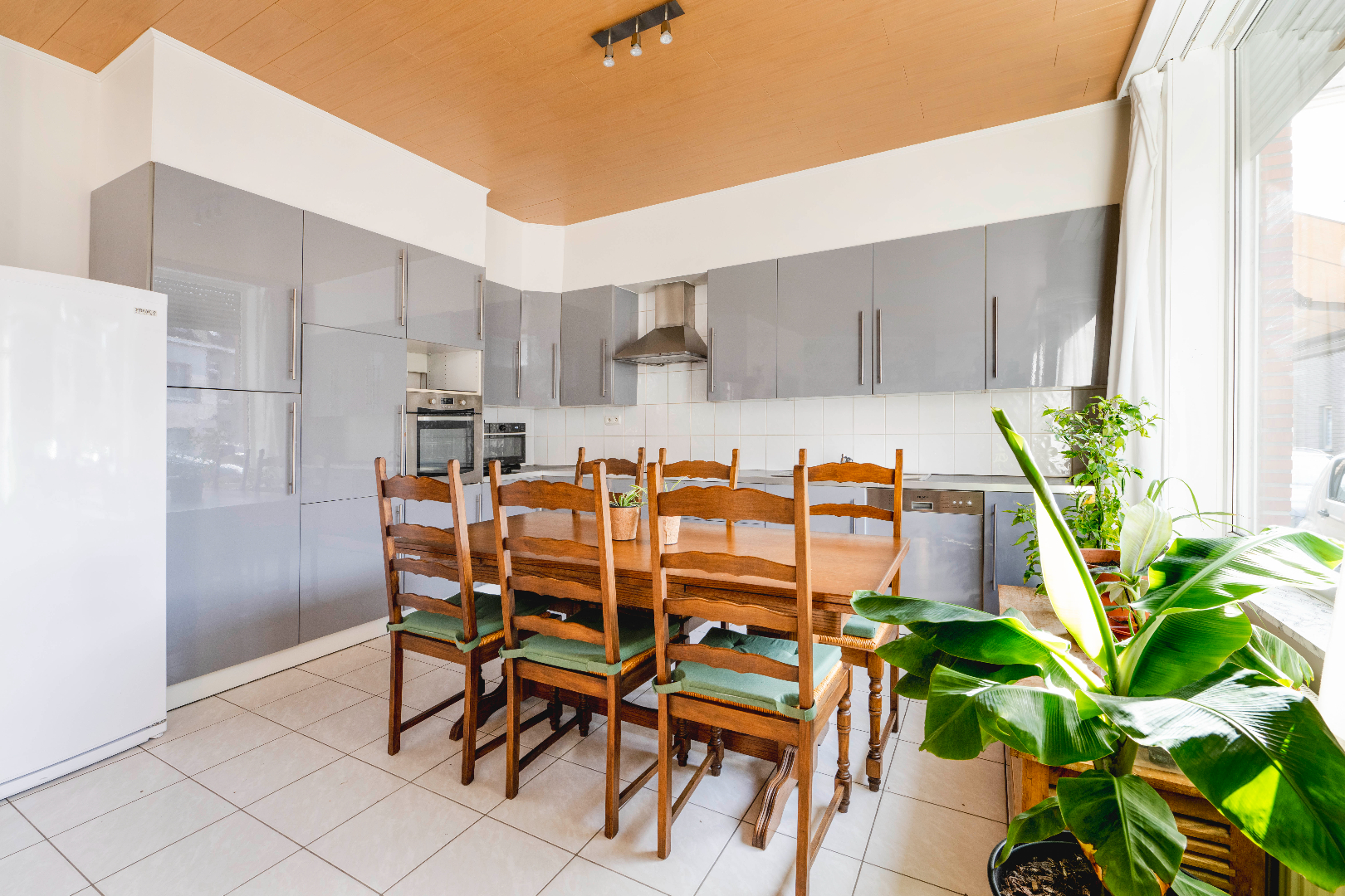 De woning omvat een ingerichte ruime keuken (kookplaat | dampkap | spoelbak | oven | vaatwasser) alsook een gezellige zithoek. Beide zeer lichtrijk gezien de grote raampartijen. Tevens een technische berging, een wasplaats en een apart gastentoilet. De eigendom is voorzien van een praktische kelder.