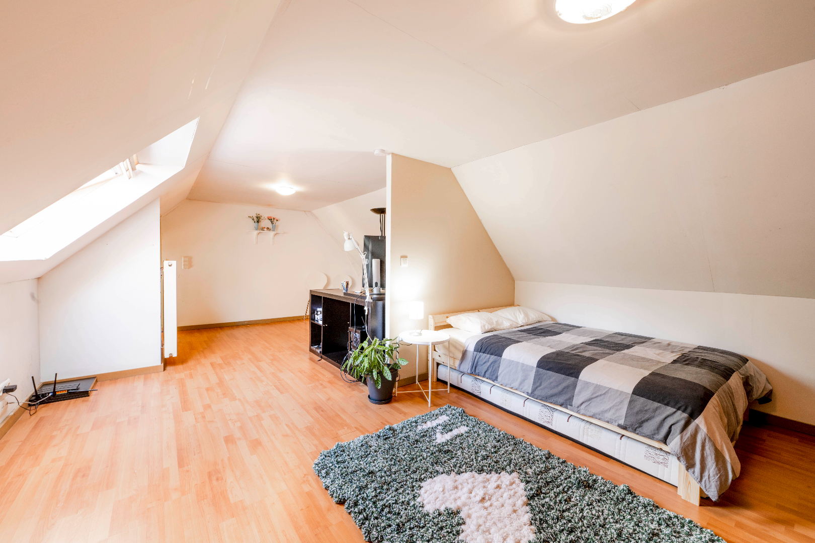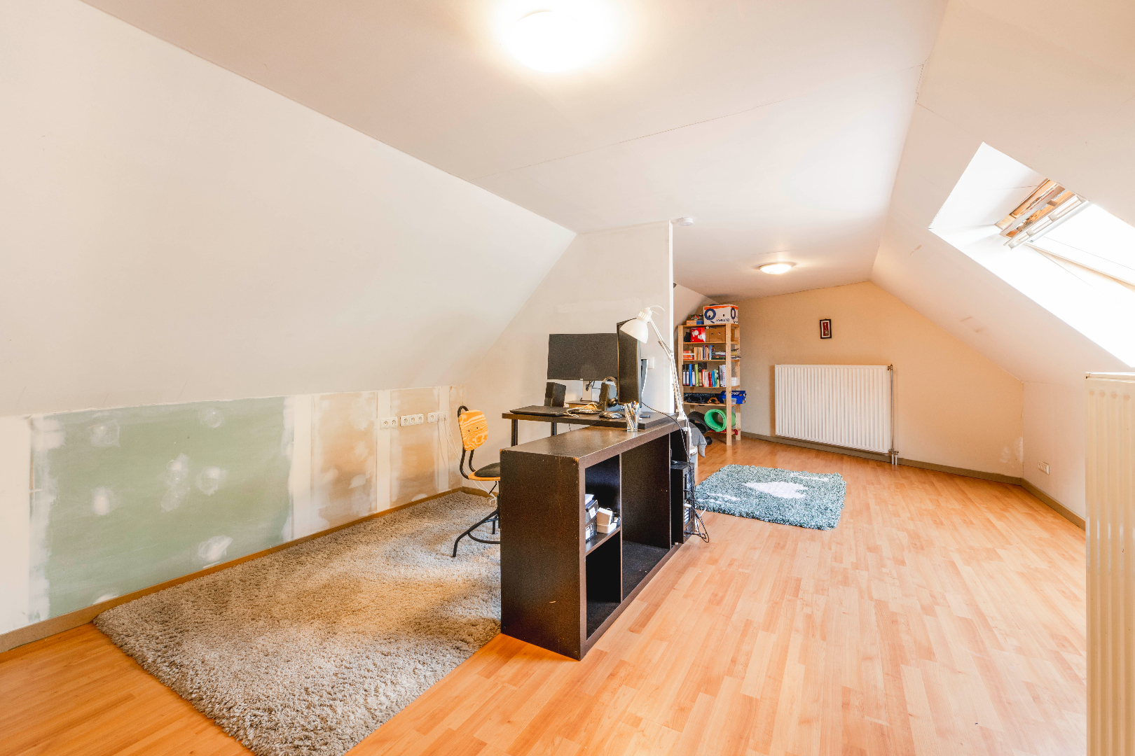 De zolderverdieping is toegankelijk met een vaste trap en omvat een gedeelte als bureeel alsook een tweede slaapkamer. Deze dakverdieping kan U zeker omvormen tot 2 slaapkamers.