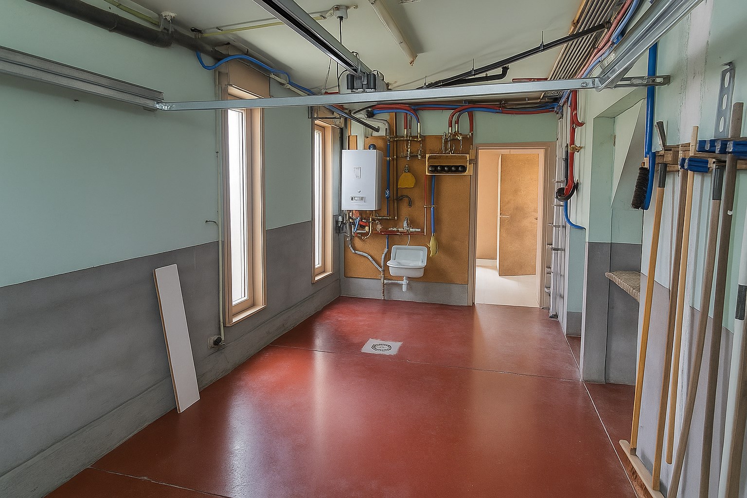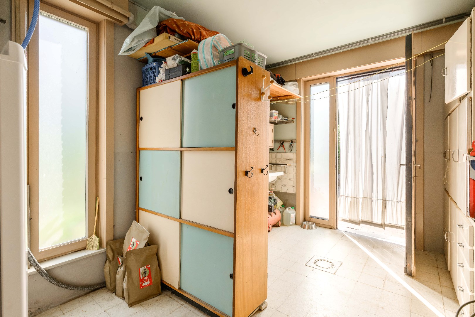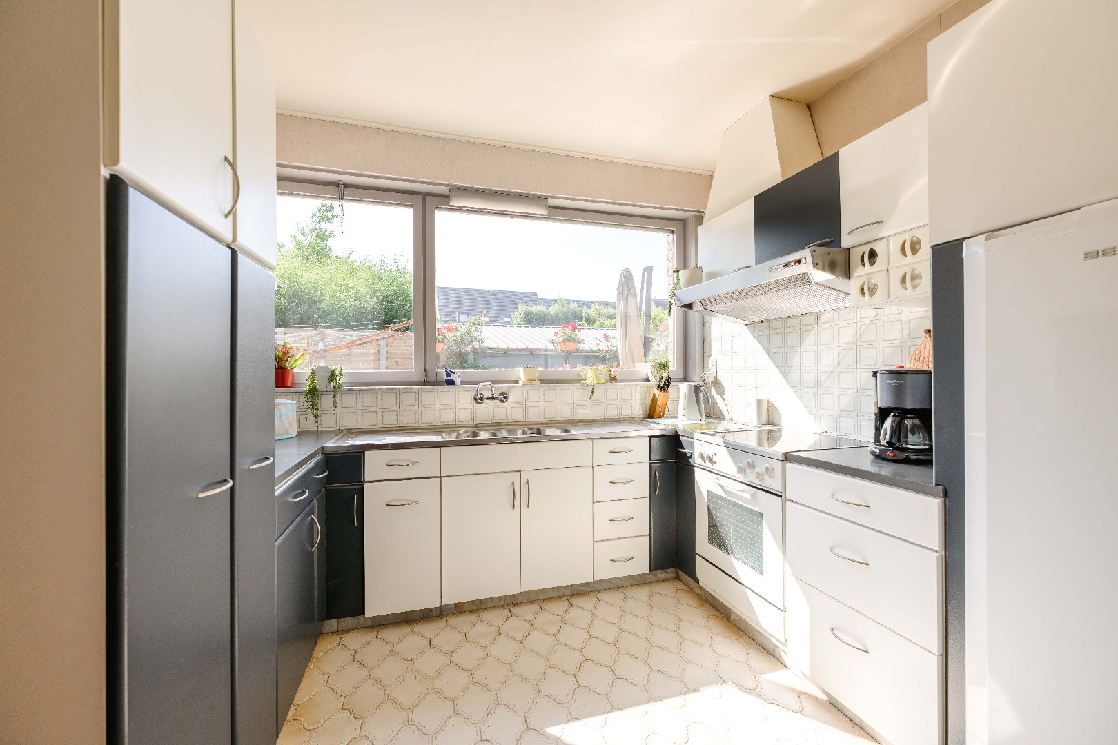 Aansluitend is er een volledig ingerichte keuken (15 m²) voorzien van kookplaat | dampkap | spoelbak | frigo | oven, met directe toegang tot een praktische wasplaats (11 m²) met toegang tot de tuin.