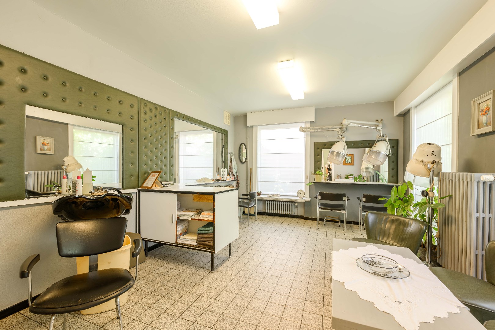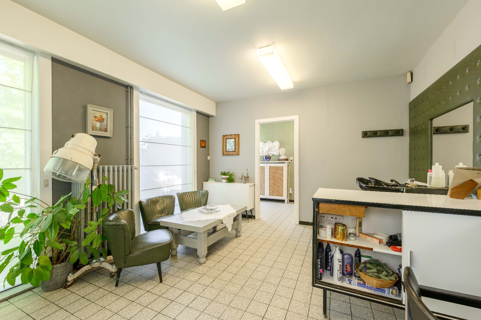 U komt binnen via de inkomhal met apart gastentoilet. Vanuit de hal heeft u toegang tot een praktijkruimte (18 m²) én de lichte leefruimte (30 m²) met zithoek en eethoek, die uitkijkt op de tuin.