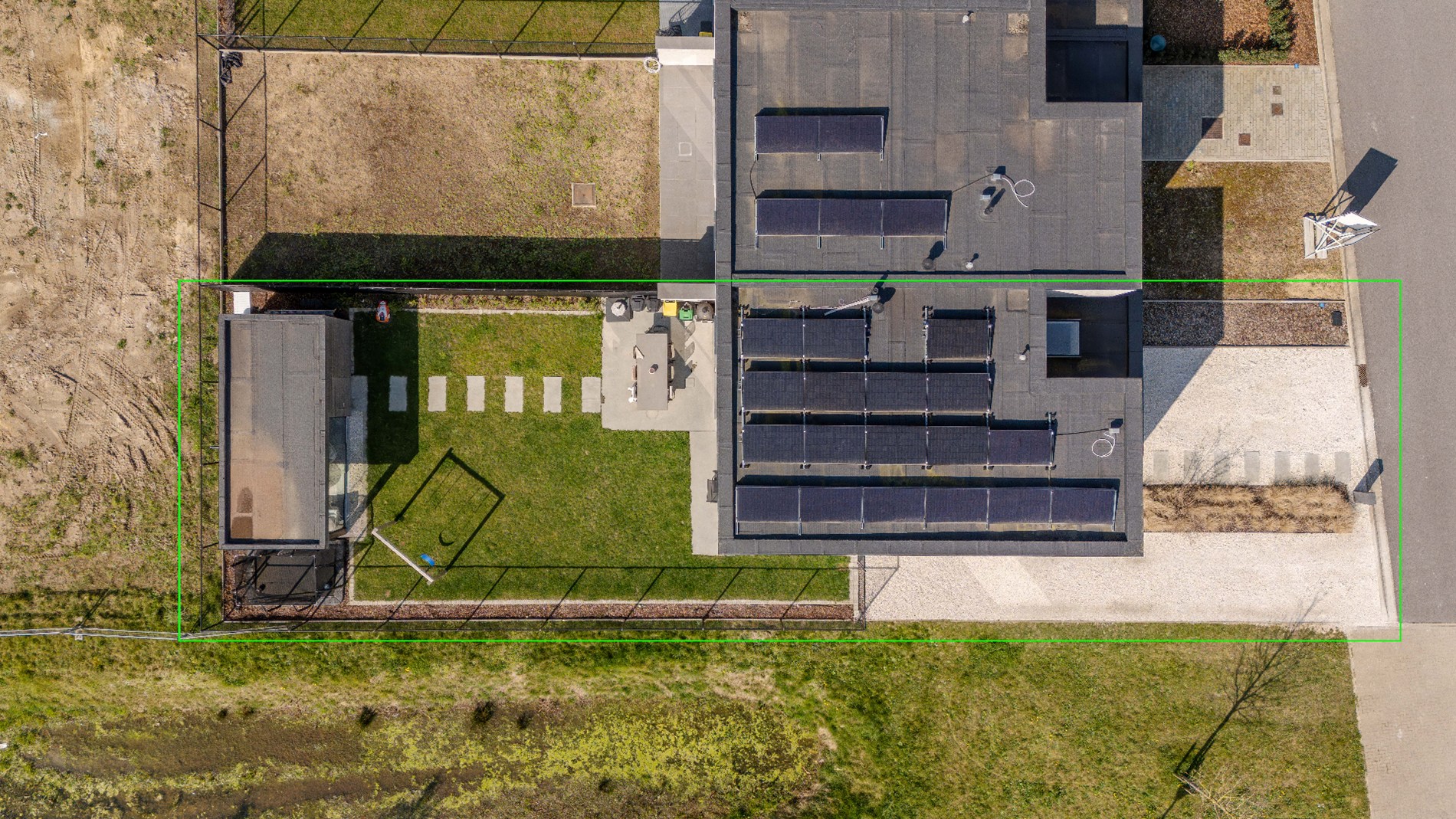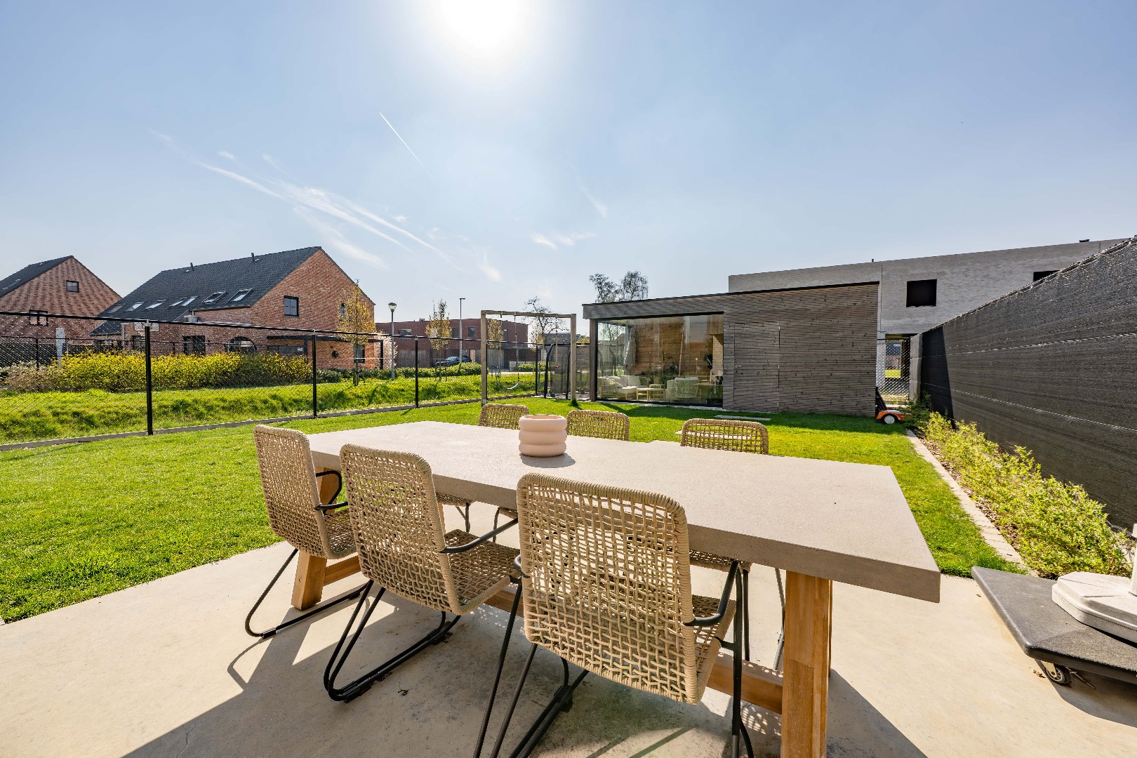 De zongericht tuin is reeds volledig aangelegd met ruime terrassen alsook een PRACHTIG BIJGEBOUW (deels lounge, deels stockageruimte). Deze is tevens volledig afgesloten en ingevolge kindvriendelijk.