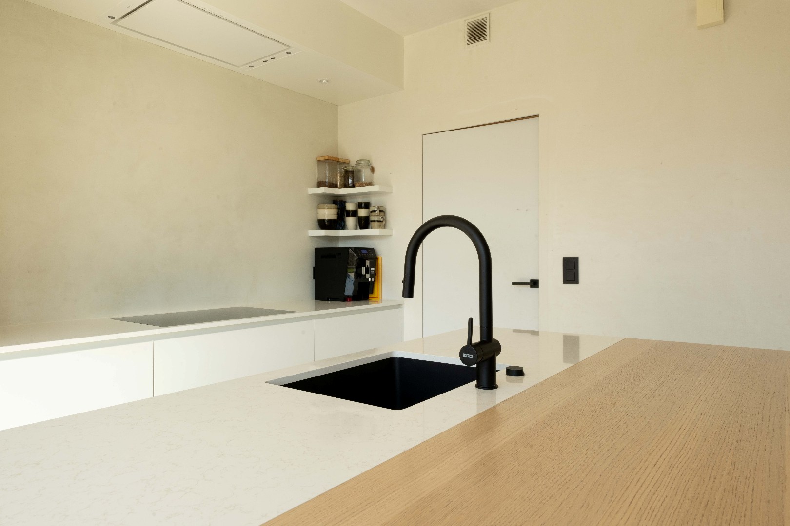 U komt binnen via de inkomhal met apart gastentoilet. Op het gelijkvloers is er een bureel (13 m²) met ingemaakte kastenwand. Via de stalen deur is er toegang tot de ruime en lichtrijke leefruimte met zit- en eethoek (33 m²). Aansluitend is er de open, volledig ingerichte keuken (10 m²) met eiland. Uitgerust met spoelbak | inductie kookplaat | dampkap | oven | frigo en vaatwasser.