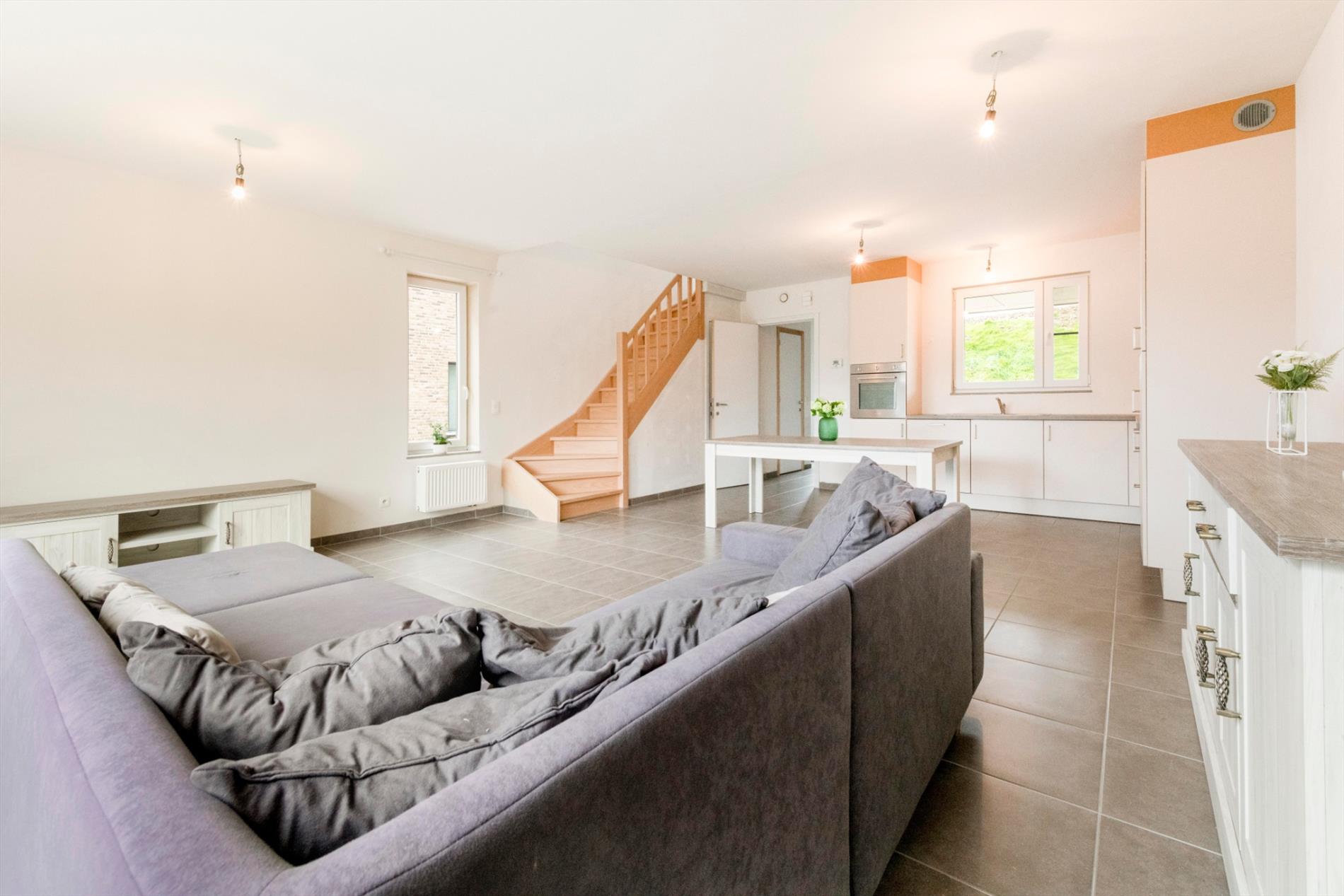 De woning bestaat uit: een inkomhal met apart gastentoilet. Aansluitend komt U de lichtrijke leefruimte binnen met open geïnstalleerde keuken (koelkast met vriesvak, keramische kookplaat, dampkap, vaatwasmachine, ingebouwde oven en enkele spoelbak). Vanuit de leefruimte is er directe toegang tot het terras en de tuin via schuifraam (veel lichtinval). Onder de trap is er een extra berging.