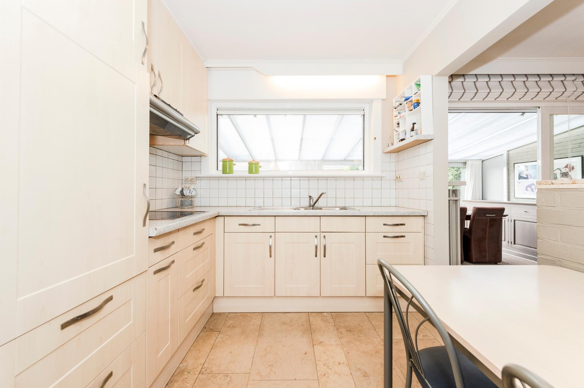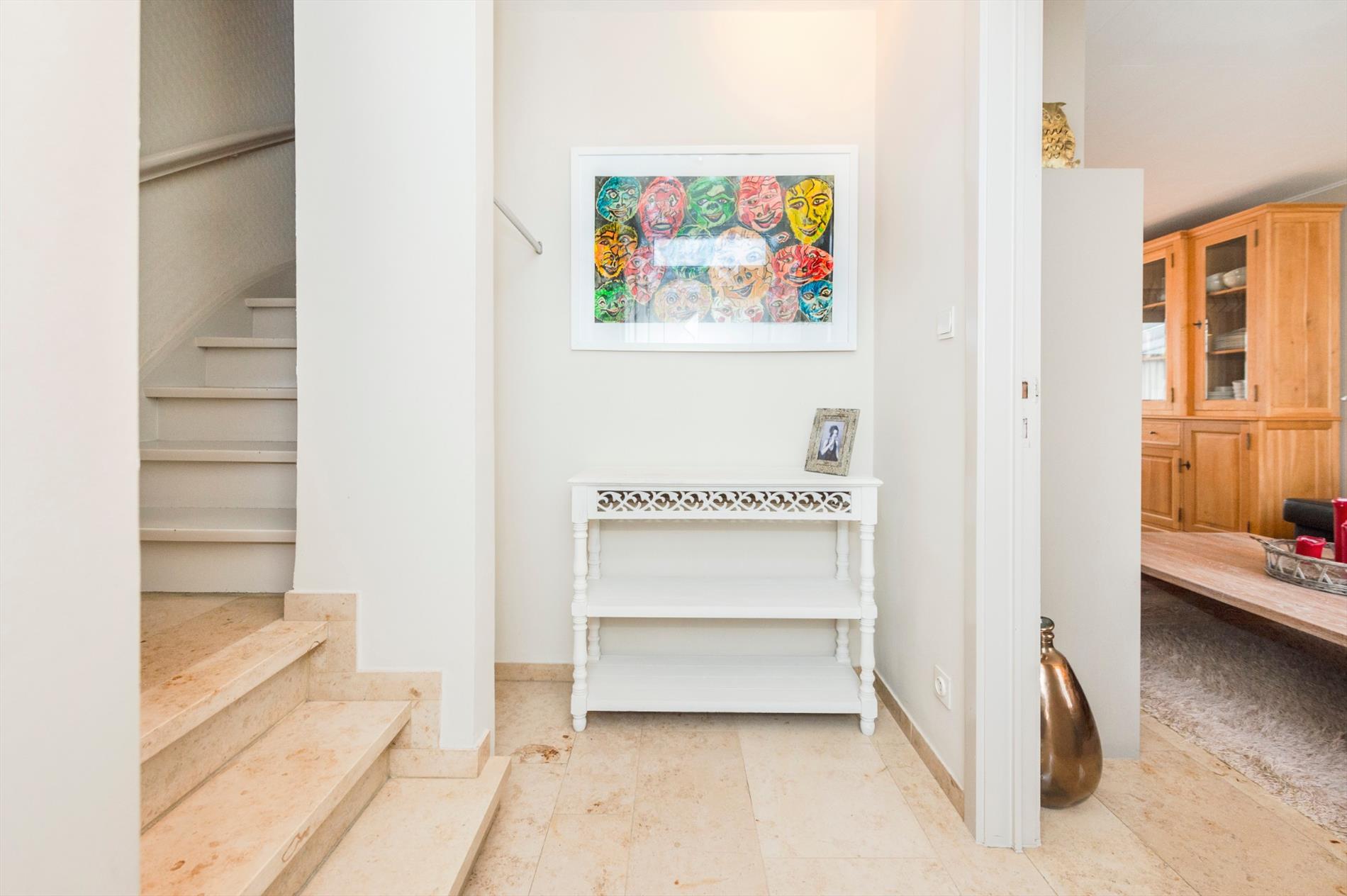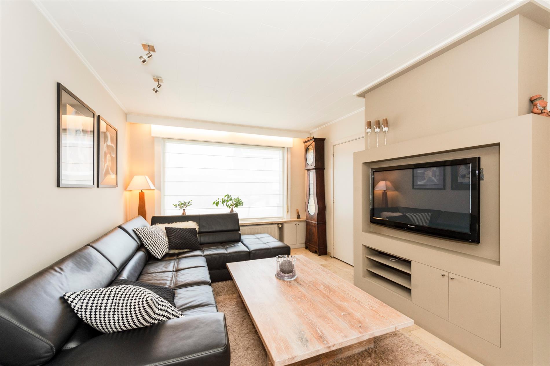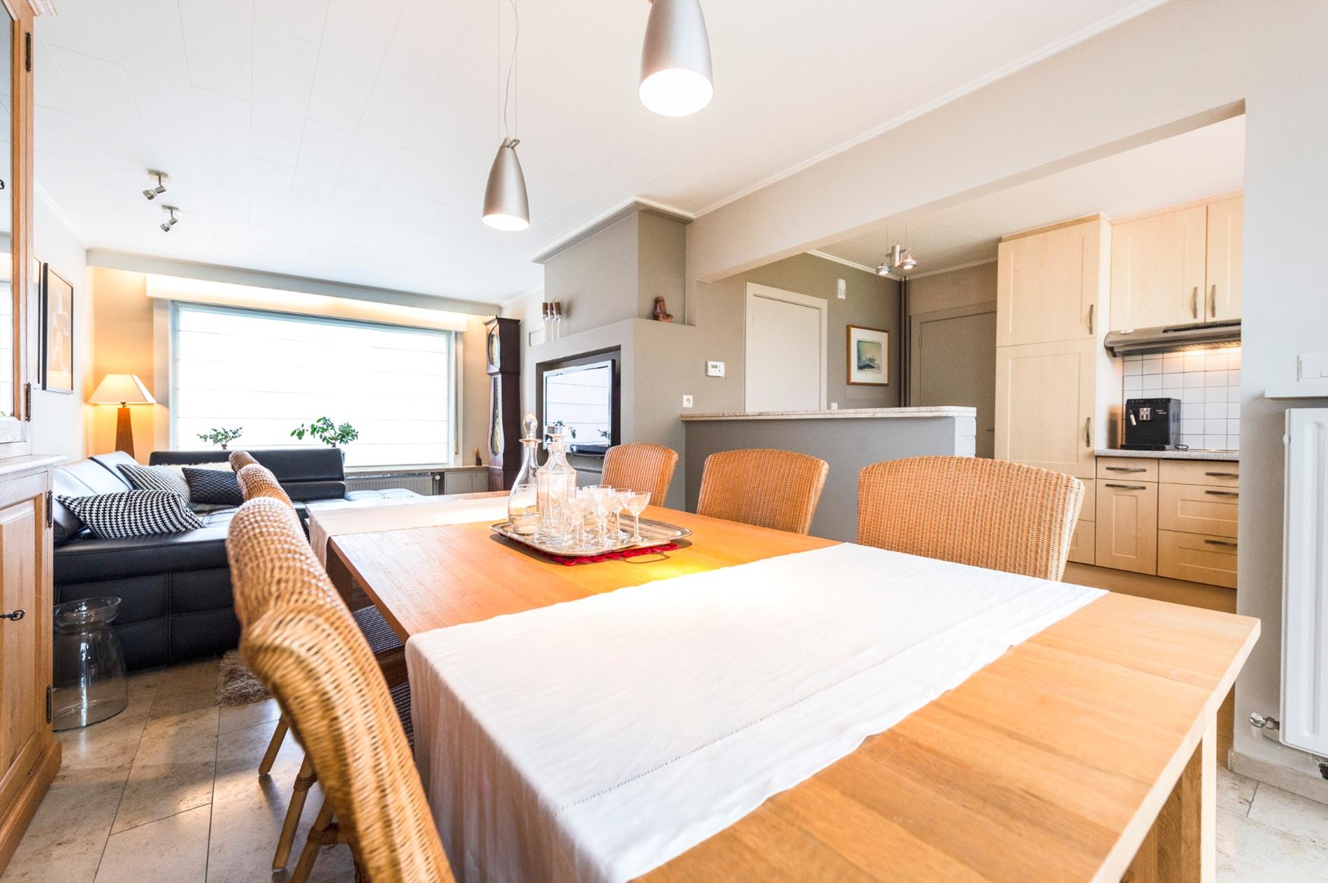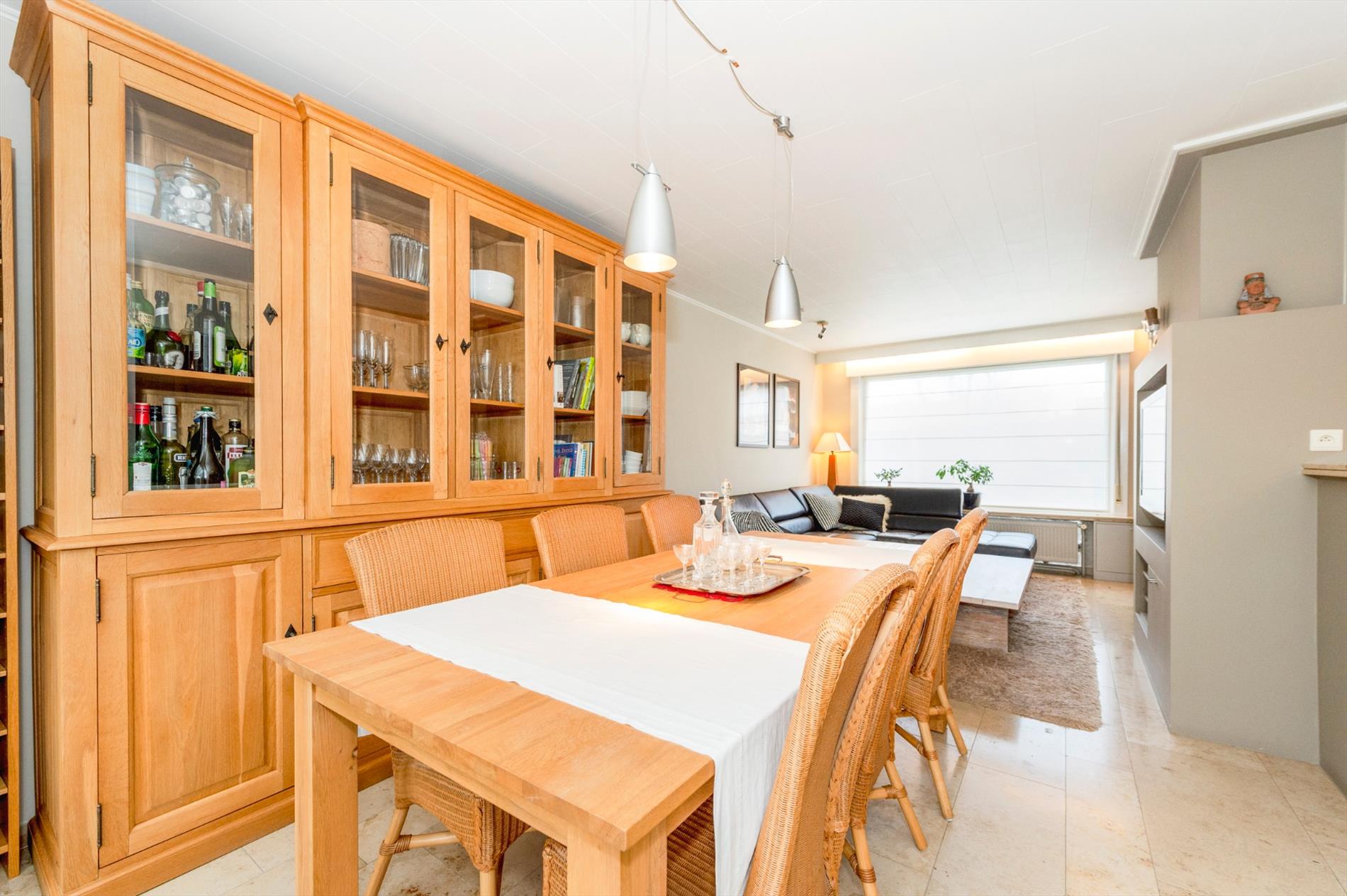 We komen binnen in de inkomhal met gastentoilet. De inkom heeft toegang tot de leefruimte met ingemaakt TV meubel. Aansluitend is een gerenoveerde ingerichte half open keuken (kookplaat | dampkap | spoelbak | frigo | vaatwasser). Zeer praktisch is de aansluitende berging alsook droge kelder.