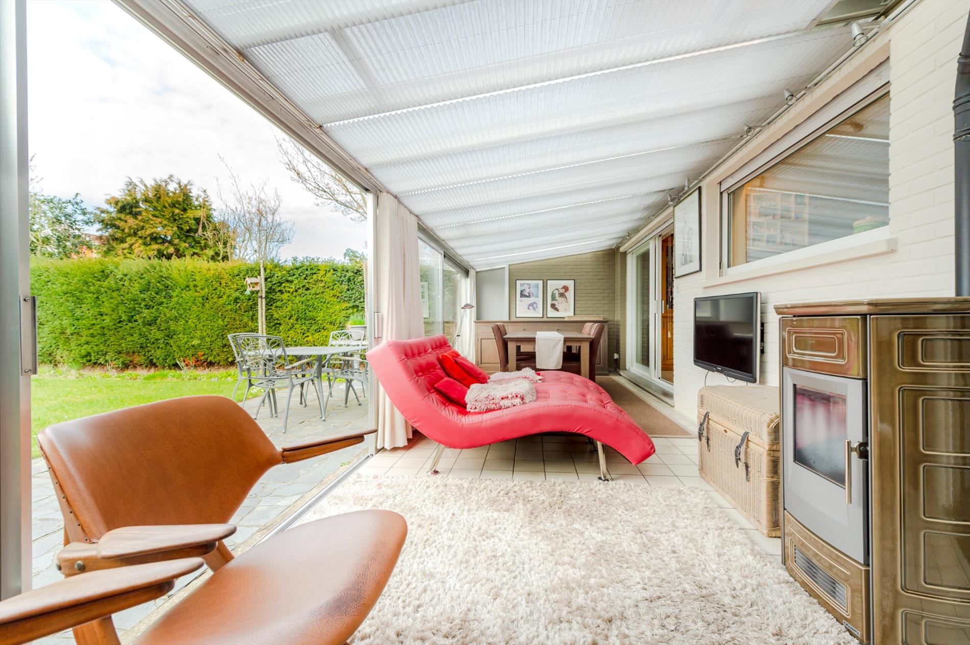 Verder is er nog een ruime veranda met pelletkachel alsook een garage (nieuwe automatische poort).