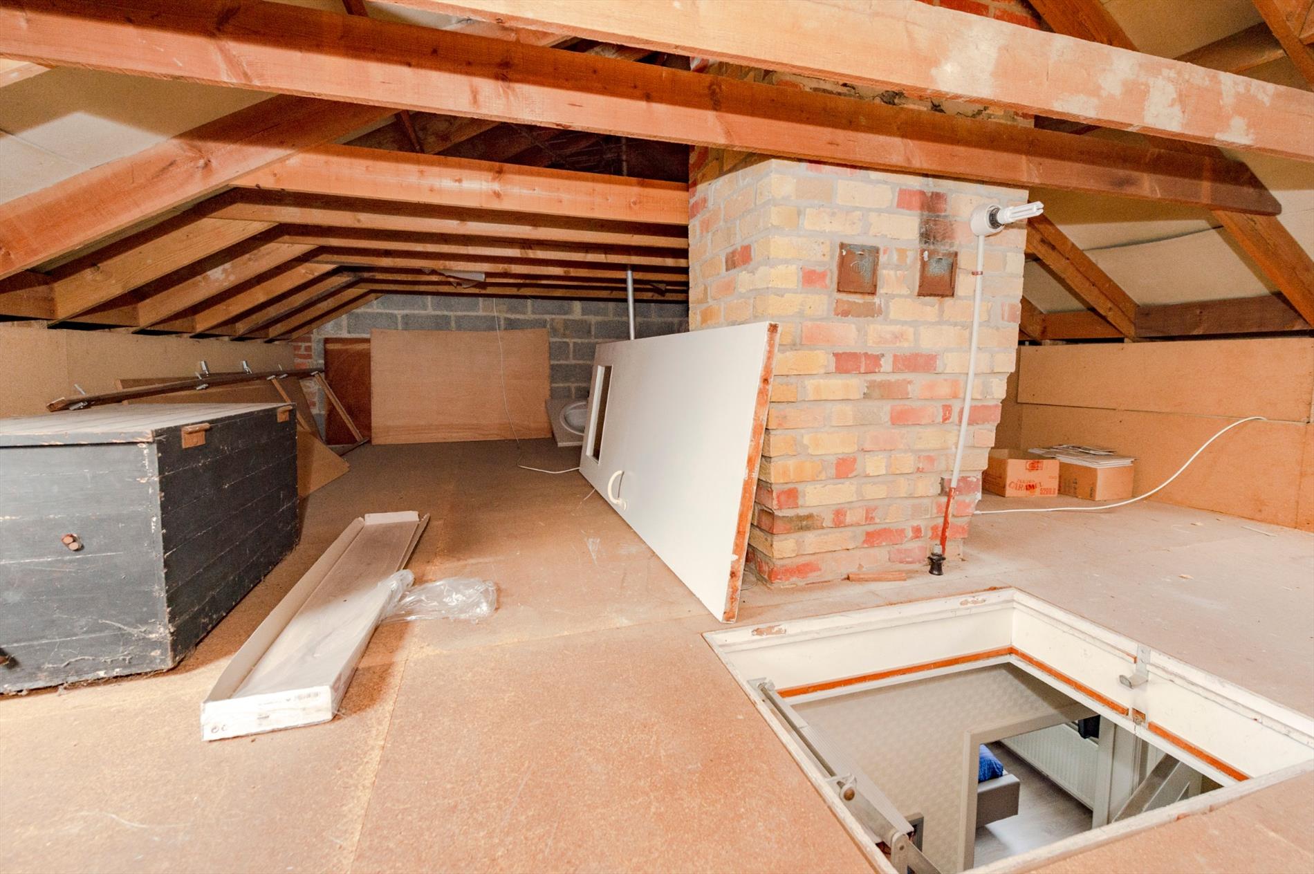 Via een uitschuifbare zoldertrap komen we op de zolder met een nuttig oppervlakte van 26,00 m².