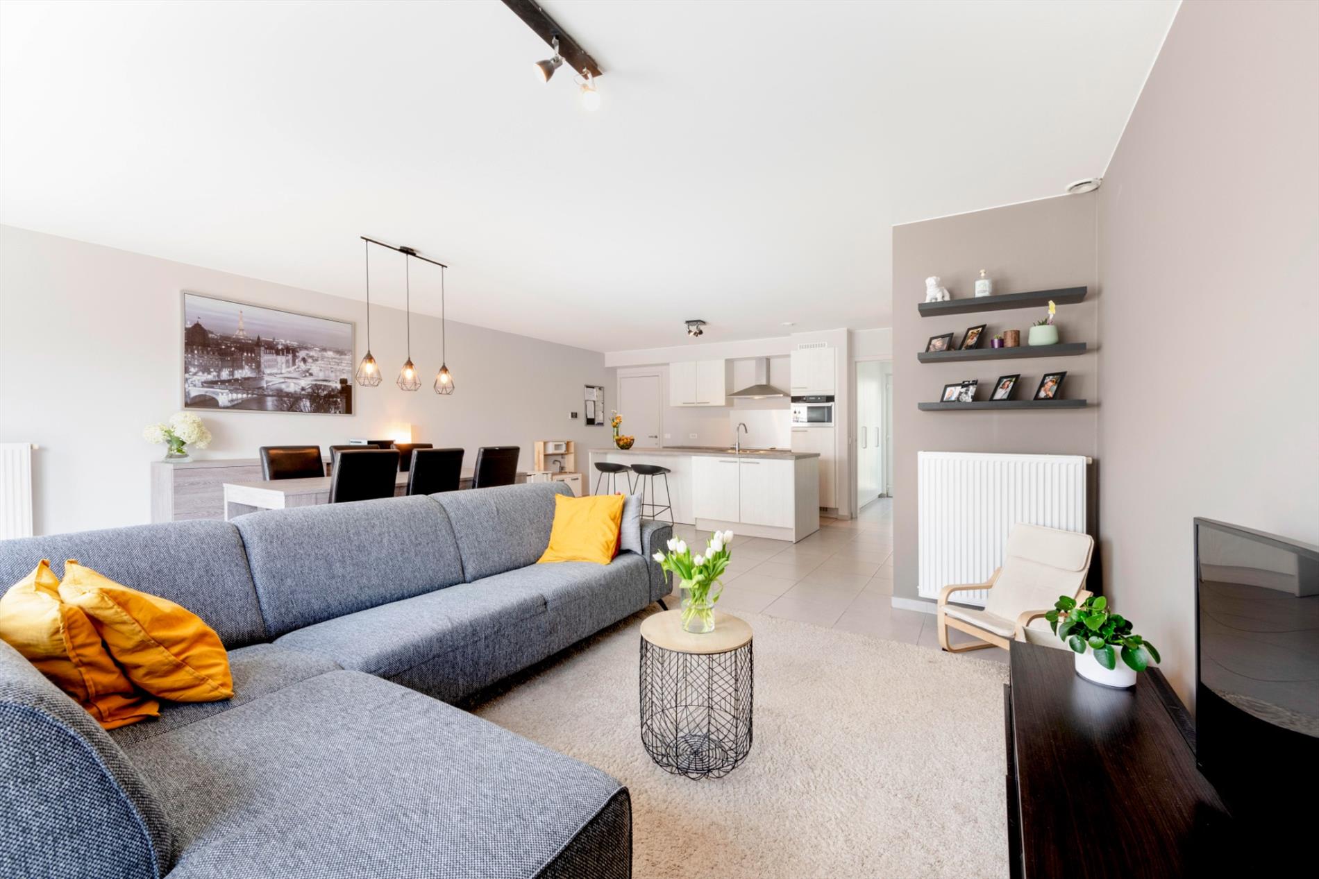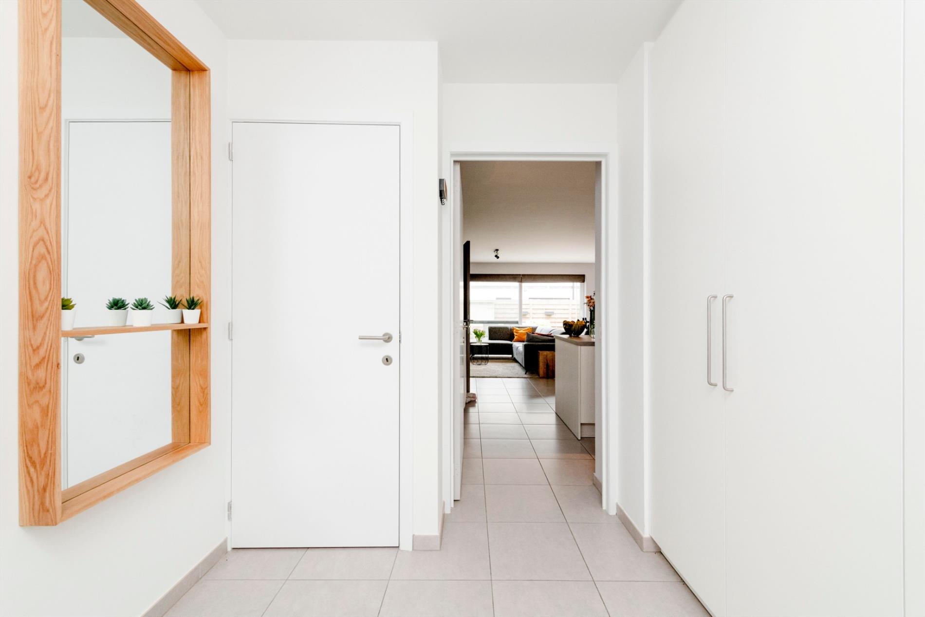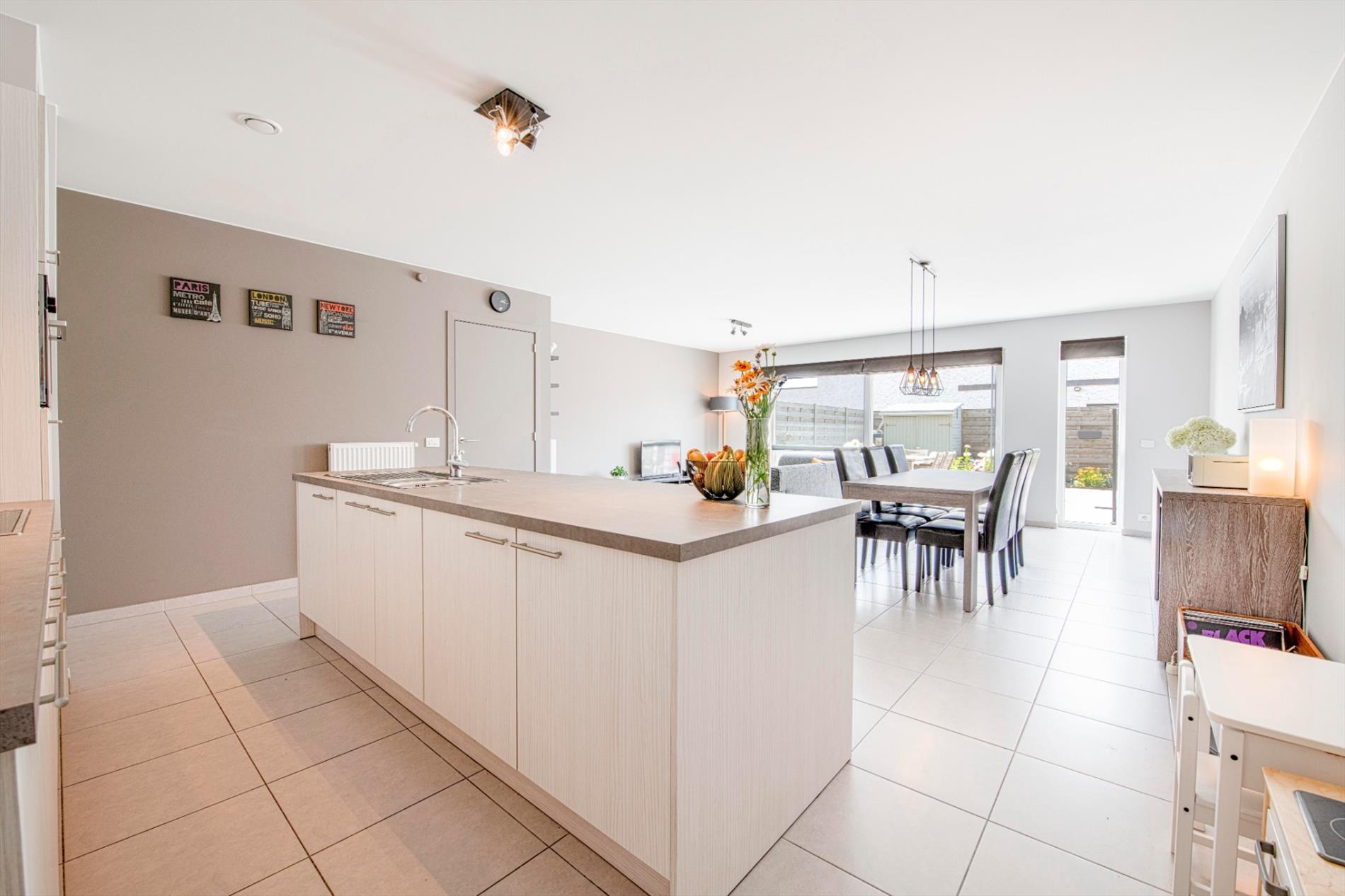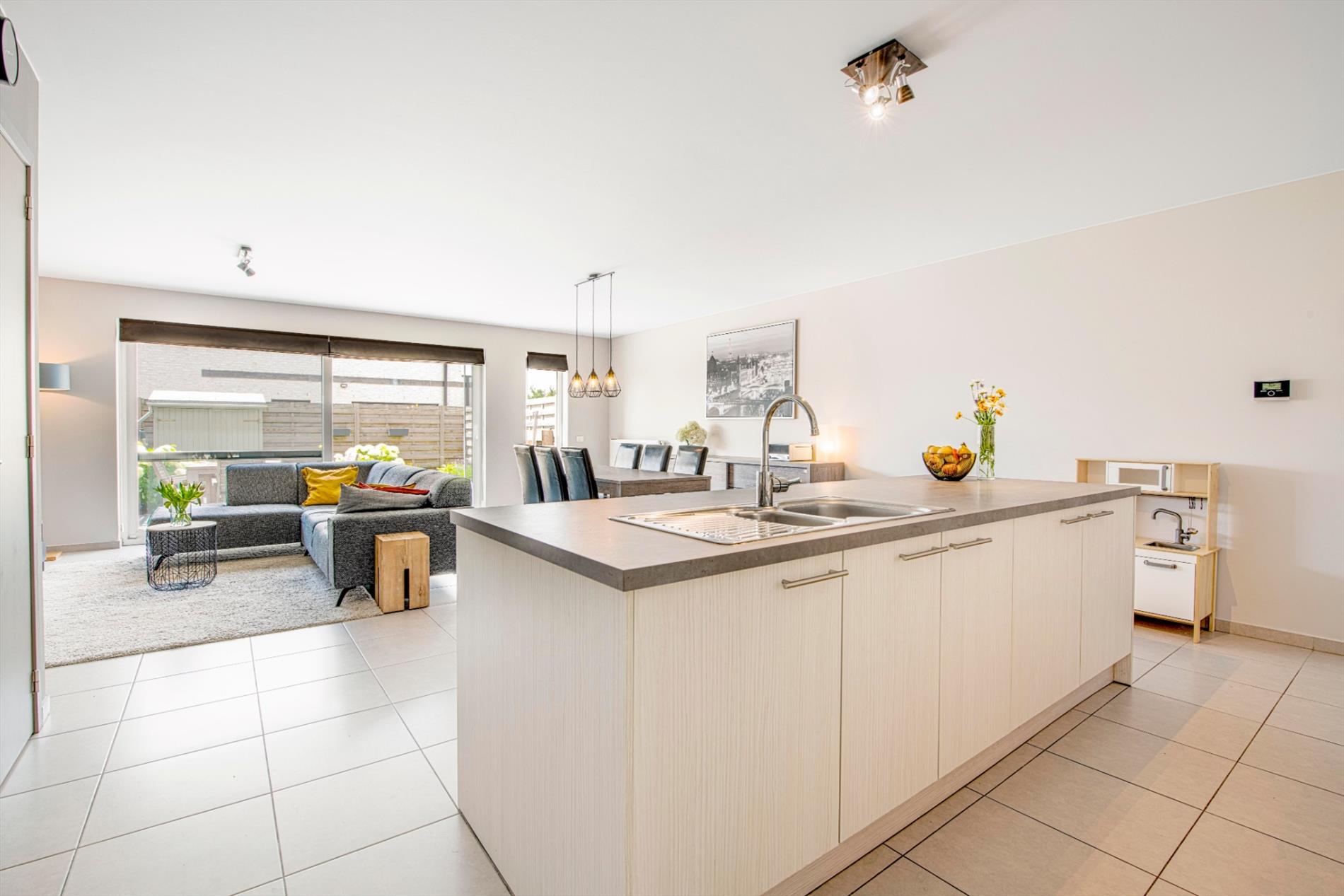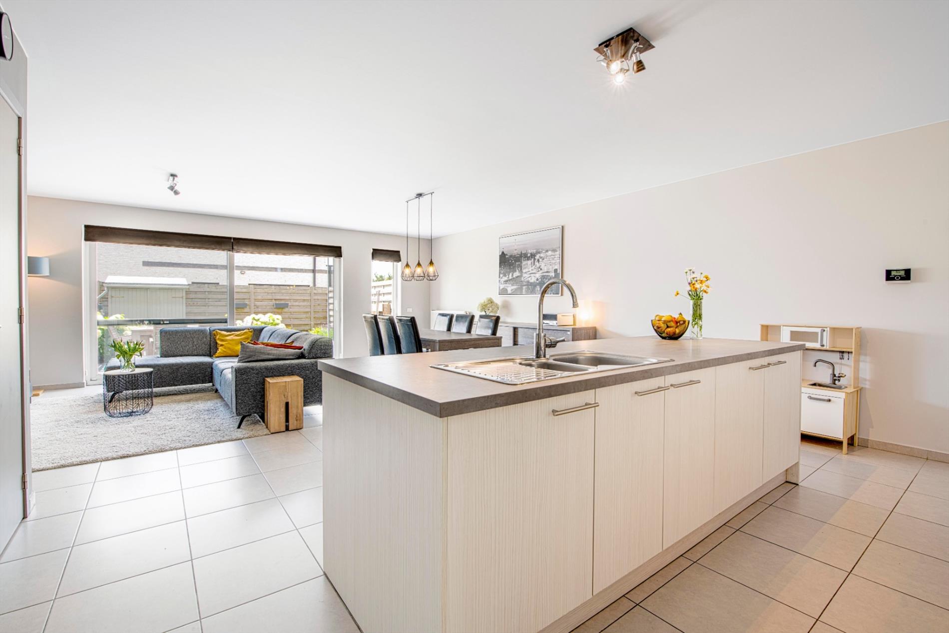 We komen binnen in de lichtrijke inkomhal van de woning met gastentoilet. Verder is er de leefruimte met open (ingerichte) keuken. Deze leefruimte beschikt over grote raampartijen die voor veel natuurlijk lichtinval zorgen alsook directe toegang tot de volledig aangelegde tuin. Recent is er een elektrische zonneluifel geïnstalleerd.
