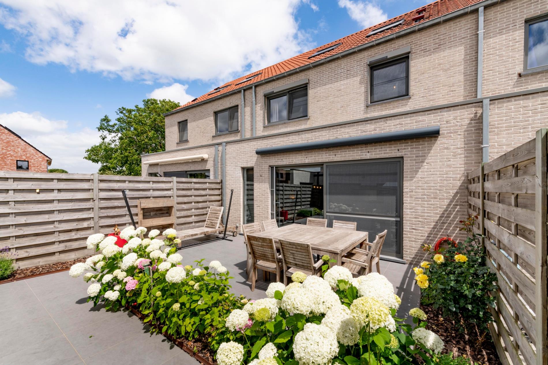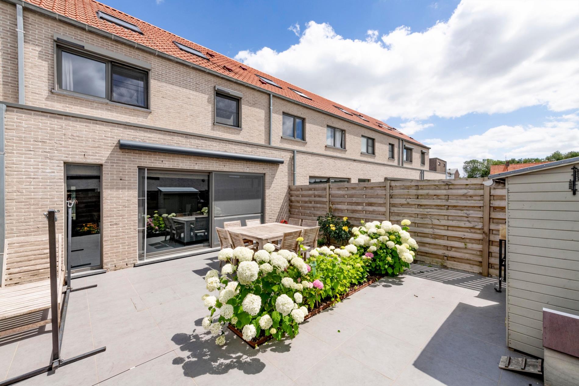 De tuin is onderhoudsvriendelijk met zongericht terras en tuinhuis. Tevens kindvriendelijk, volledig afgesloten met een houten omheining.