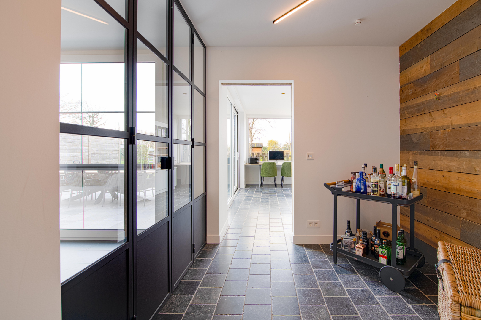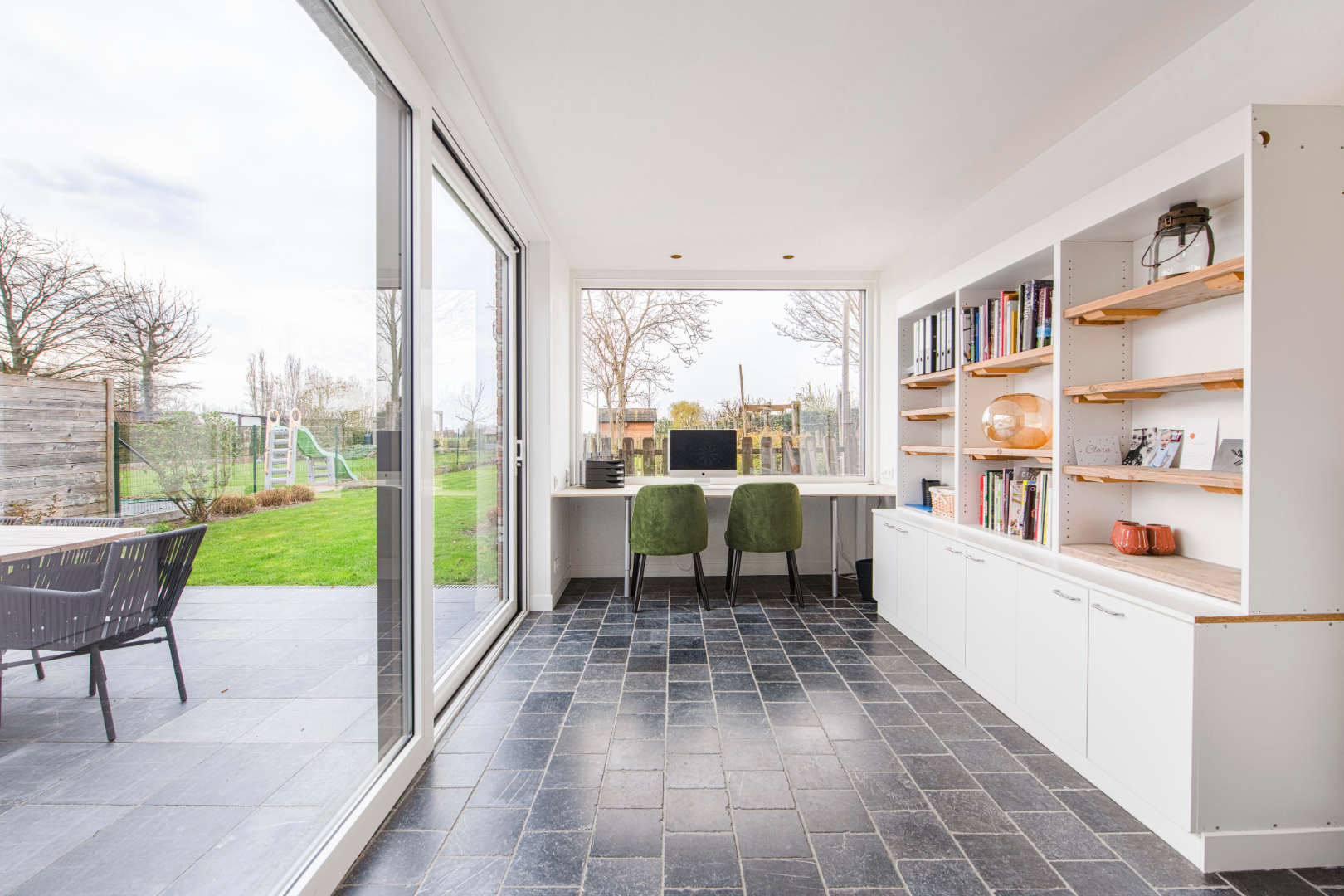 U kan het terras betreden zowel via de zitruimte als het bureel. Als laatste is er de garage (12 m²).