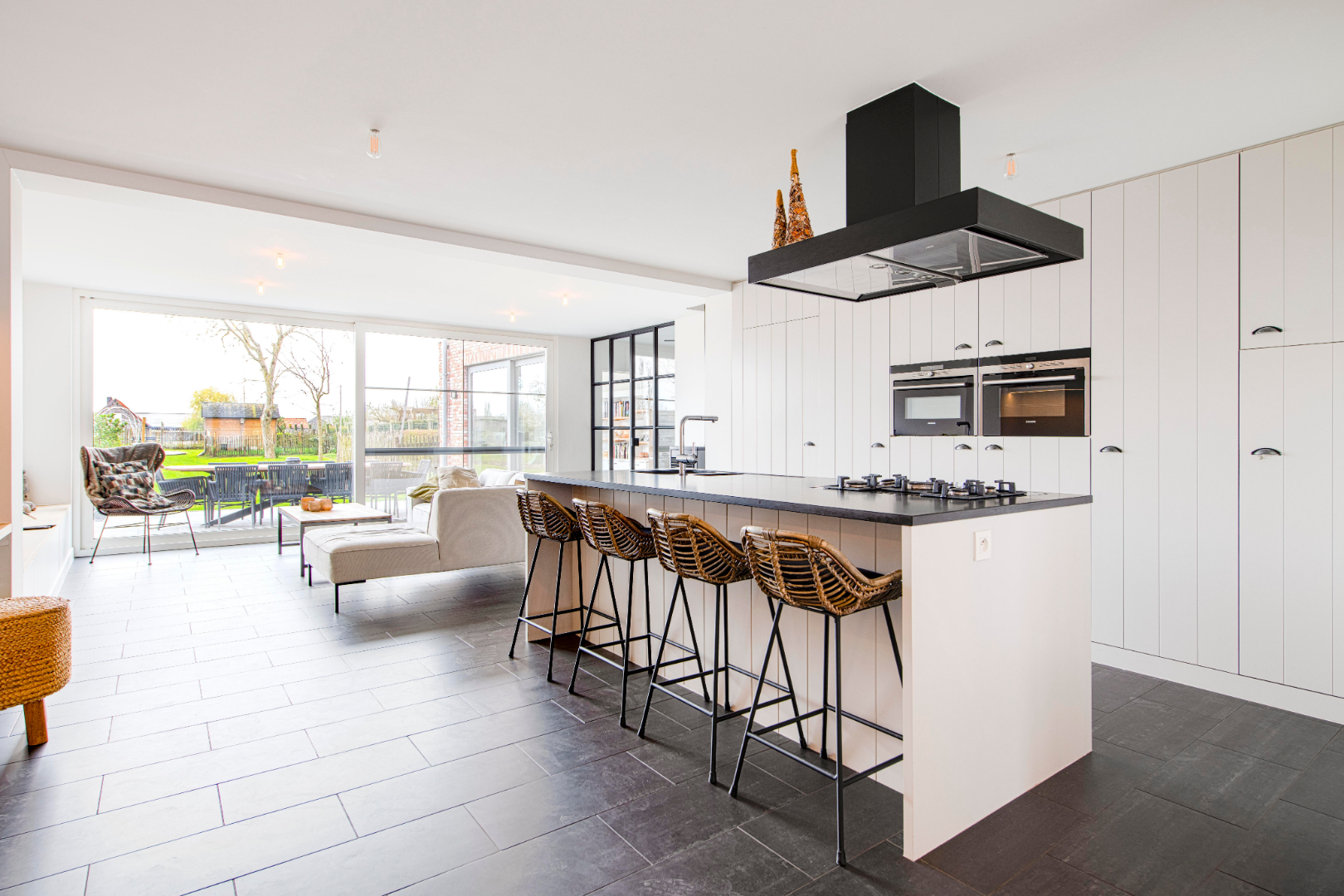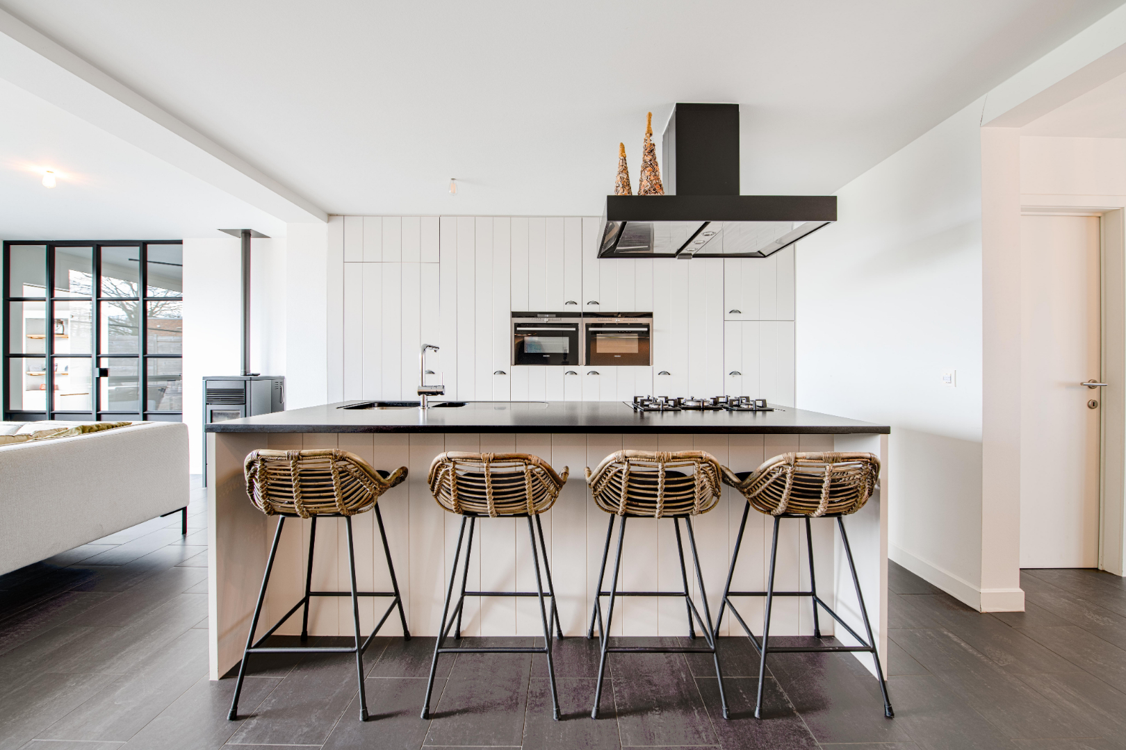 In het verlengde van de keuken is er de gezellige ruime zithoek (voorzien van ingemaakte kasten en pelletkachel). De grote raampartijen zorgen voor veel natuurlijk lichtinval alsook een prachtig zicht op de tuin!