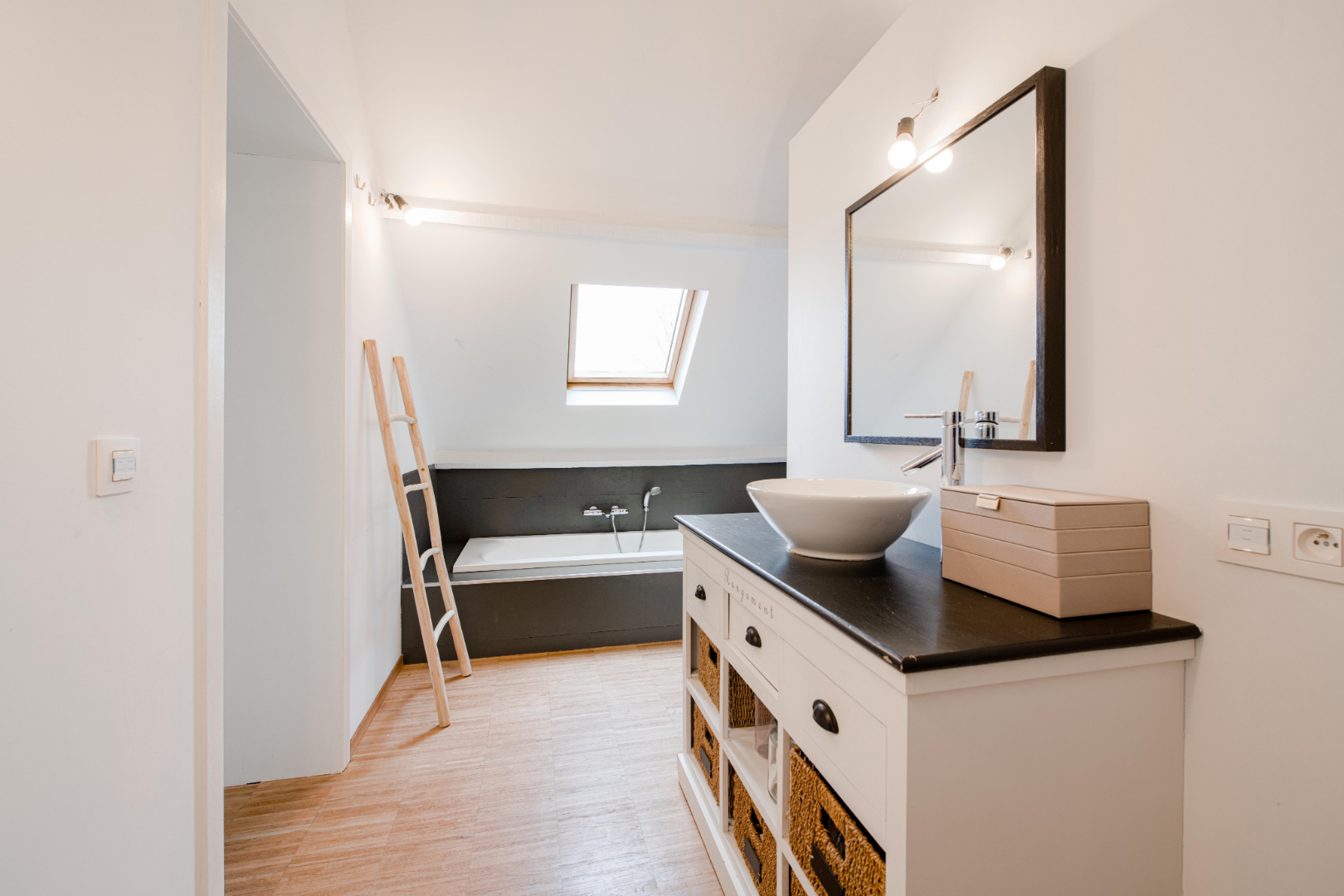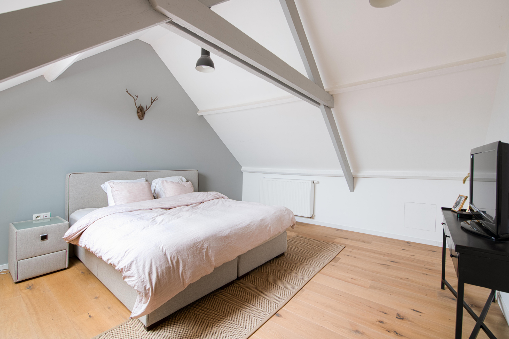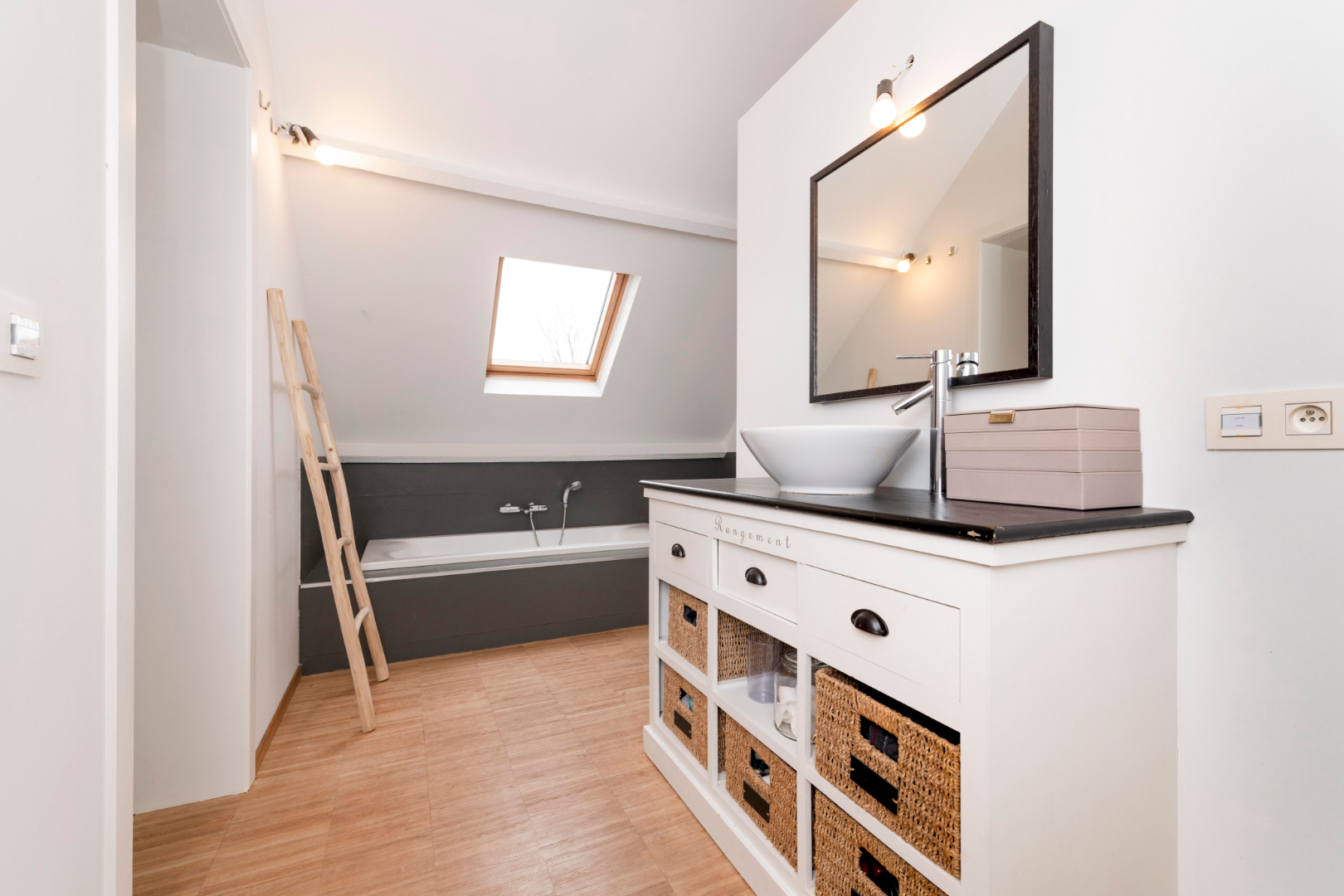 De zolderruimte is toegankelijk met een vaste trap en omvat een bergruimte en een prachtige "master bedroom". Dit verdiep is open tot in de nok.
