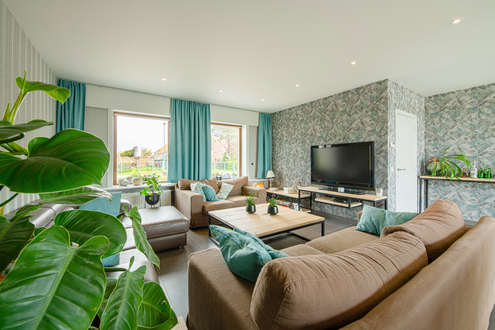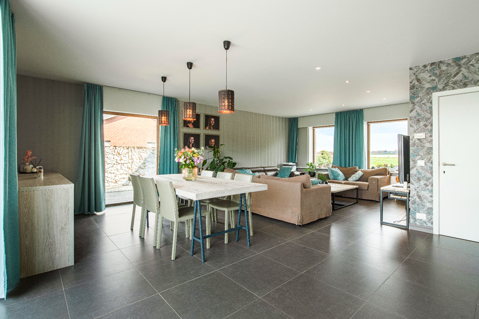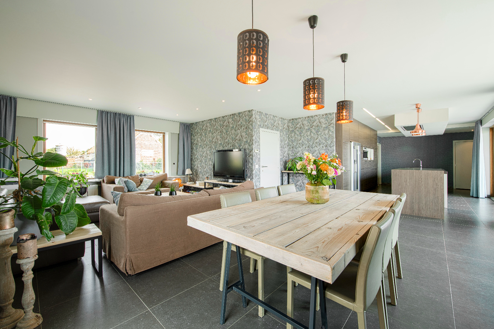U komt de woning binnen via de inkom met gastentoilet. Links is er toegang tot bureel en een gelijkvloerse slaapkamer. Rechts komt U in de leefruimte (44 m²) met een prachtige glaspartij die U directe toegang biedt tot de tuin en tevens zorgt voor enorme lichtinval!