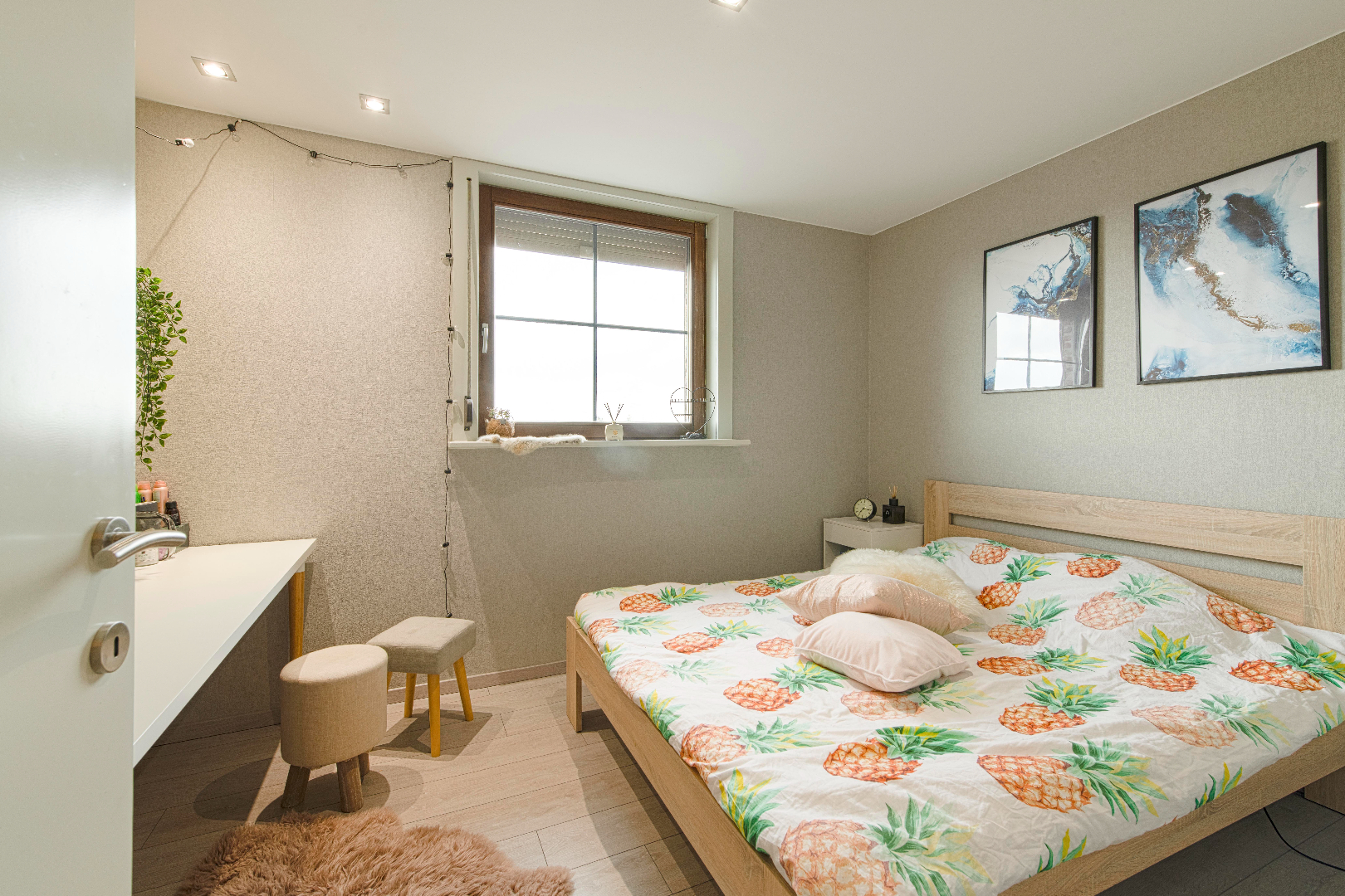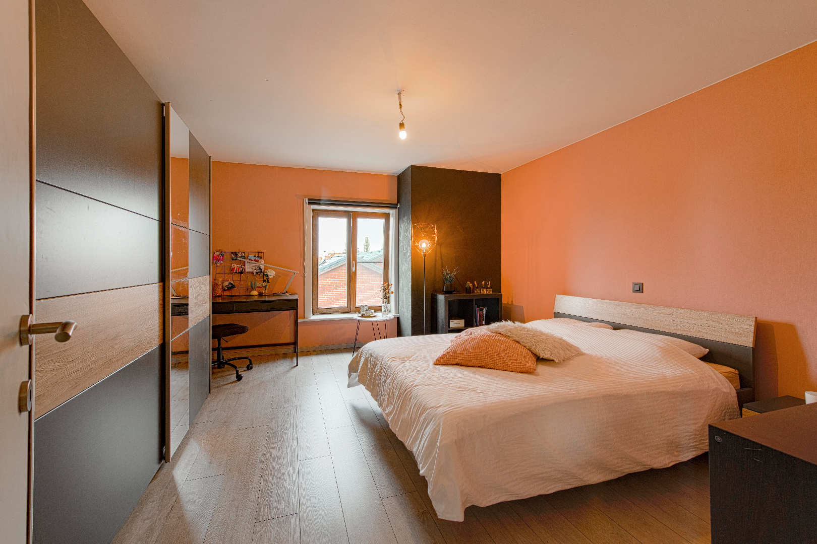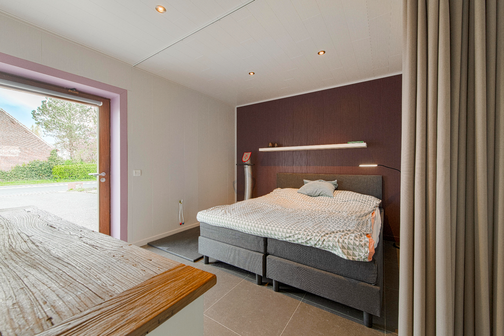 U komt de woning binnen via de inkom met gastentoilet. Links is er toegang tot bureel en een gelijkvloerse slaapkamer. Rechts komt U in de leefruimte (44 m²) met een prachtige glaspartij die U directe toegang biedt tot de tuin en tevens zorgt voor enorme lichtinval!
