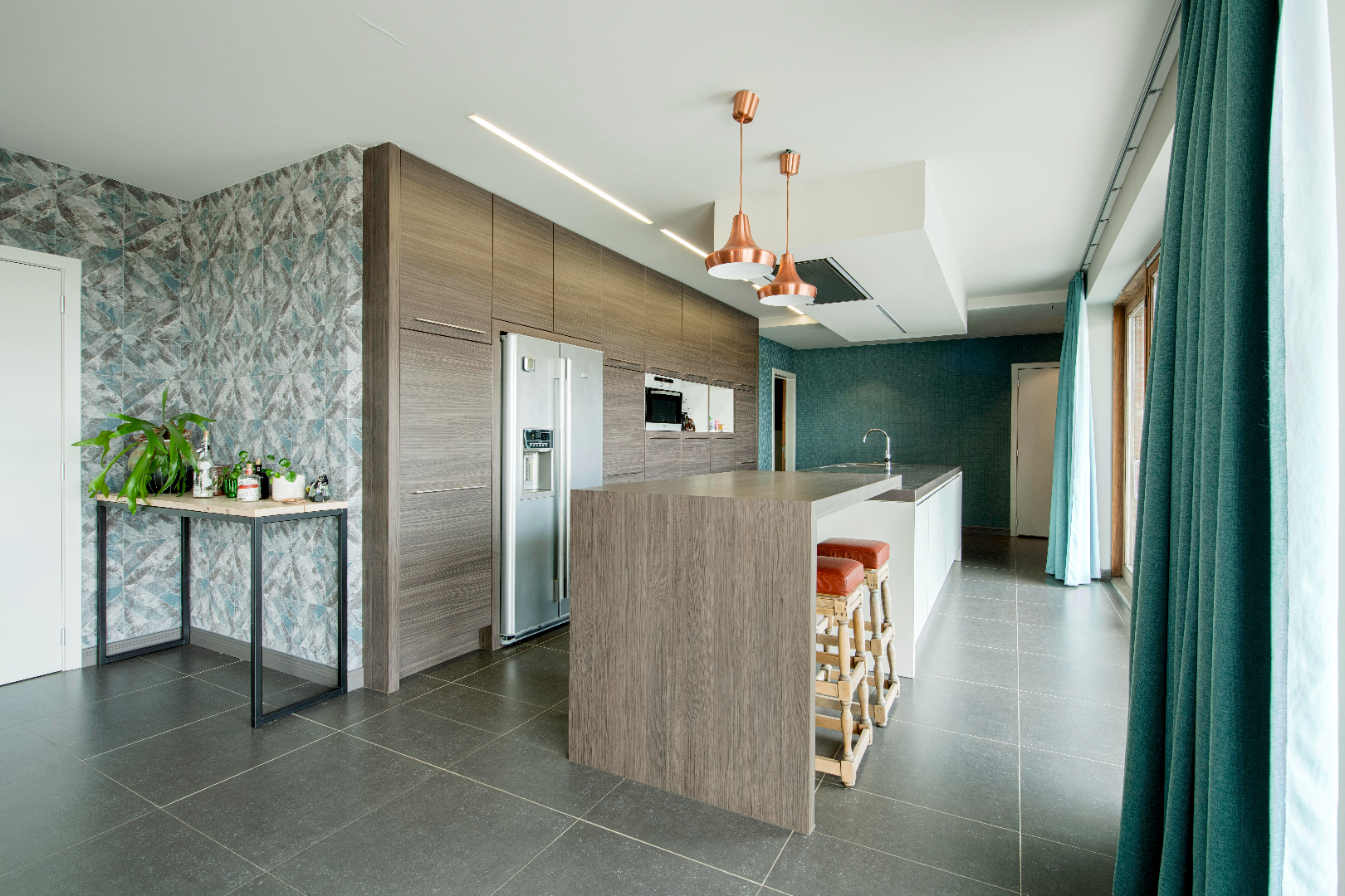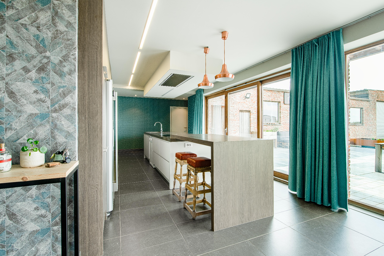 De hart van de woning is de ruime volledig ingerichte open keuken (inductie kookplaat | dampkap | dubbele spoelbak | combi-oven | vaatwasser | frigo). Praktisch is de aansluitende koele berging (10 m²), de wasplaats (9 m²). Vanuit de woning is er toegang tot de dubbele garage.
