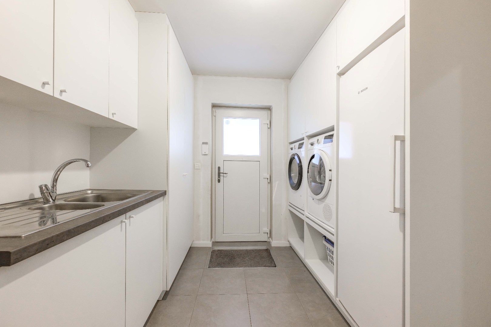 Verder beschikt het gelijkvloers over een praktische kelderberging (droge kelder), een ingerichte wasplaats (8,50 m²) met aansluitingen voor wasmachine en droogkast, een spoelbak en eveneens toegang tot de tuin. De volledig uitgeruste badkamer omvat een inloopdouche, dubbele lavabo met meubel en ligbad.