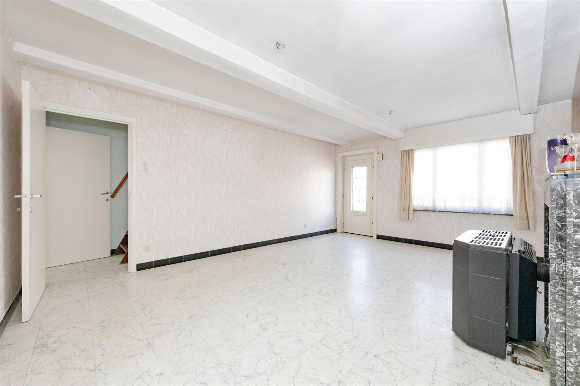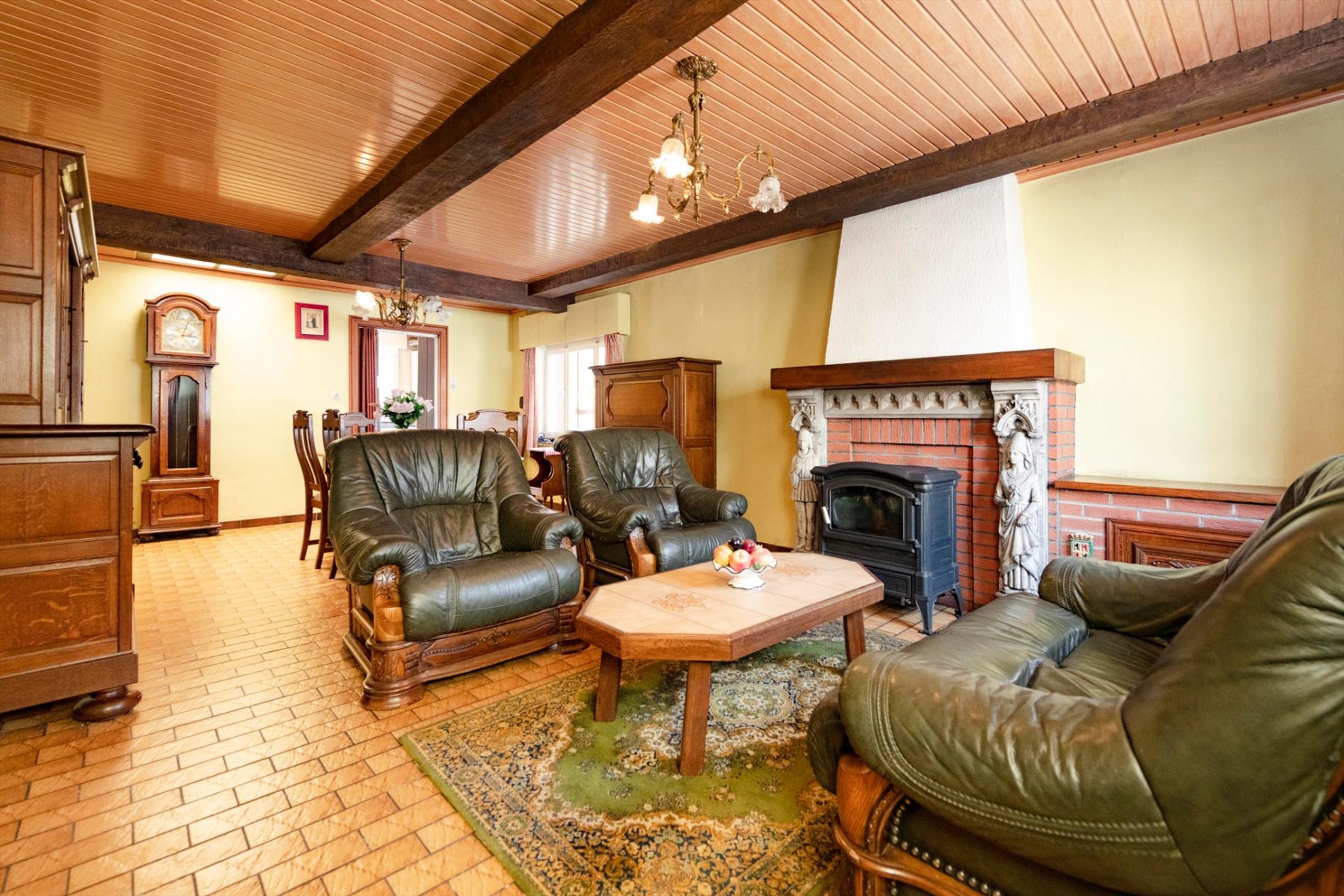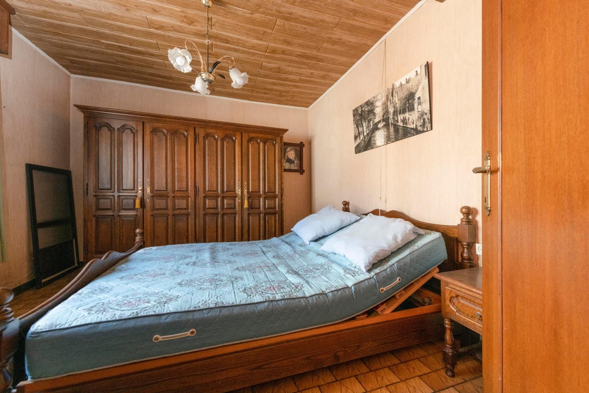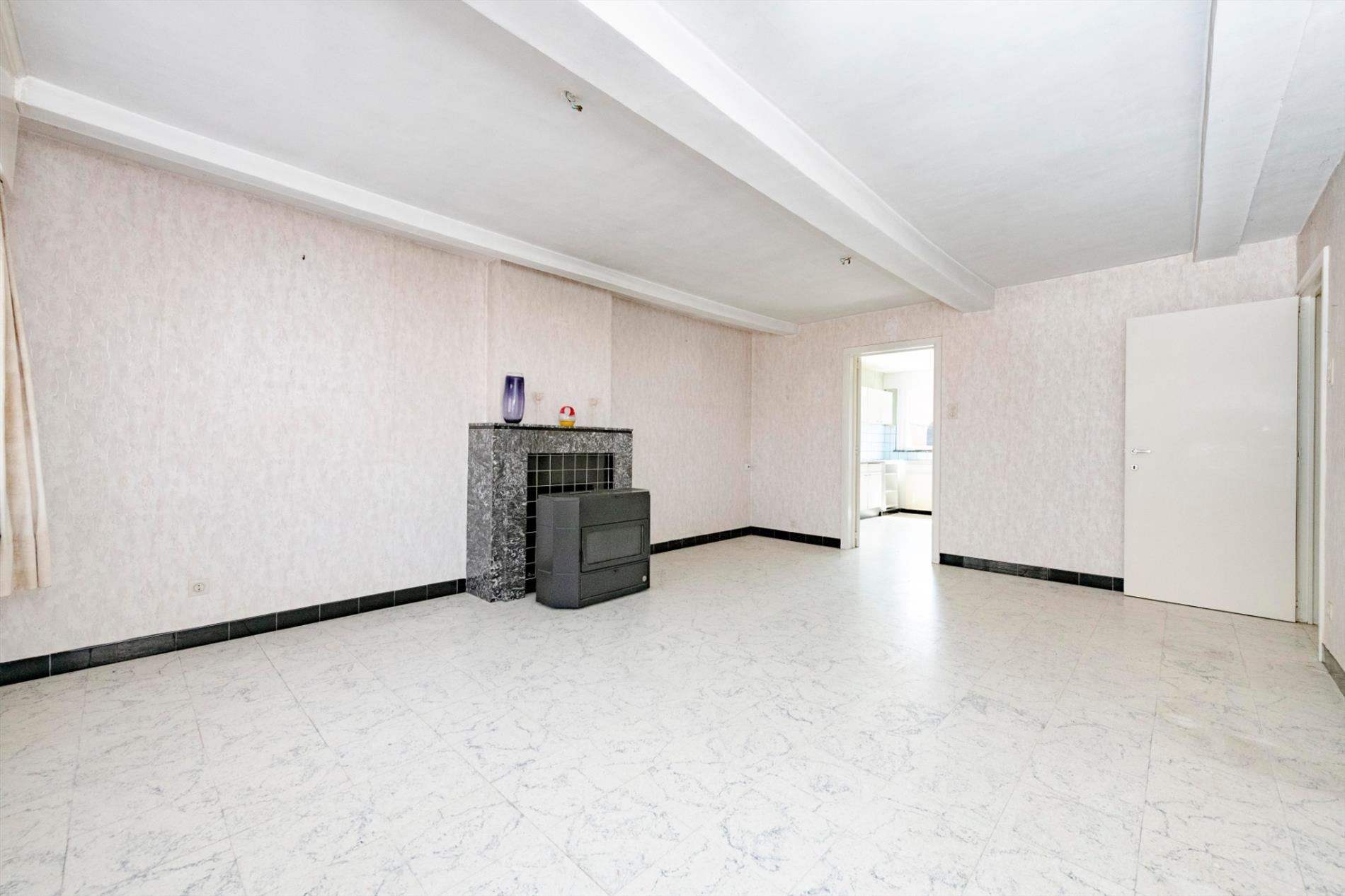 We komen binnen in de ruime leefruimte met een gezellige kachel die rechtstreeks toegang biedt tot de ruime keuken ( spoelbak) alsook de eerste slaapkamer. Het verdiep bestaat uit twee delen waarvan één reeds ingericht als ruime slaapkamer. In deze woning is er op heden geen badkamer.