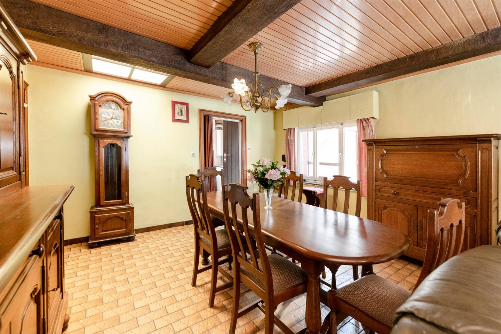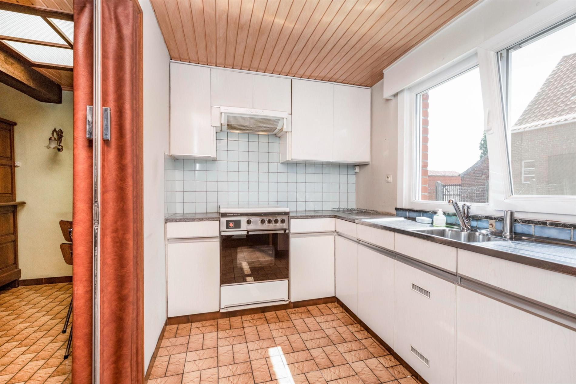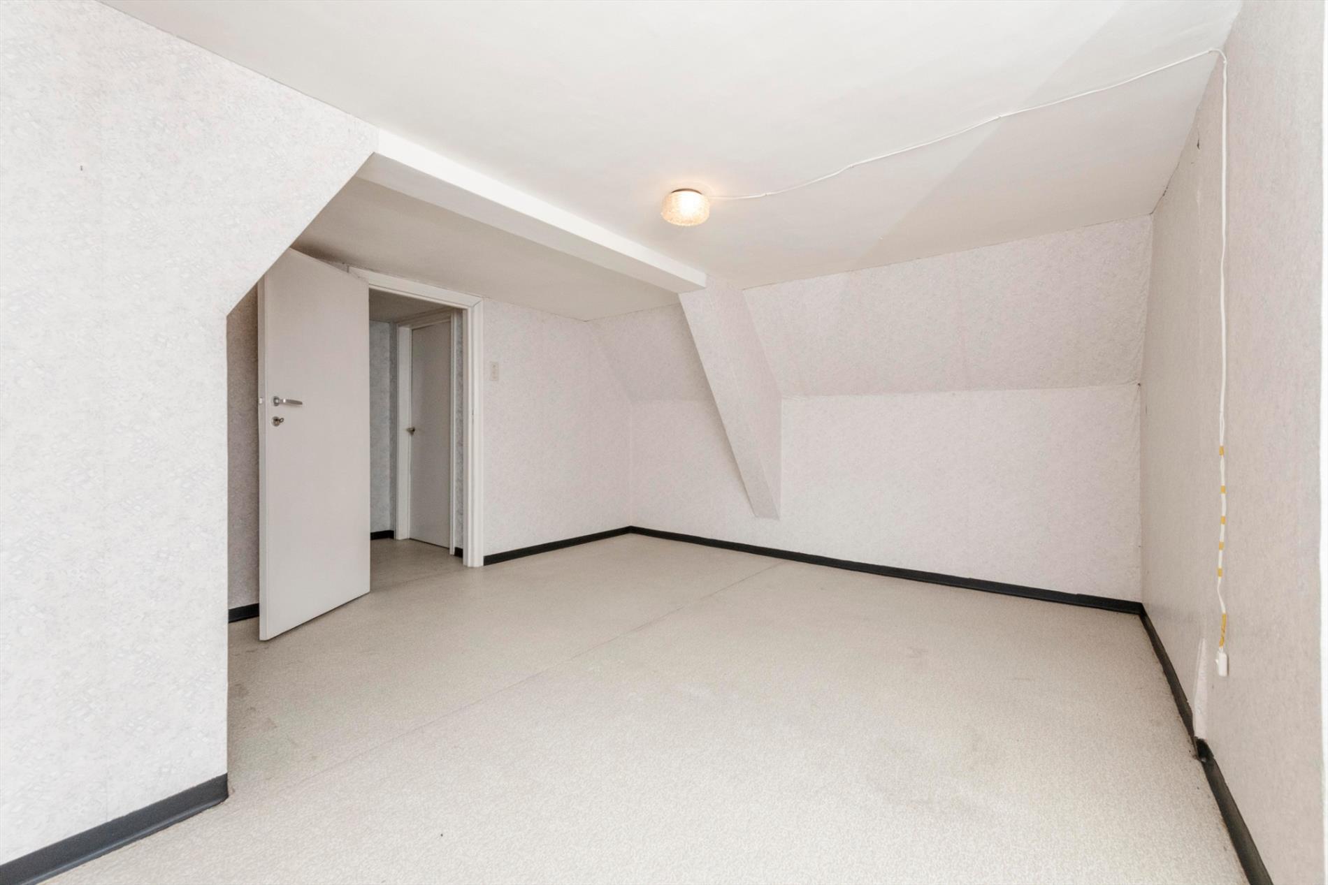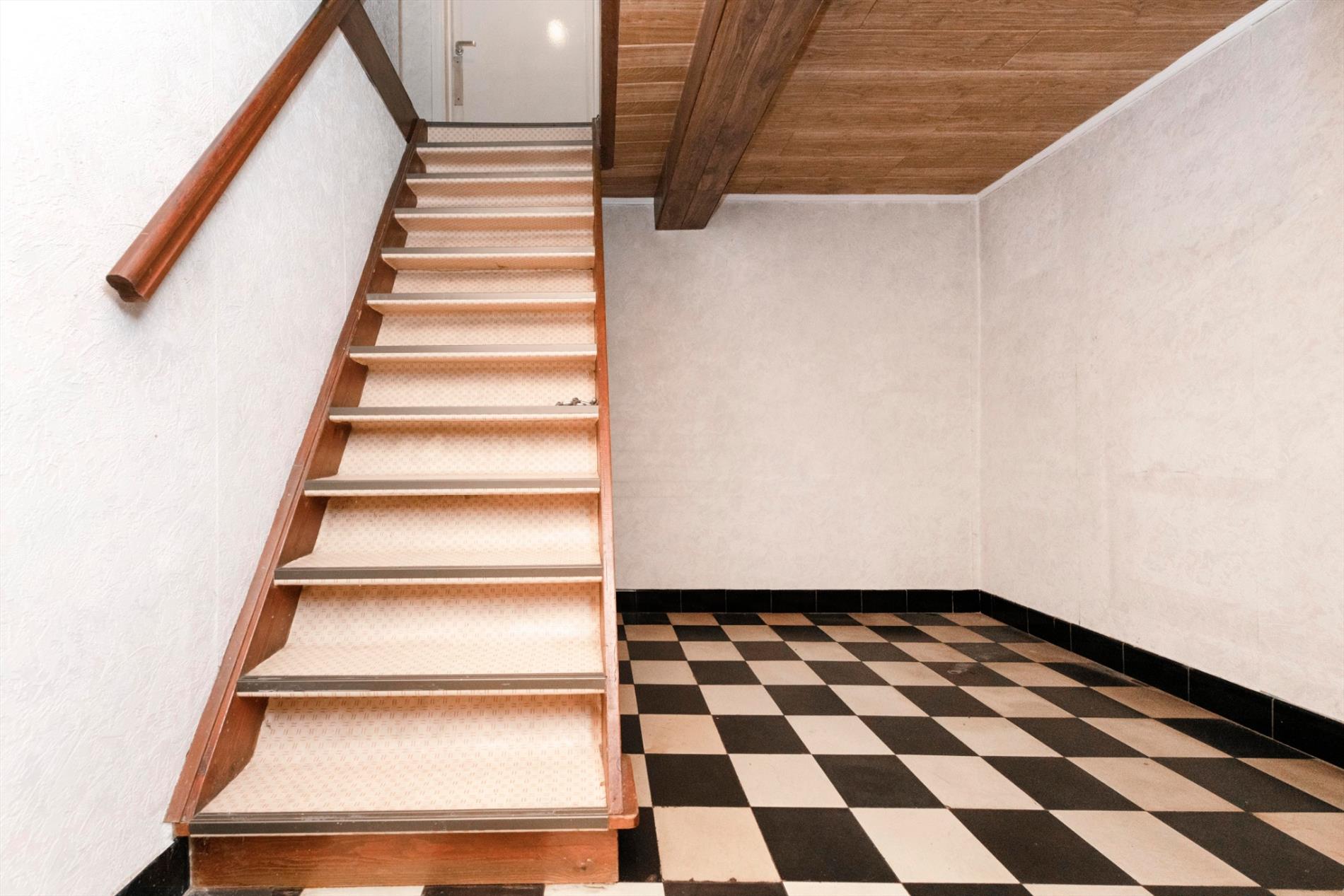 We komen binnen in de ruime leefruimte met een gezellige kachel die rechtstreeks toegang biedt tot de ruime keuken ( spoelbak) alsook de eerste slaapkamer. Het verdiep bestaat uit twee delen waarvan één reeds ingericht als ruime slaapkamer. In deze woning is er op heden geen badkamer.