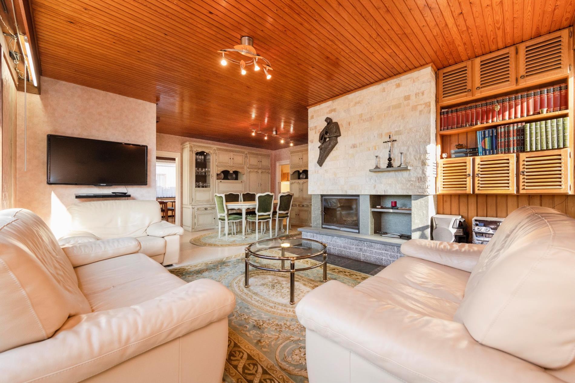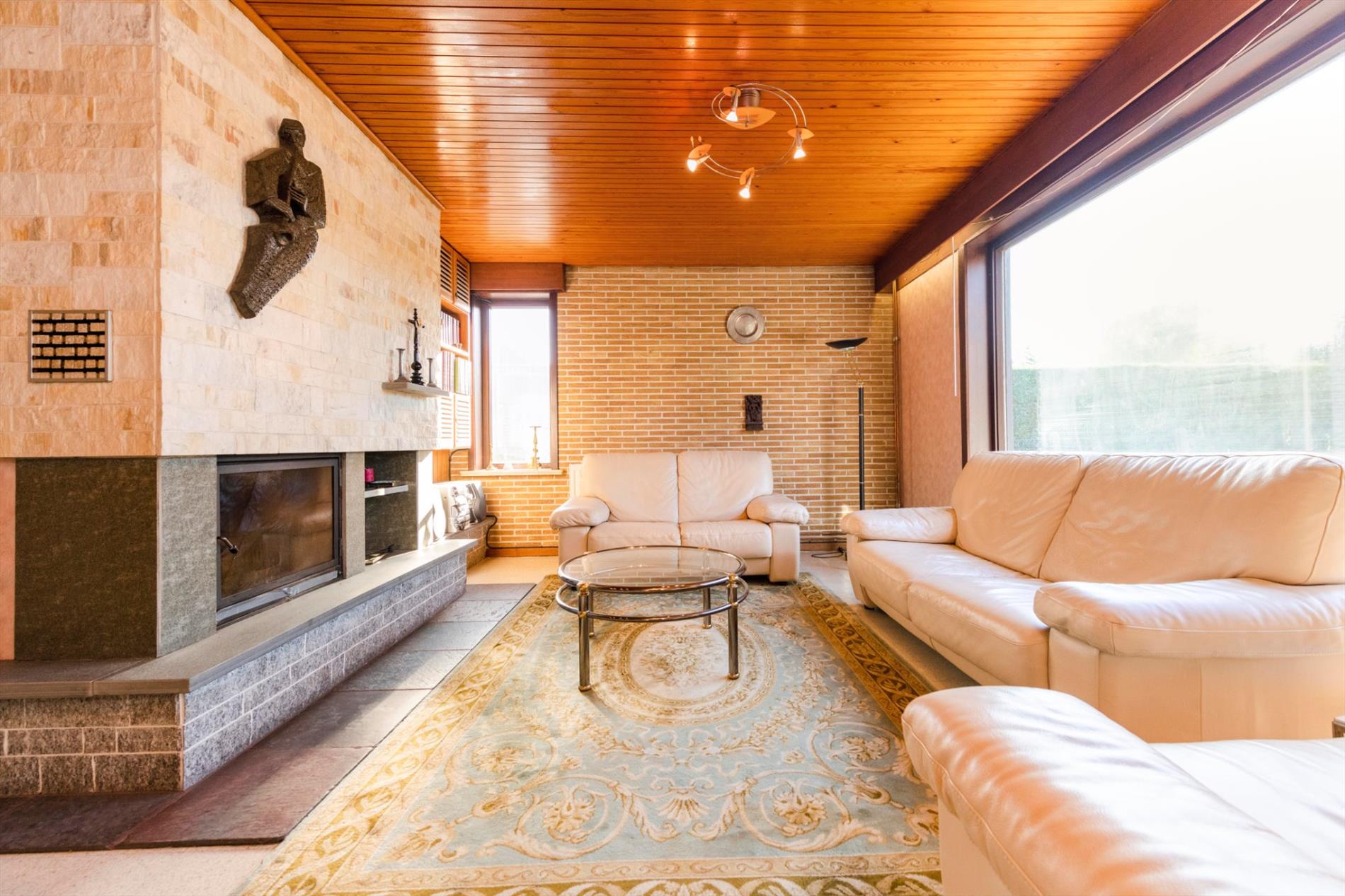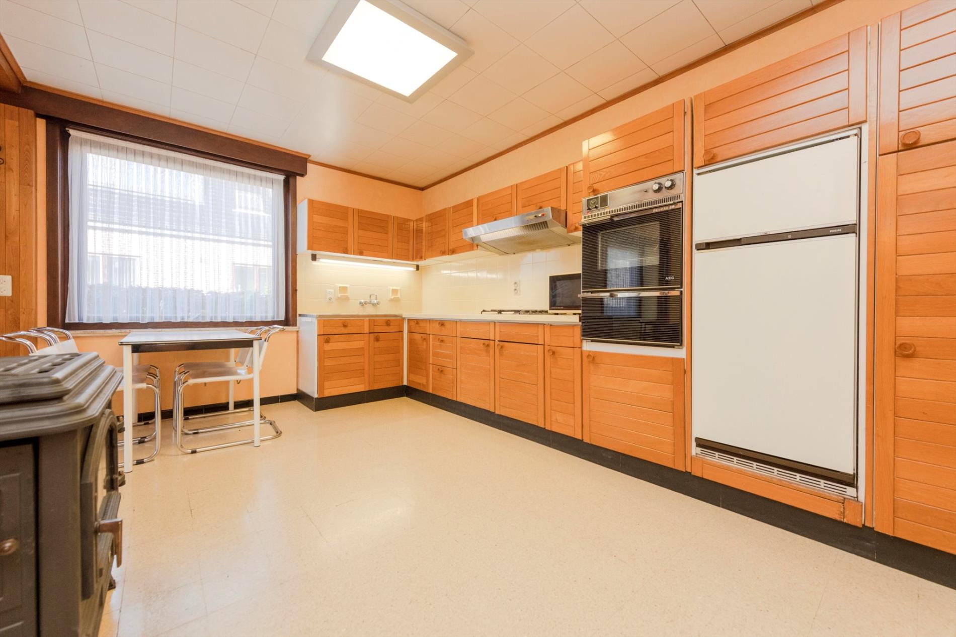 We komen binnen in een ruime inkomhal met gastentoilet die rechtstreeks toegang biedt tot de keuken, leefruimte en nachthall. De leefruimte (28m²) heeft grote raampartijen die voor natuurlijk lichtinval en een mooi zicht op de tuin zorgen. De leefruimte is tevens voorzien van een mooie schouw met houtcassette. Via de leefruimte hebt U toegang tot de ingerichte leef keuken (kookplaat | dampkap | dubbele spoelbak | oven | frigo) met ontbijthoek met een oppervlakte van maar liefst 33m² . Vanuit de keuken is er tevens toegang tot de veranda.