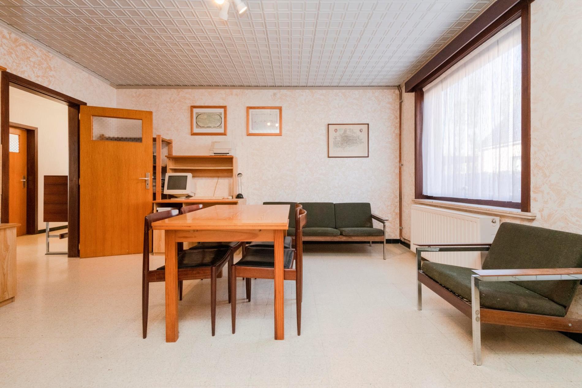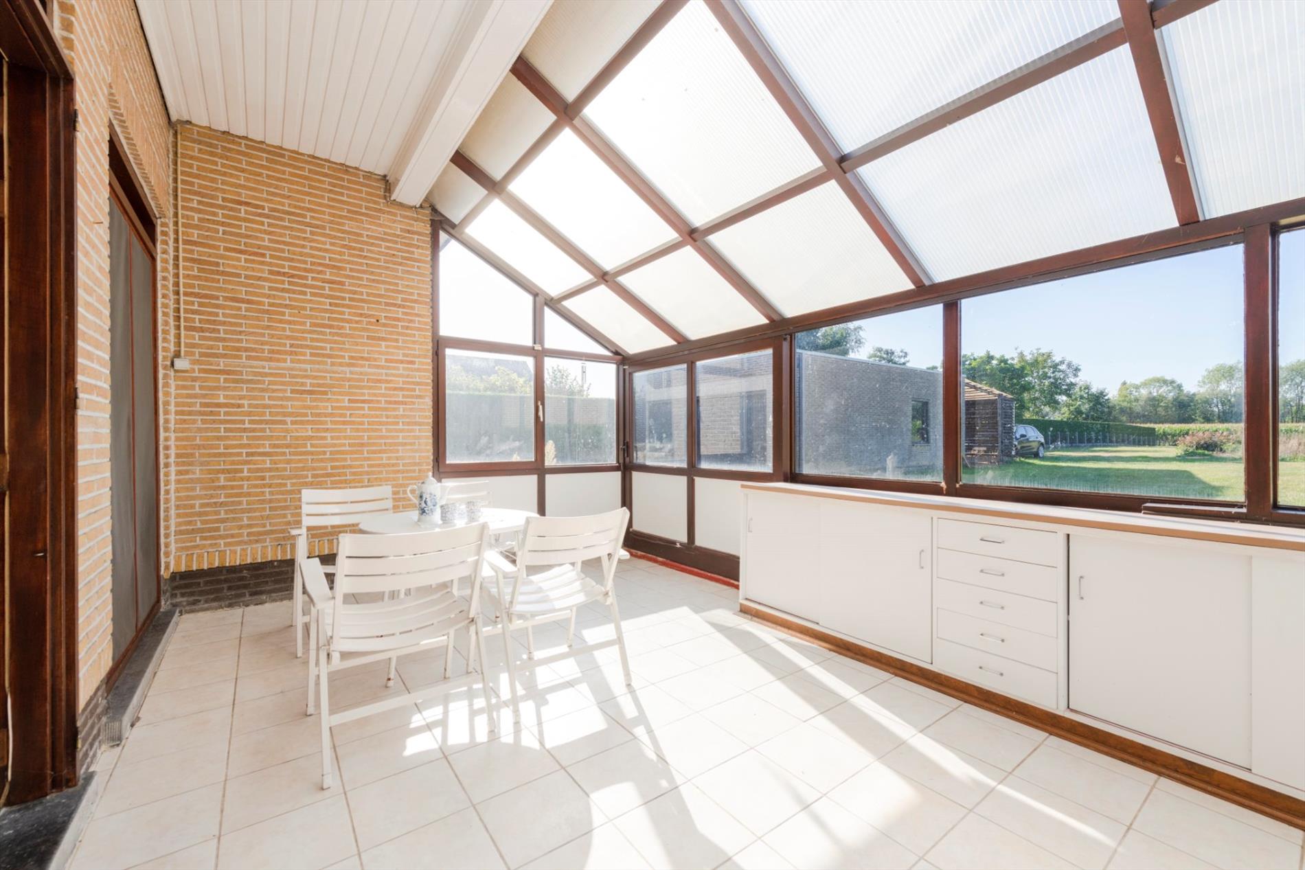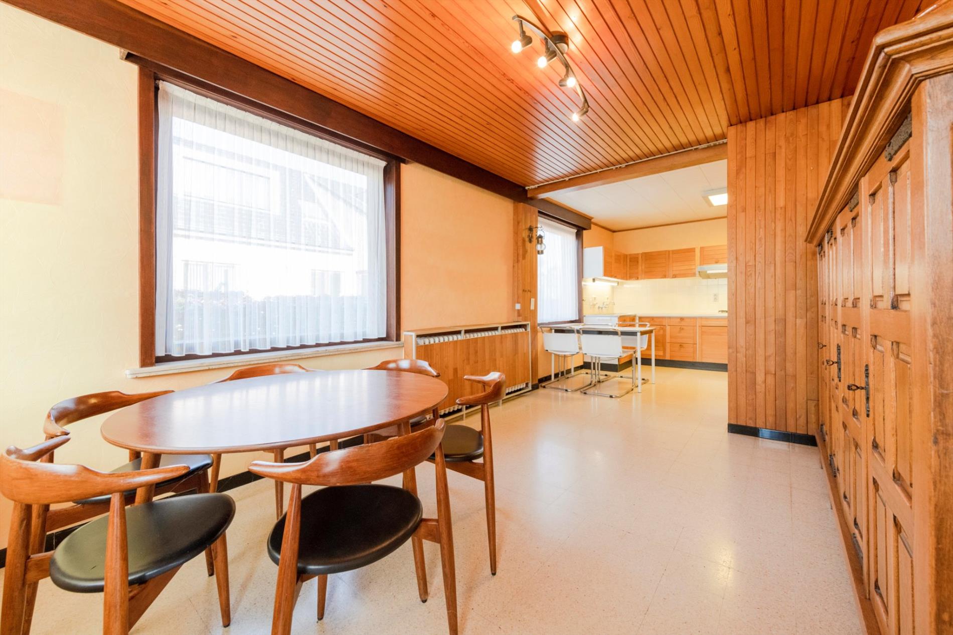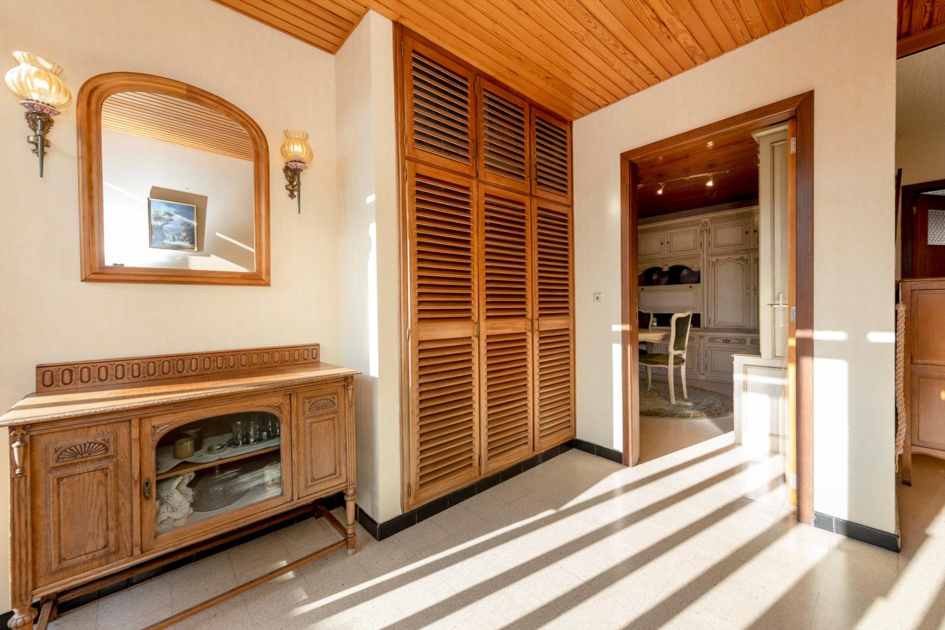 We komen binnen in een ruime inkomhal met gastentoilet die rechtstreeks toegang biedt tot de keuken, leefruimte en nachthall. De leefruimte (28m²) heeft grote raampartijen die voor natuurlijk lichtinval en een mooi zicht op de tuin zorgen. De leefruimte is tevens voorzien van een mooie schouw met houtcassette. Via de leefruimte hebt U toegang tot de ingerichte leef keuken (kookplaat | dampkap | dubbele spoelbak | oven | frigo) met ontbijthoek met een oppervlakte van maar liefst 33m² . Vanuit de keuken is er tevens toegang tot de veranda.