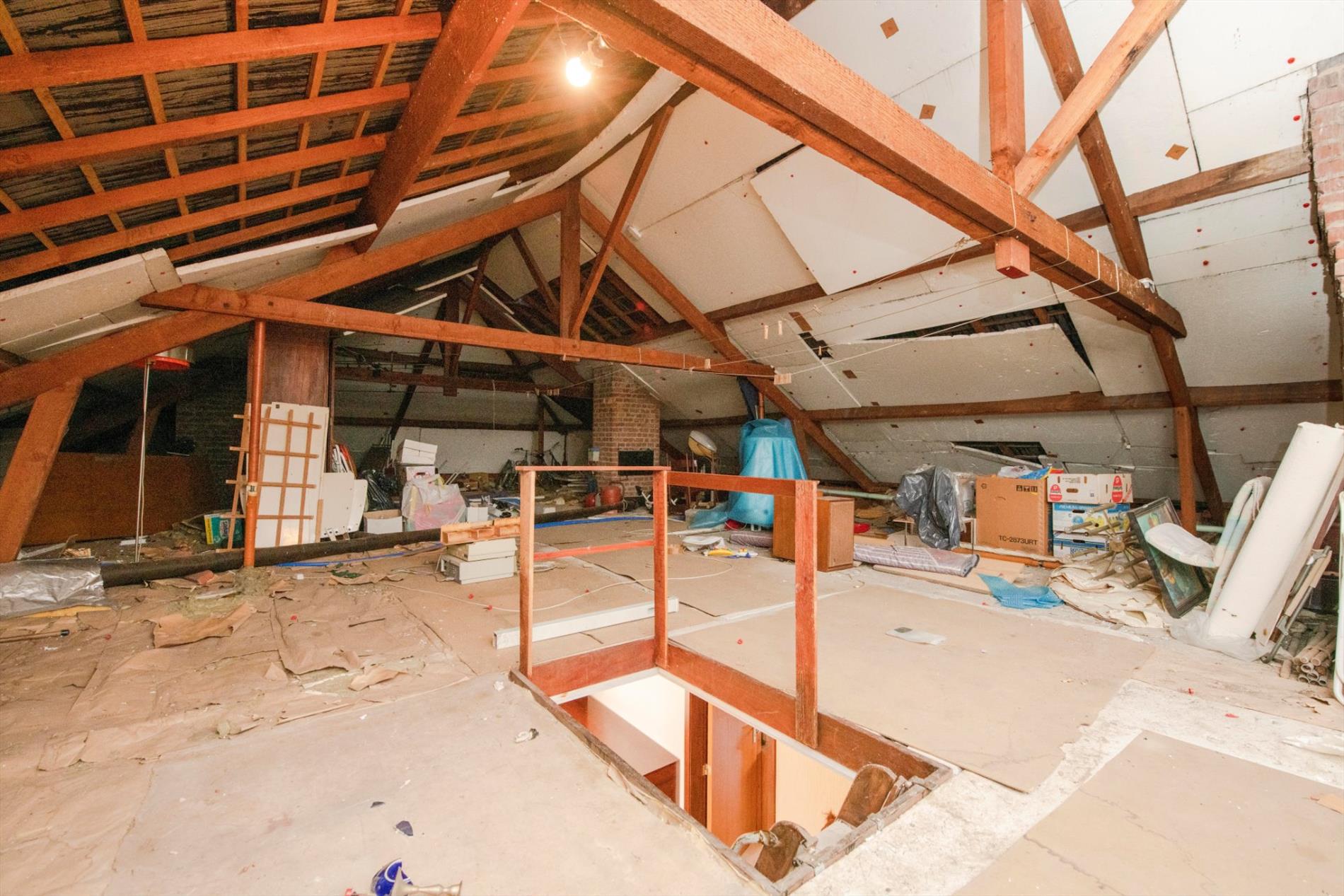 Het eerste verdiep is toegankelijk met een vouwtrap en omvat 126 m² en heeft een vrije hoogte van 1,80 m. Dit betreft een betonconstructie.