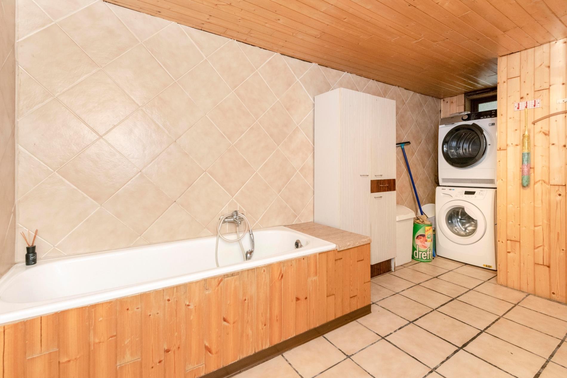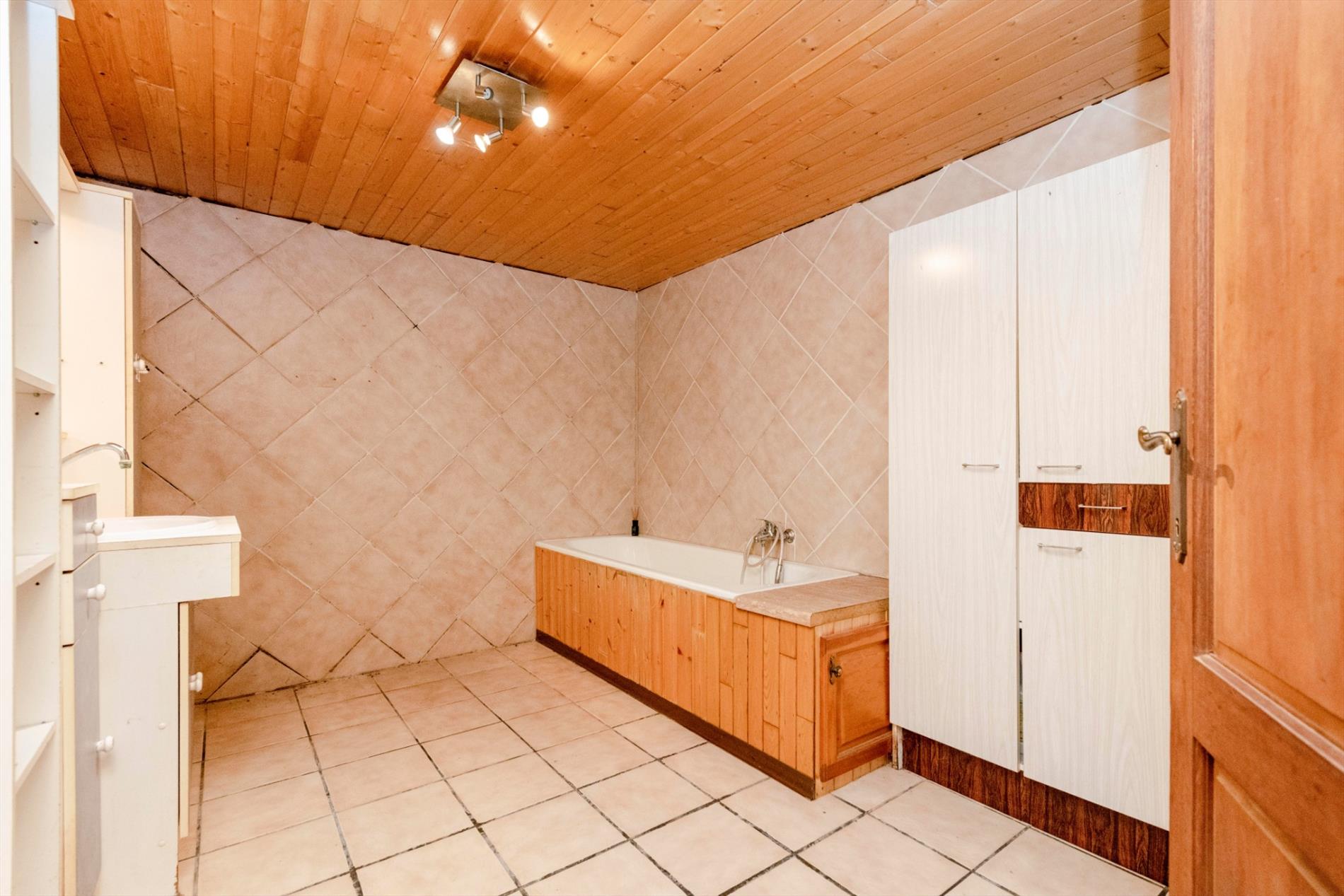 Vanuit de keuken is er toegang tot het gastentoilet alsook de ingerichte badkamer (bad | lavabo met meubel) met voorziening voor wasmachine en droogkast.
