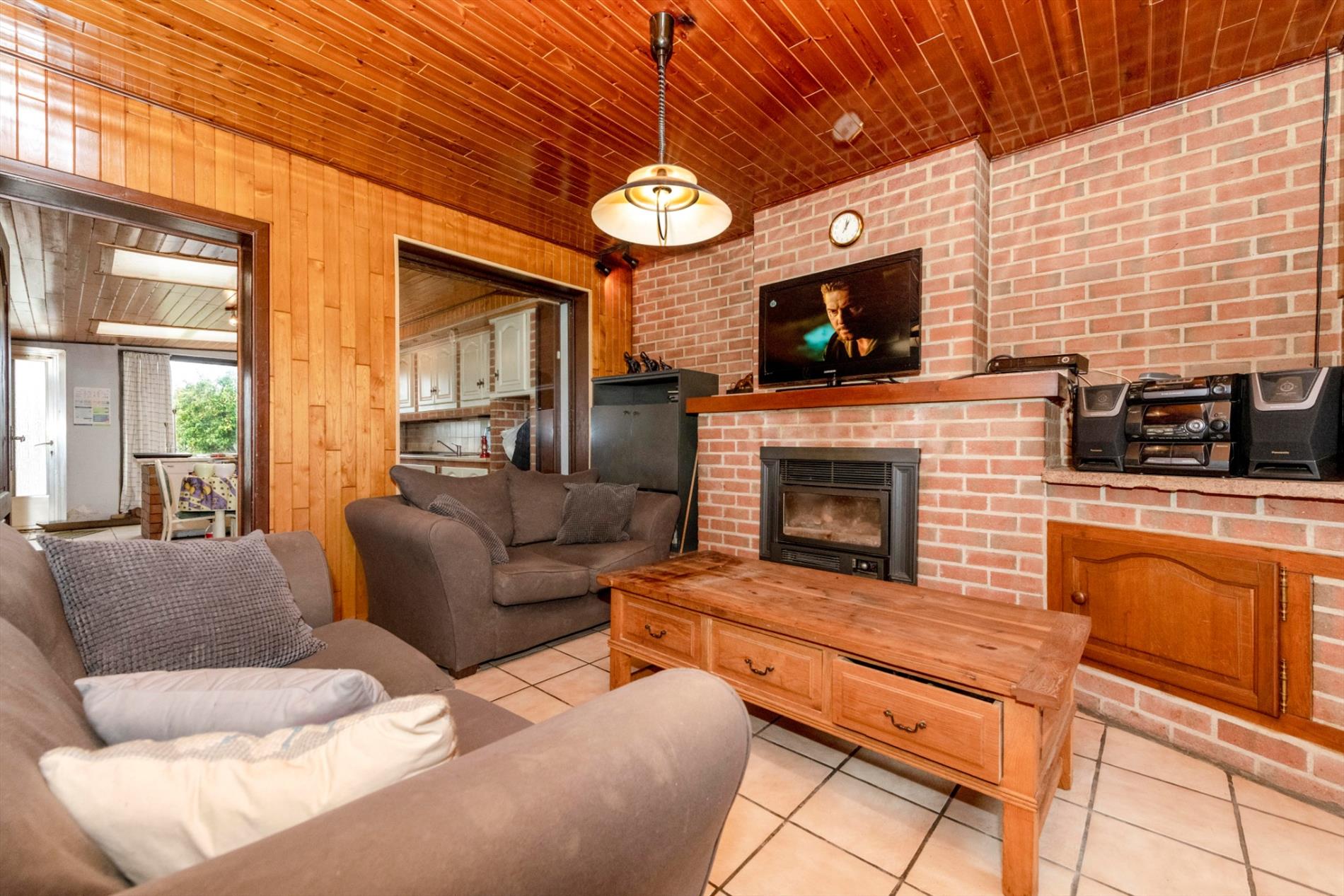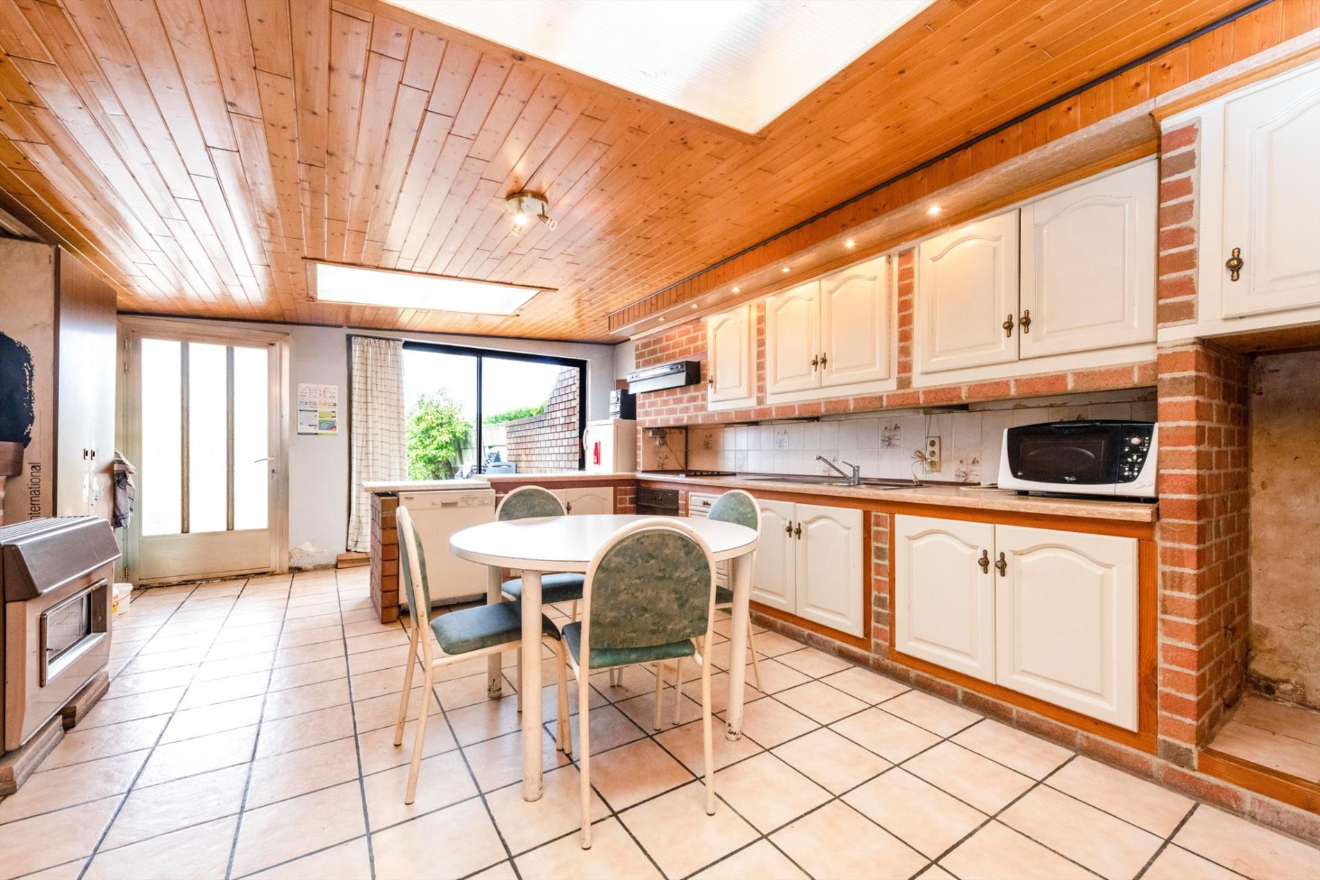 We komen binnen in de ruime leefruimte met zit-en eetplaats die rechtstreeks toegang biedt tot de keuken. De leefruimte heeft grote raampartijen die voor veel natuurlijk lichtinval alsook een open gevoel zorgen. De leefruimte is tevens voorzien van een mooie bakstenen wand met schouw en gezellige gaskachel.