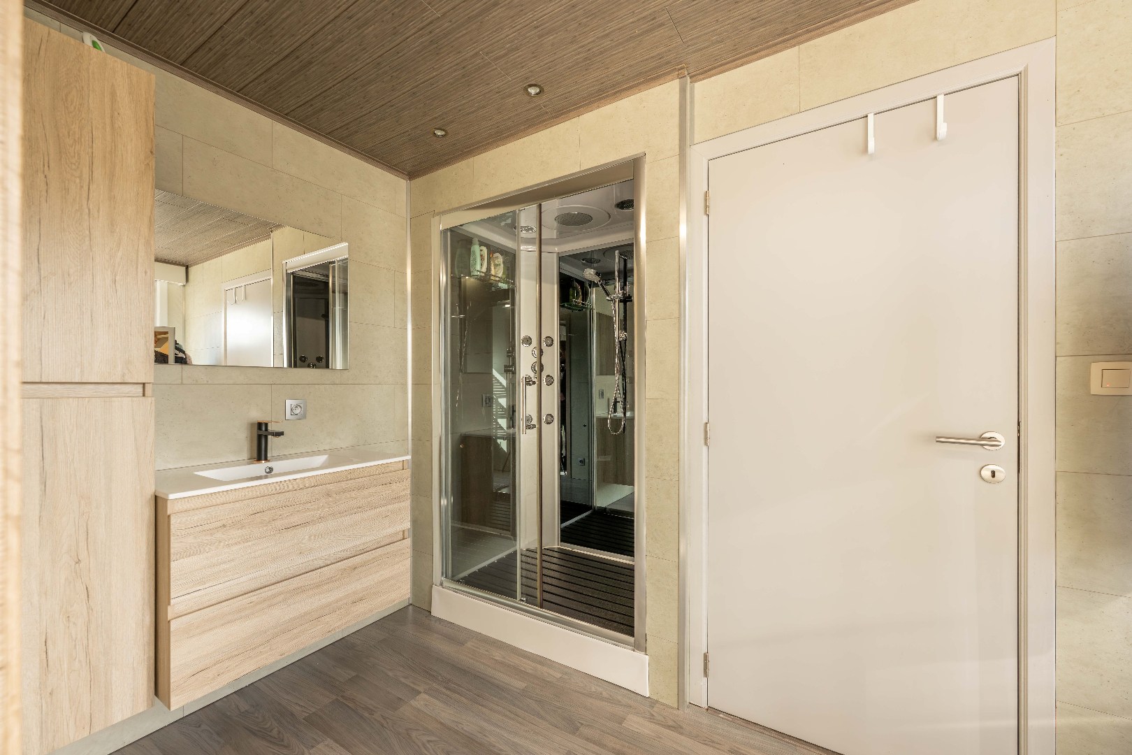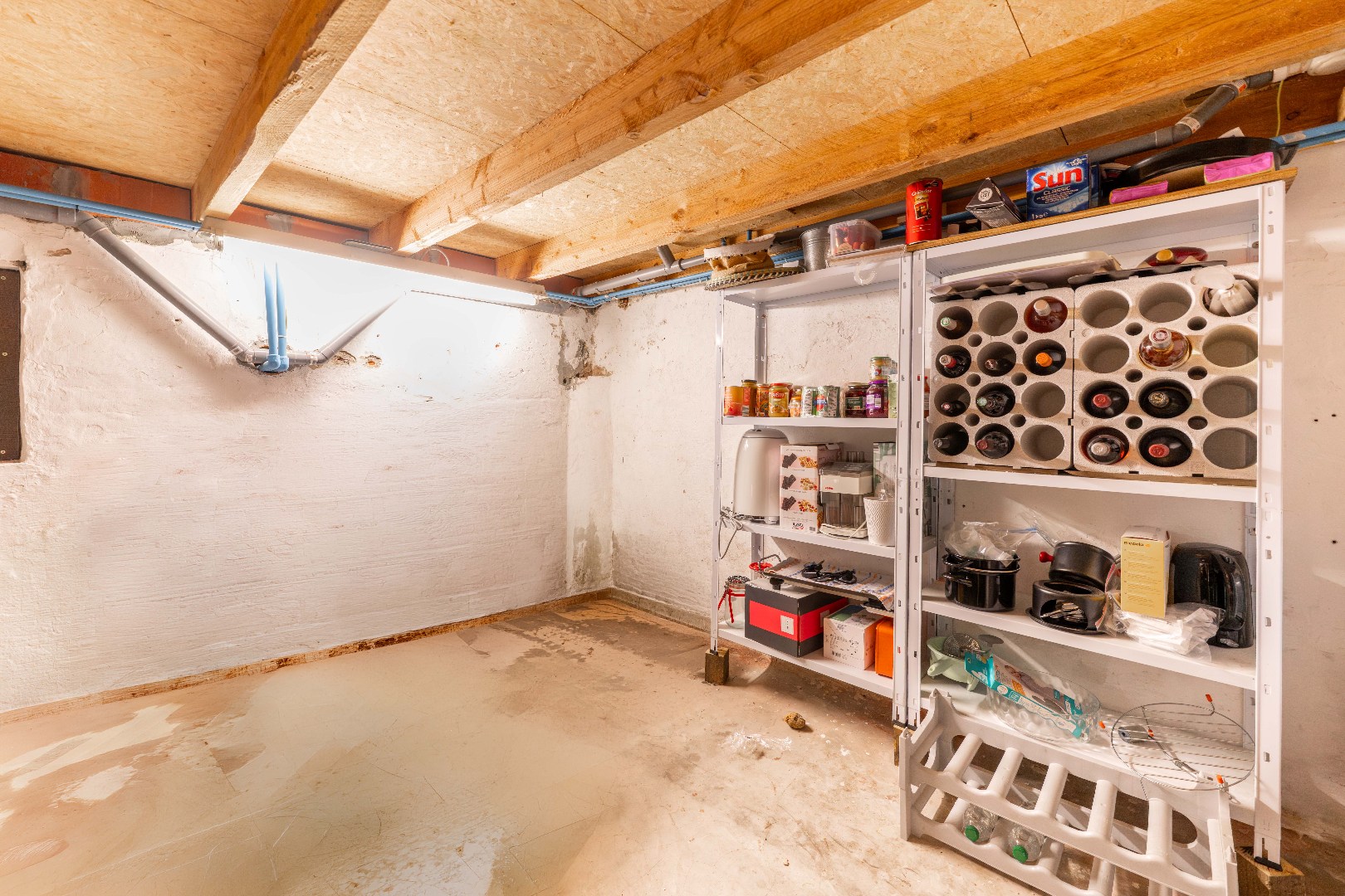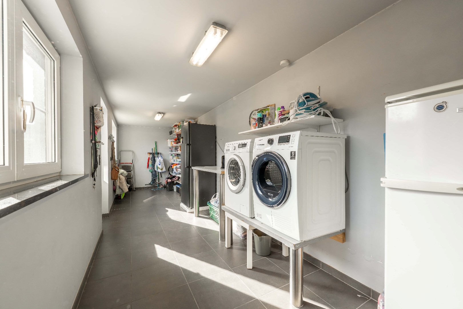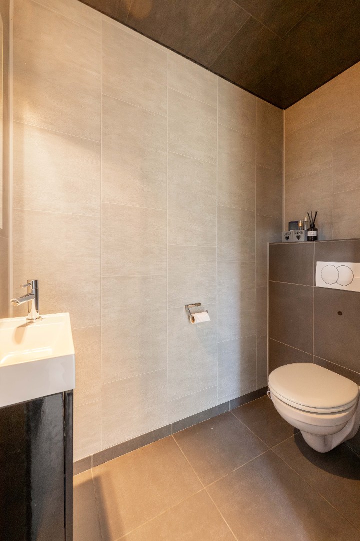 Verder is er op het gelijkvloers een gastentoilet met handwasser alsook een ruime wasplaats/berging/achterinkom alsook toegang tot de handig droge kelder.