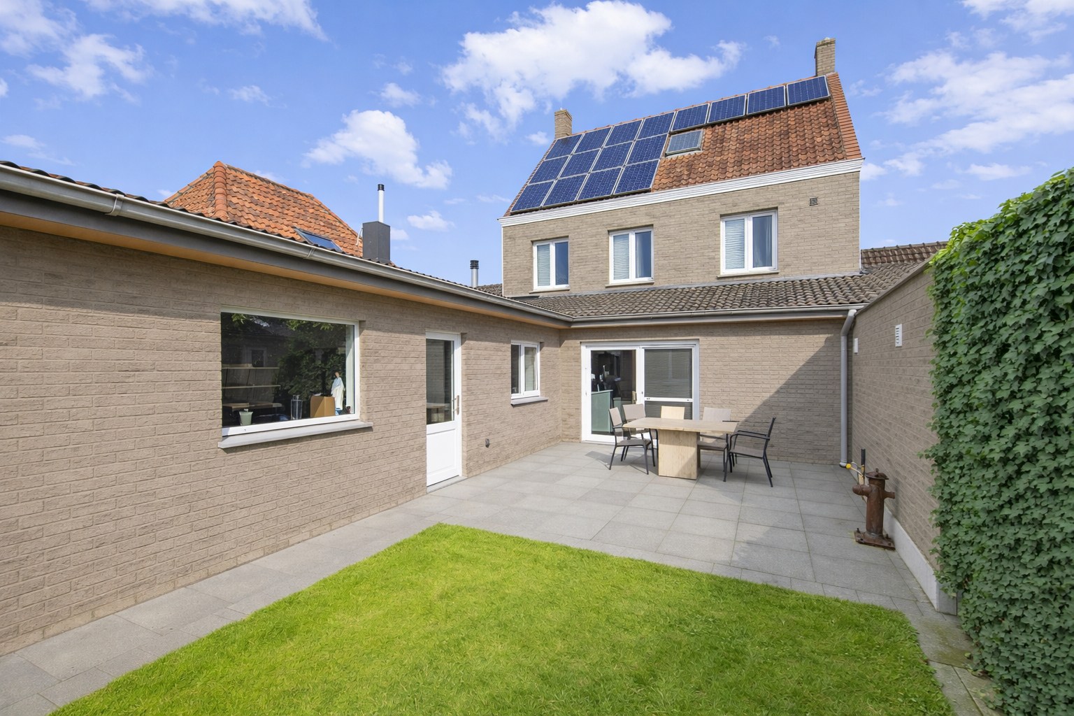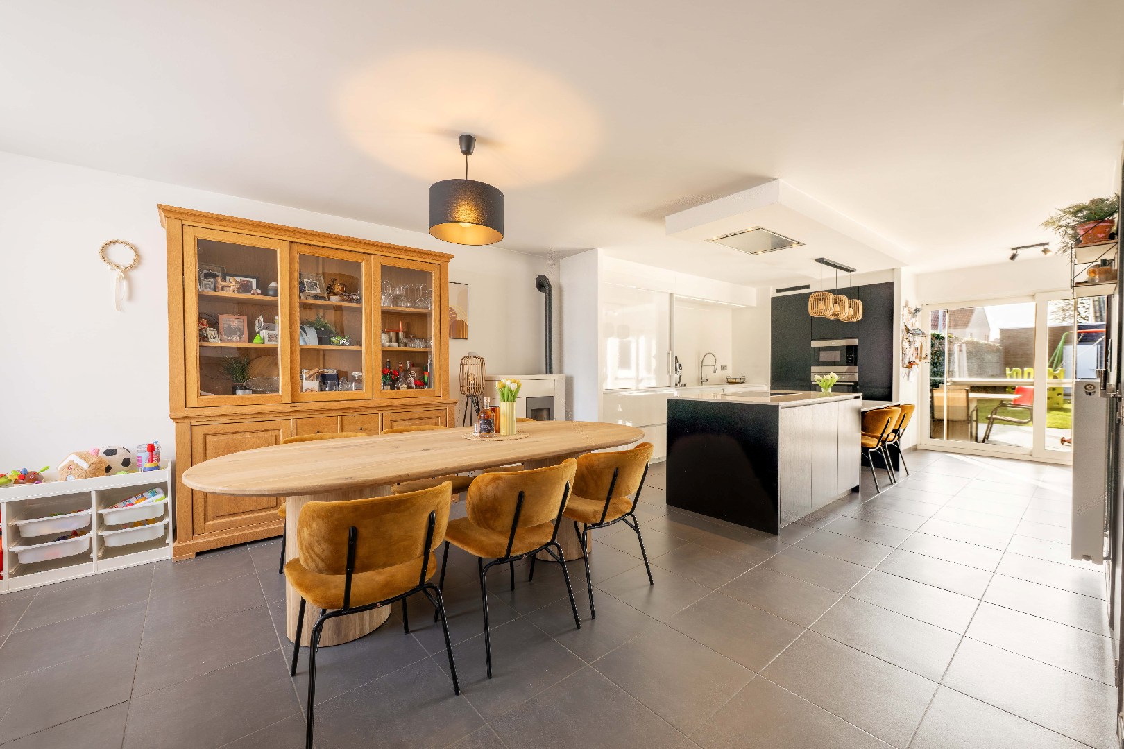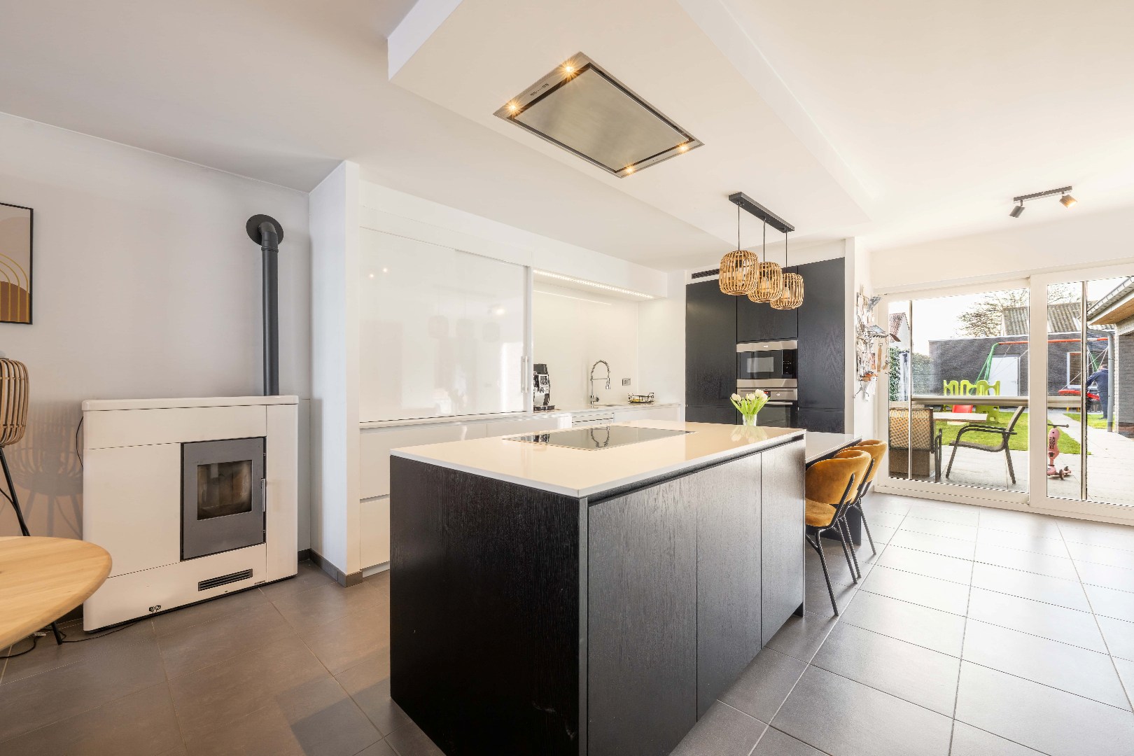 Vanuit deze leefruimte/keuken is er directe toegang via het schuifraam tot de tuin.
