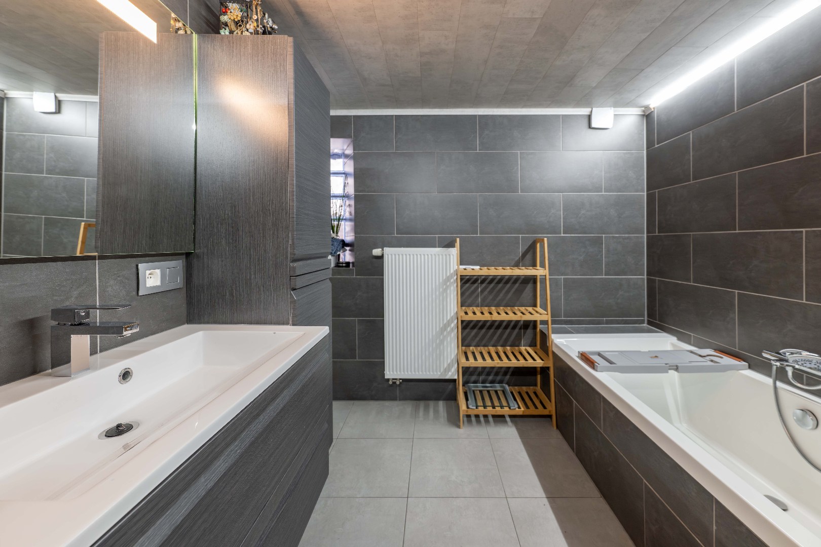 Het tussenverdiep is ingericht als éérste badkamer voorzien van een ligbad | inloopdouche | lavabo met meubel.